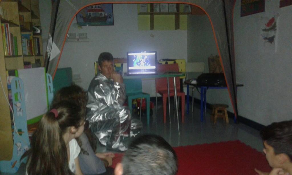 Ma soprattutto, nel buio della stanza, abbiamo proiettato un cielo stellato meraviglioso. Si! Un cielo stellato per davvero proprio sopra le nostre teste. E lì, tale è stato lo stupore e la curiosità, che ci siamo messi insieme a guardare come funzionavano le cose nel cosmo profondo!