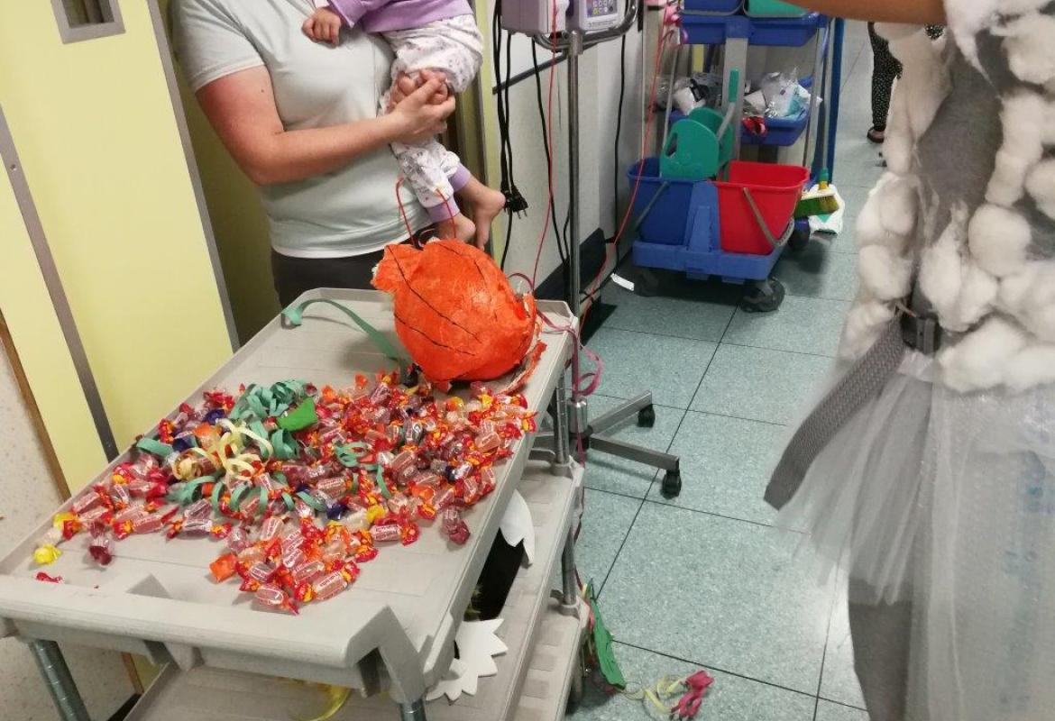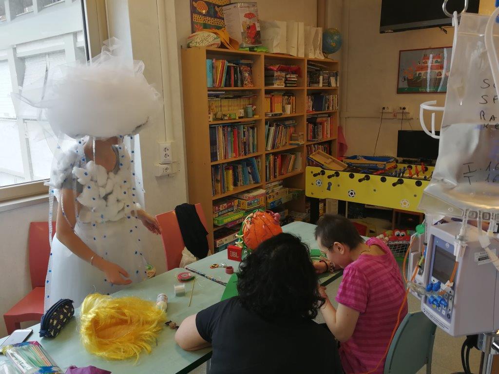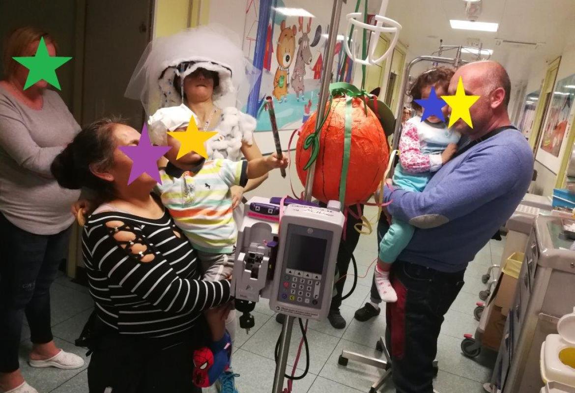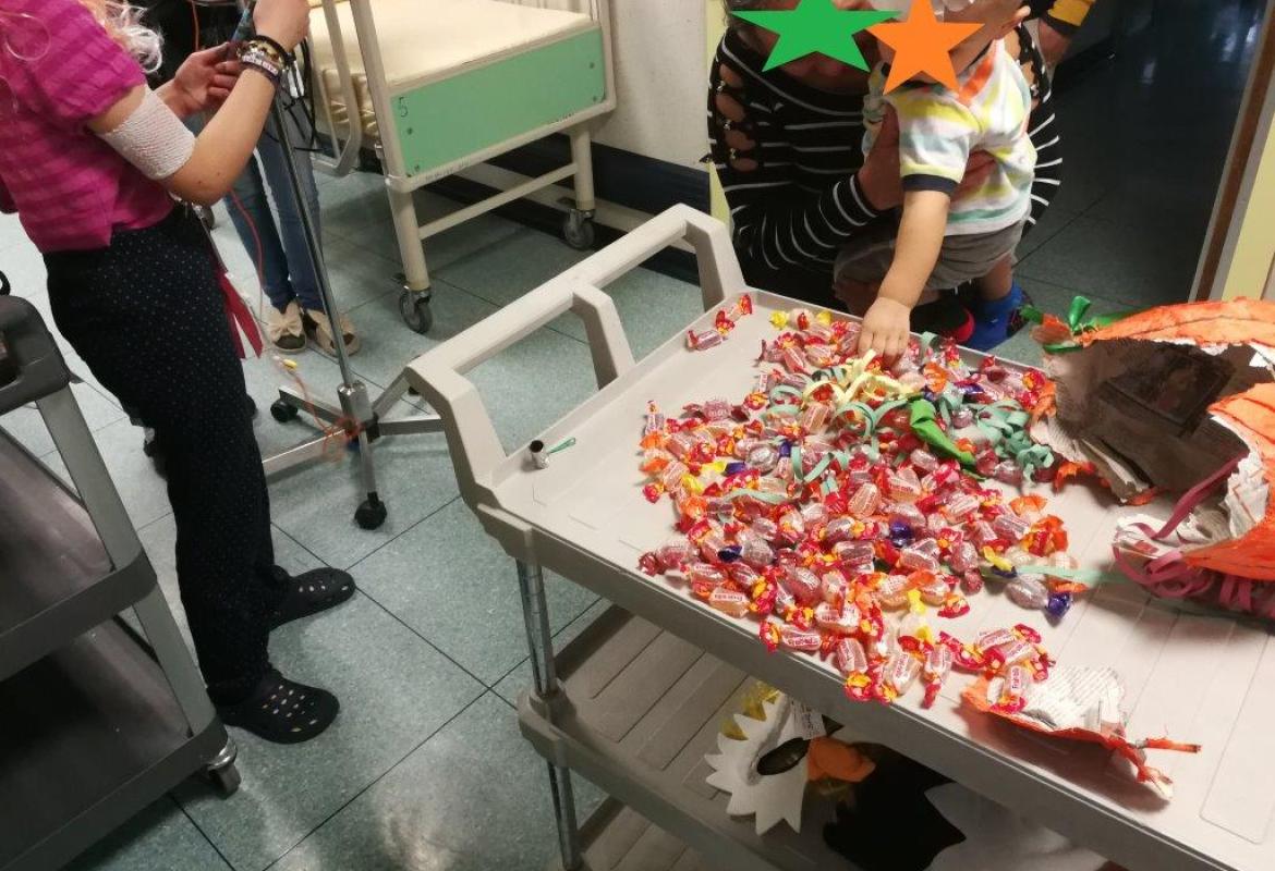 Si è da poco concluso il Carnevale con la festa di Martedì Grasso nel reparto di Oncologia Pediatrica e Neurochirurgia Infantile del Policlinico Gemelli. Mentre le ludoterapiste indossavano i costumi da Miss Uva e da Fata delle Nuvole, M. ha decorato e "farcito" di caramelle la pentolaccia (o pignatta o albero della cuccagna), preparata in anticipo nel fine settimana con pazienza e lentezza da Marta e Sofia, le "nuvolette" della Fata delle Nuvole.