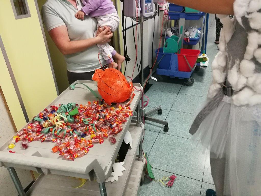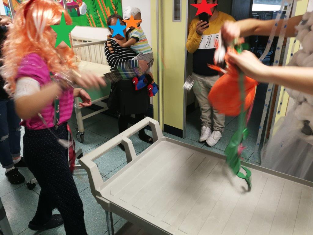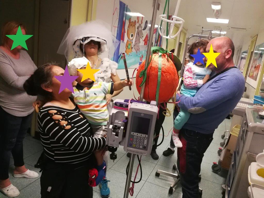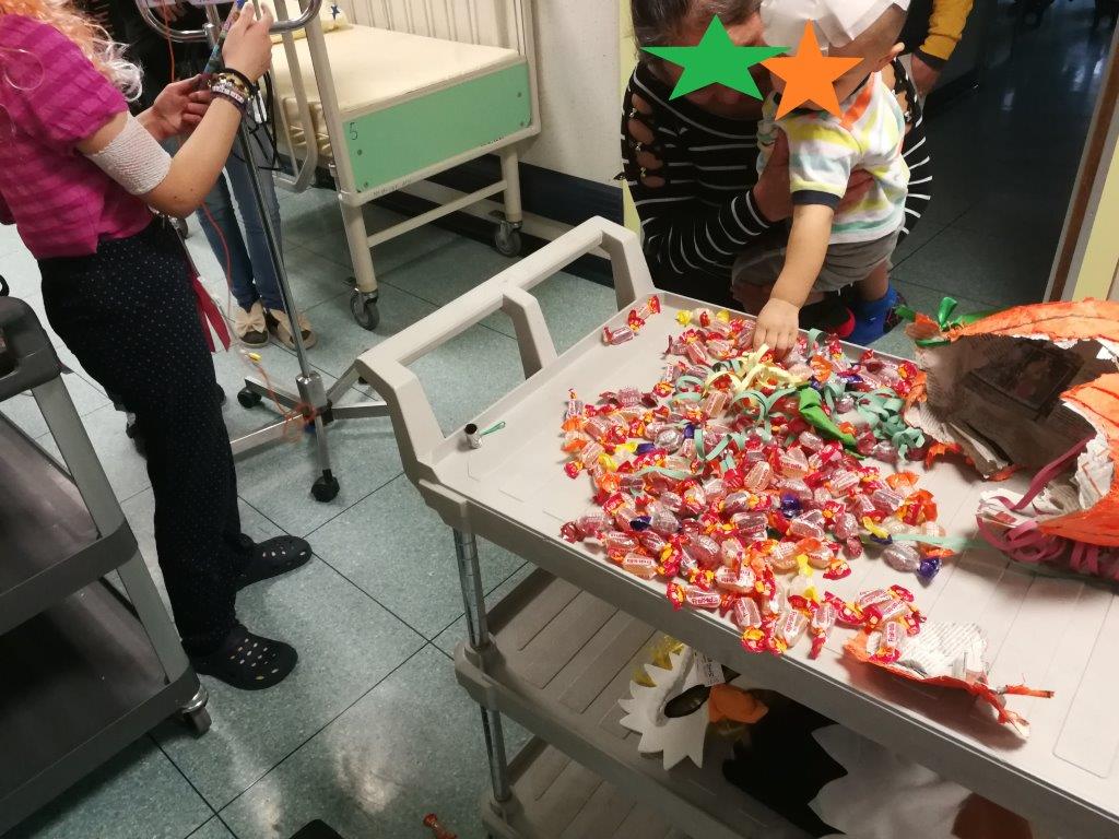 E naturalmente a turno tutti hanno colpito la pentolaccia a forma di zucca, appesa ad un carrello della flebo, fino a romperla e a svelare il tesoro. I festeggiamenti di Carnevale sono stati realizzati grazie alla raccolta fondi del Children's Day del 1° dicembre, organizzato dalla nostra amica Silvia Menichini.