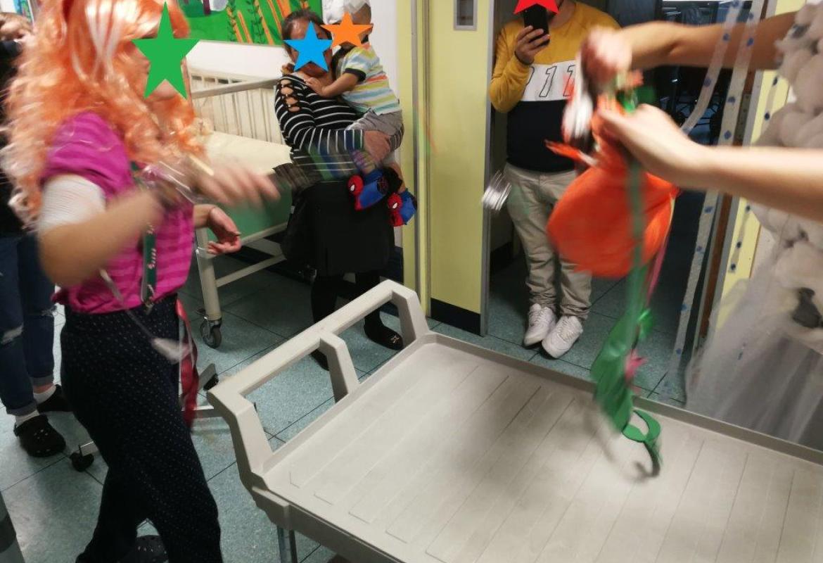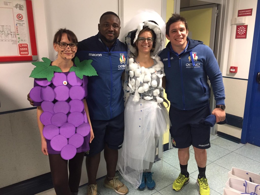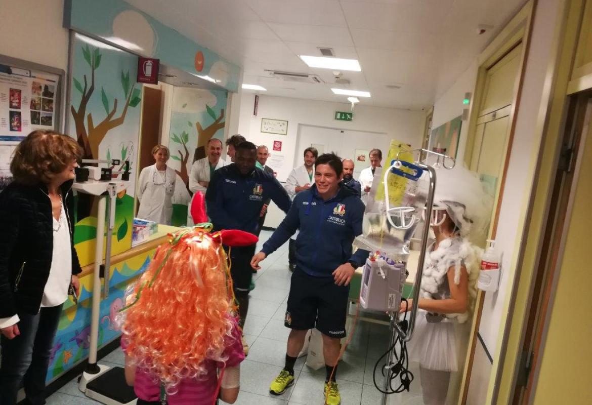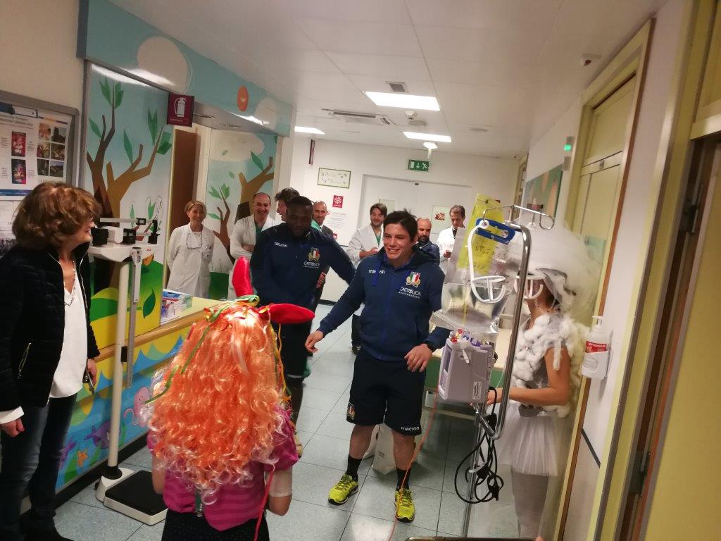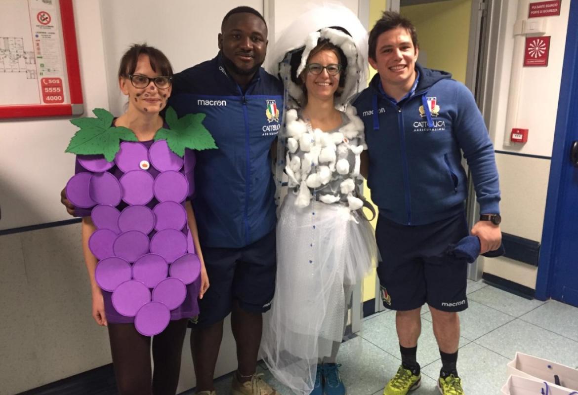 Ma una volta allestito il buffet e accesa la musica la festa è iniziata nel grande corridoio del reparto, coinvolgendo nei balli grandi e piccoli, medici e infermieri... e giocatori della Nazionale di Rugby, arrivati in reparto per incontrare i bambini grazie all'Associazione AGOP. Grazie a voi!
