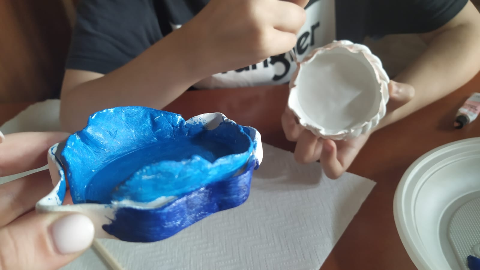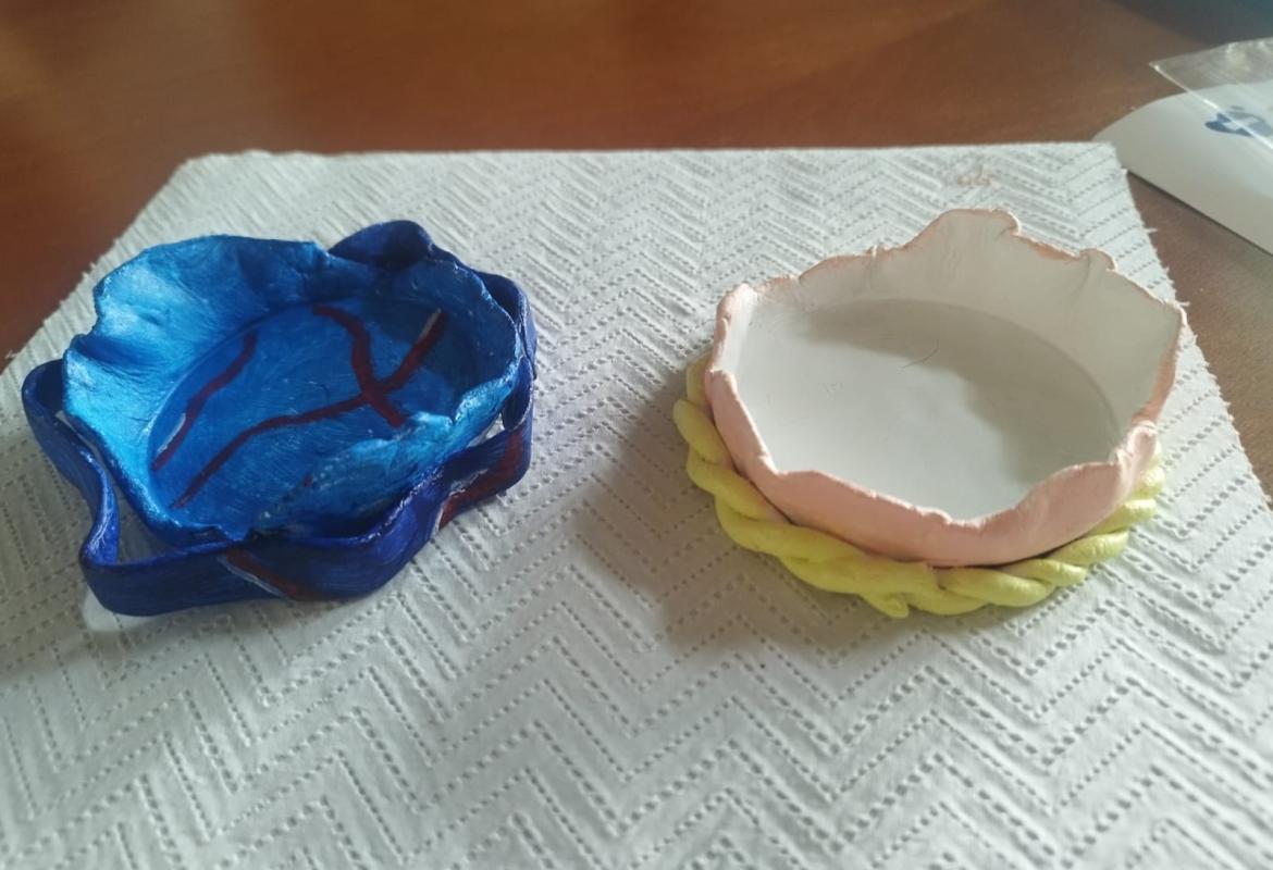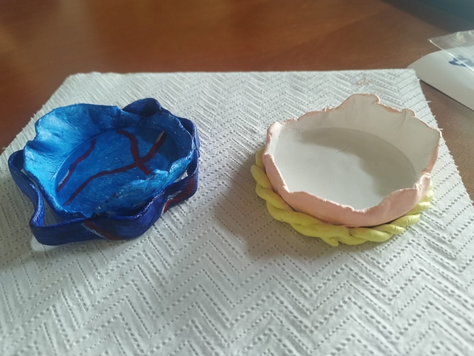 Erika ed L. hanno decorato gli svuota tasche che avevano creato con il das qualche tempo fa. Ognuna ha decorato lo svuota tasche dell'altra, in base a come è la sua personalità: L. ha una personalità più profonda e seria, quindi svuota tasche blu e rosso, Erika ha una personalità più frizzantina quindi svuota tasche rosa e giallo.