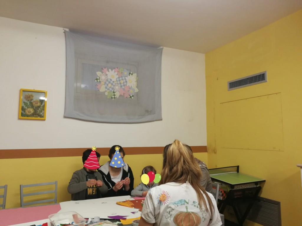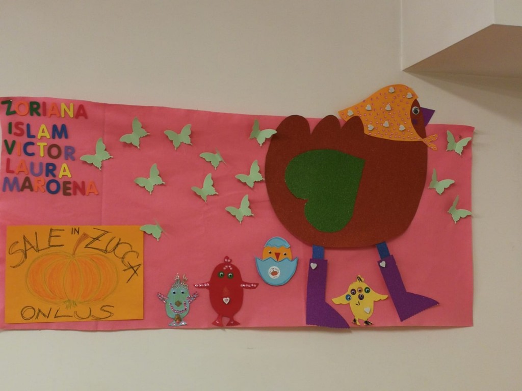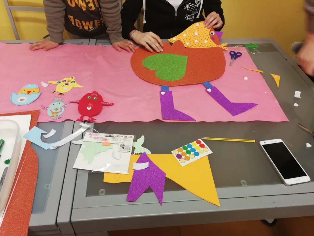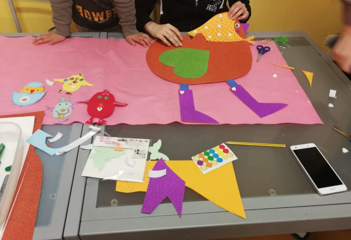 Pomeriggio colorato alla residenza Vanessa. Galline giganti fatte con cartoncino che finiscono...sulla parete!