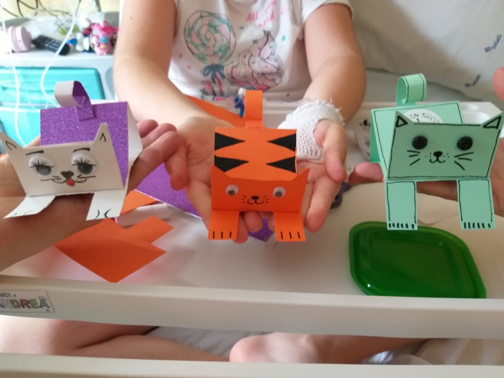 Era sabato 27 luglio, ad Ematologia pediatrica presso il Policlinico Umberto I di Roma. Dopo aver parlato per più di mezz'ora di gatti non potevamo non crearne di bellissimi. Grazie alla nostra piccola amica fanciulla, e a sua mamma, abbiamo costruito 3 amici tenerissimi. G. prima di iniziare ci aveva avvertito: "mi sto abituando all'ago cannula, oggi posso fare molte più cose" e noi siamo stati felicissimi di averle fatte con te e tua mamma!