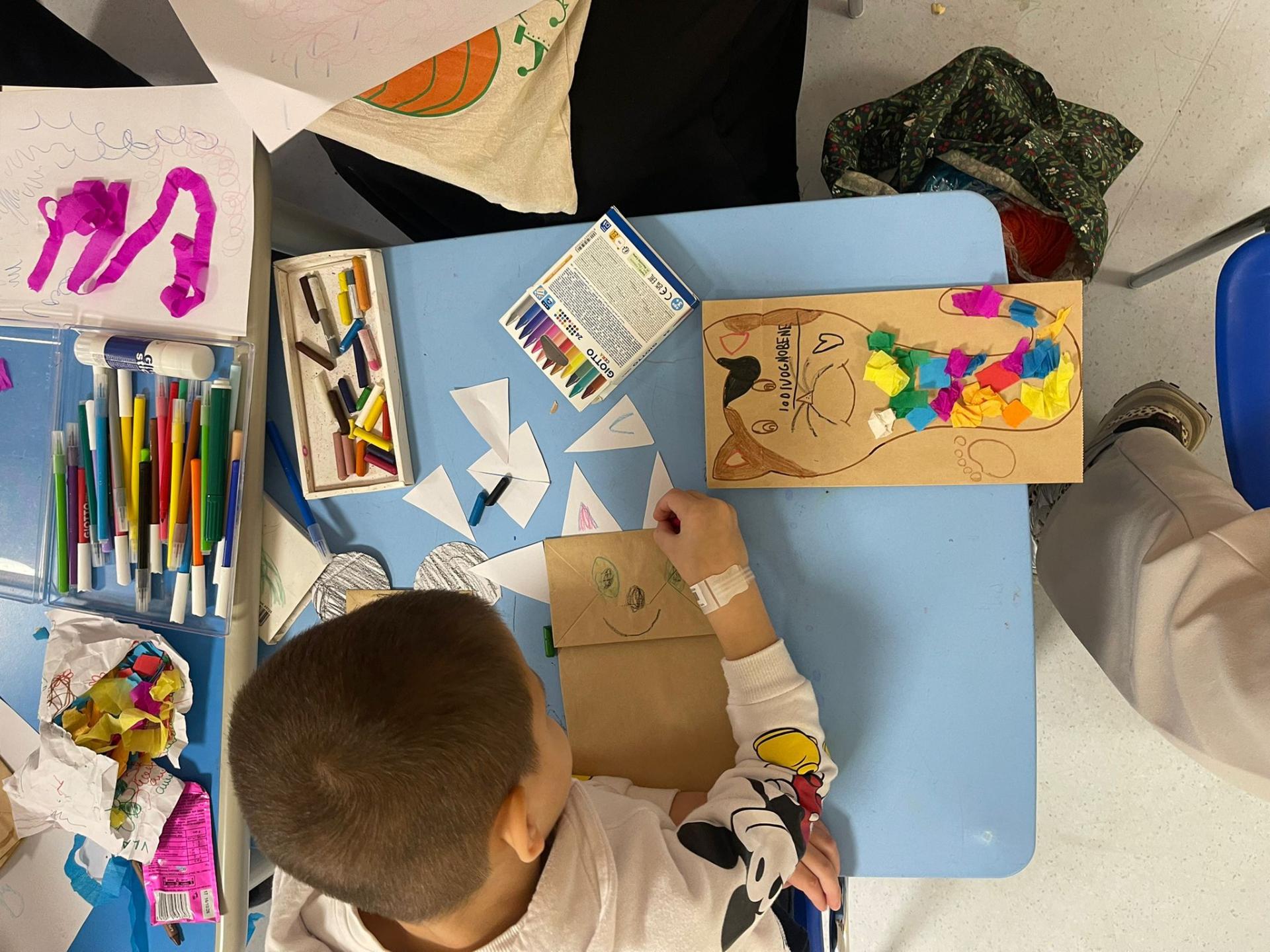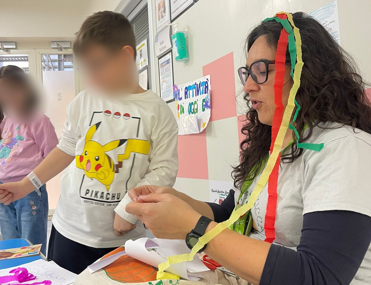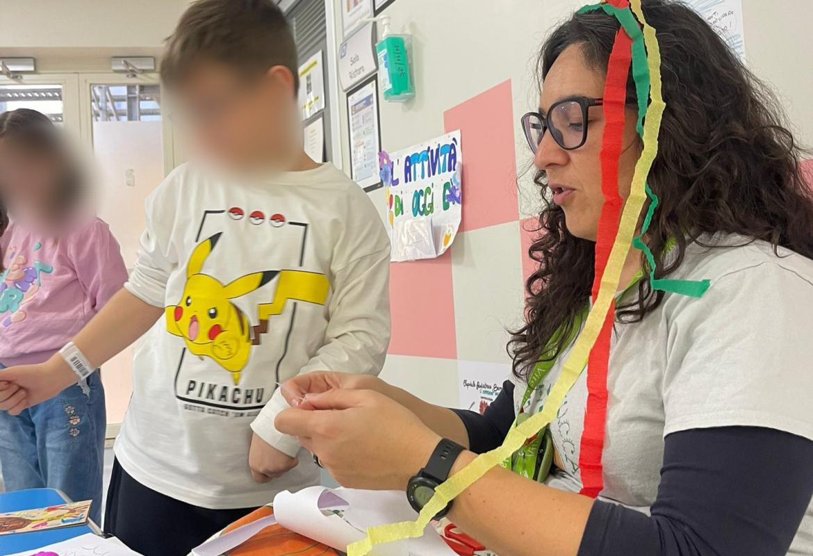 Oggi Corinna e Angelica hanno incontrato moltissimi bambini con cui hanno fatto decorazioni e disegni vari utilizzando colori e carta crespa. Corinna ha pensato di farsi delle extension colorate ai capelli che ai bimbi sono piaciute tantissimo!