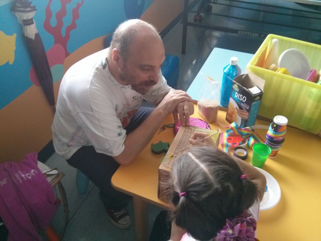 Ci troviamo nel reparto di Neurochirurgia Infantile del Gemelli. C'era una bimba triste ed un po' preoccupata, perché doveva essere operata il giorno dopo! Abbiamo pensato di farle passare un pomeriggio un po' speciale costruendo e decorando alcuni strumenti musicali: un tamburello fatto con dei piattini, una maracas con bicchieri di plastica e una buffa chitarra fatta con una scatola di cartone e degli elastici... che suonava davvero!