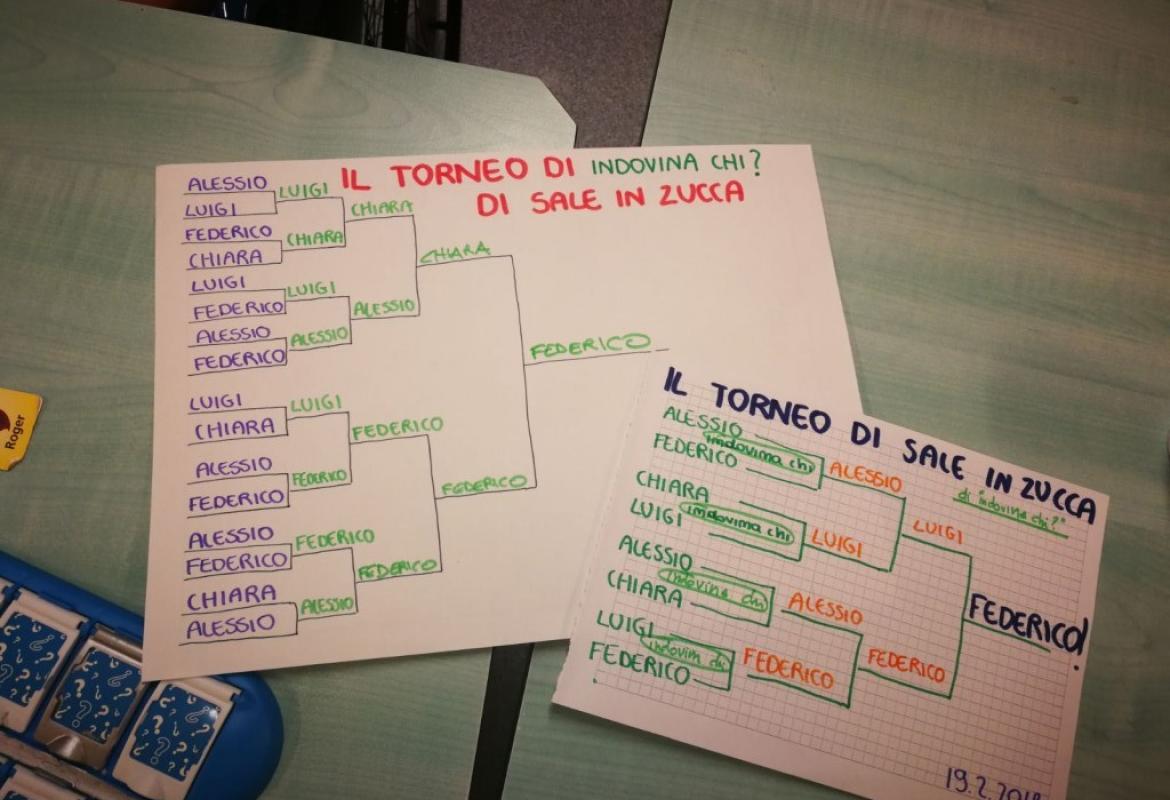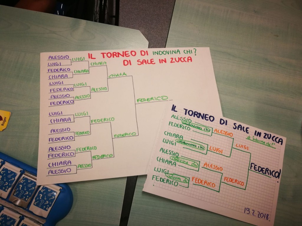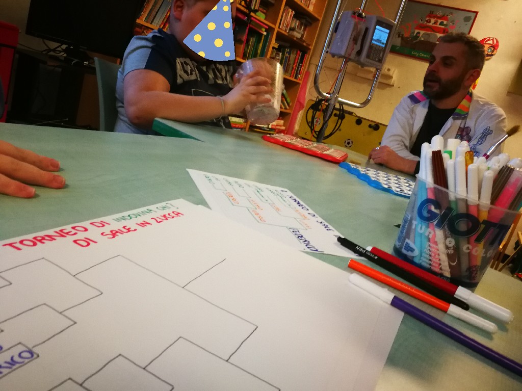 Pomeriggio di grande agonismo per i bambini dell'Oncologia Pediatrica del Gemelli. Dopo una breve fase di riscaldamento, abbiamo realizzato il tabellone del torneo di INDOVINA CHI?, con tanto di sorteggio con i biglietti nell'urna e cantando la sigla della championsleague (sempre di buon auspicio!).