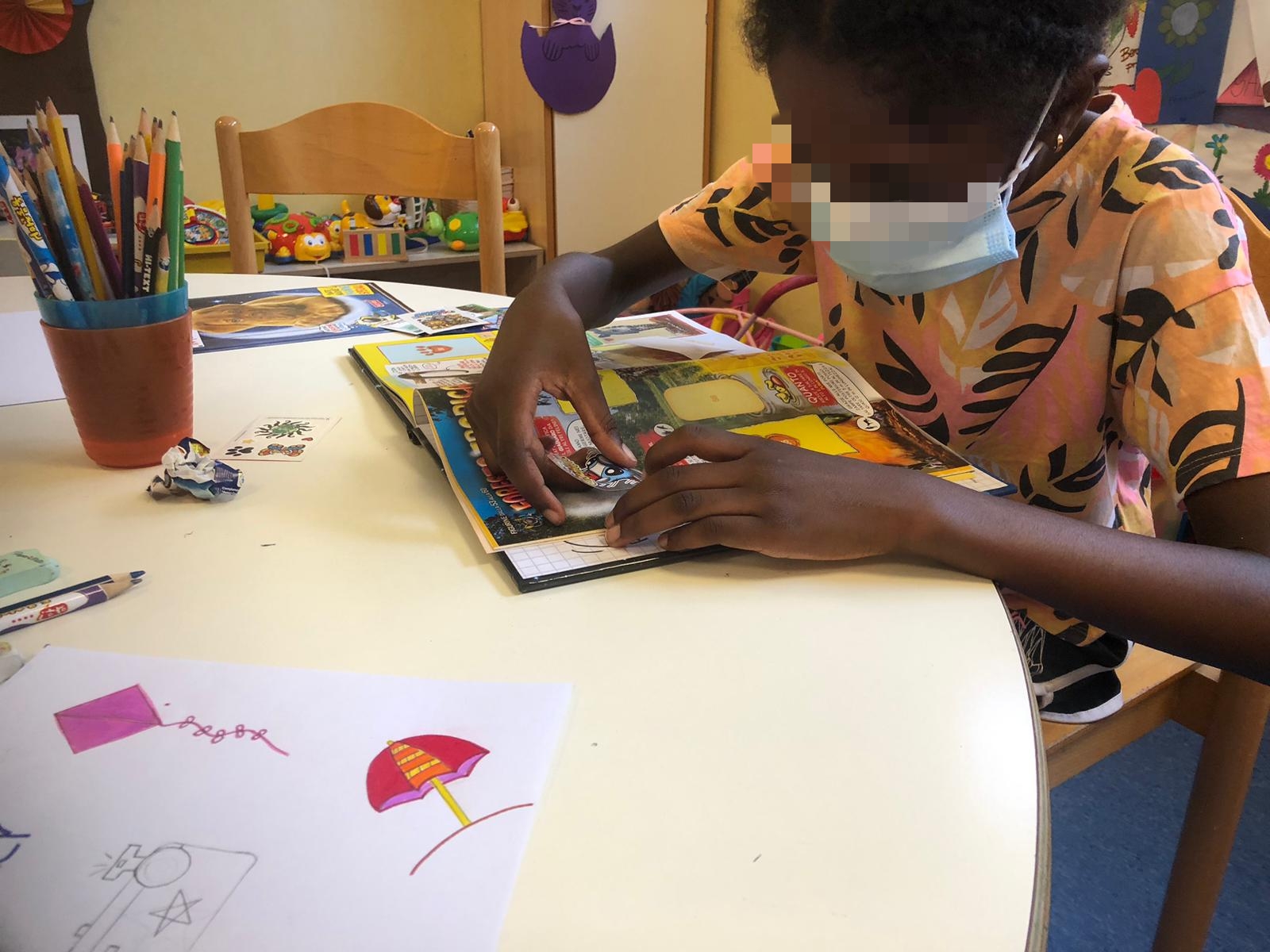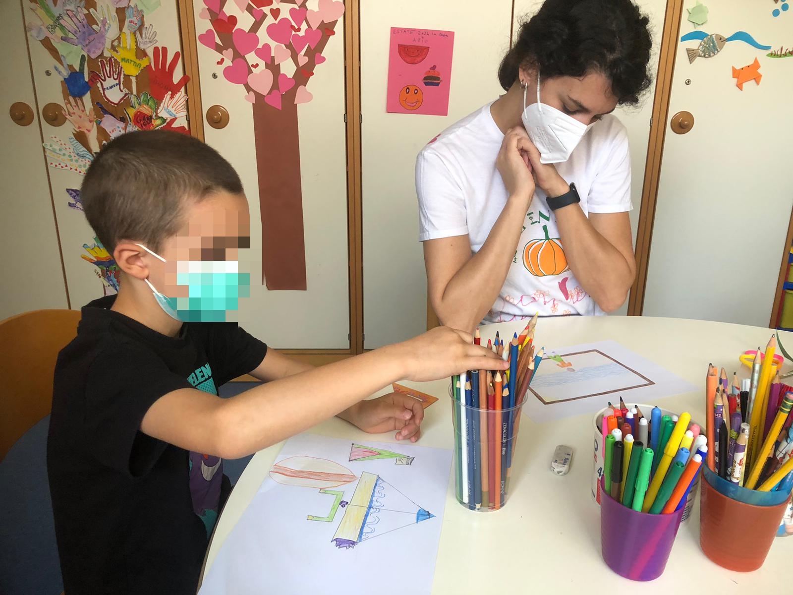 Il piccolo P. è entrato in sala giochi e ha iniziato a raccontare un viaggio che ha fatto in un posto lontano; quindi, hanno deciso di prendere dei fogli e dei colori e disegnare ciò che questo racconto aveva evocato in ognuno di loro.