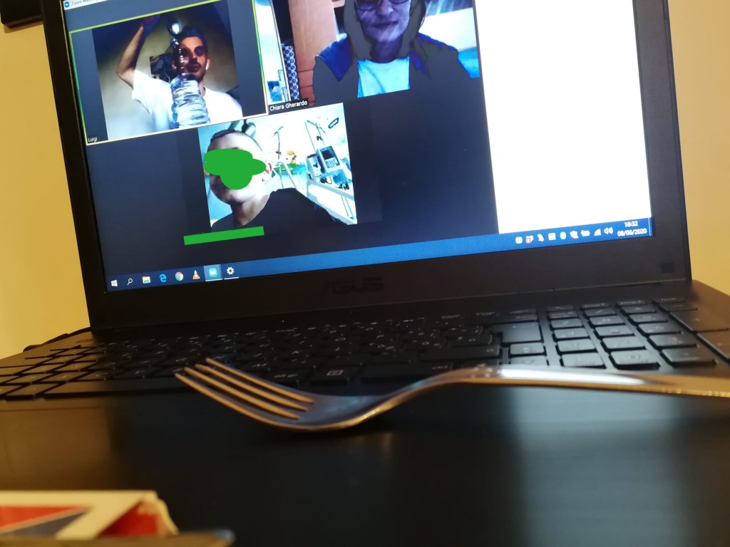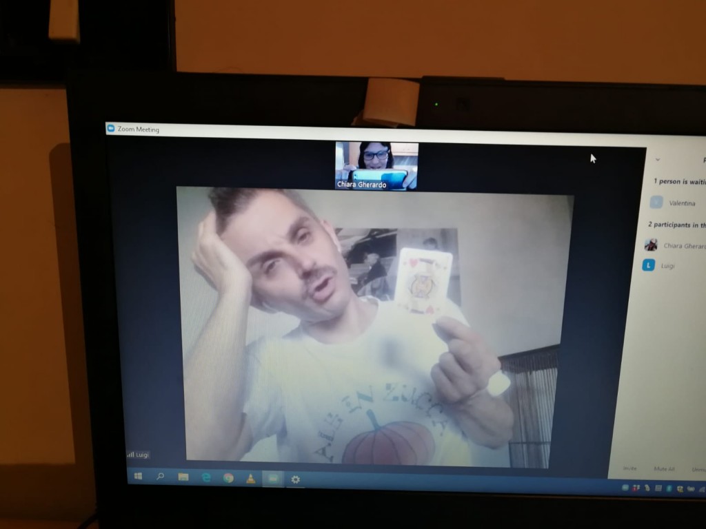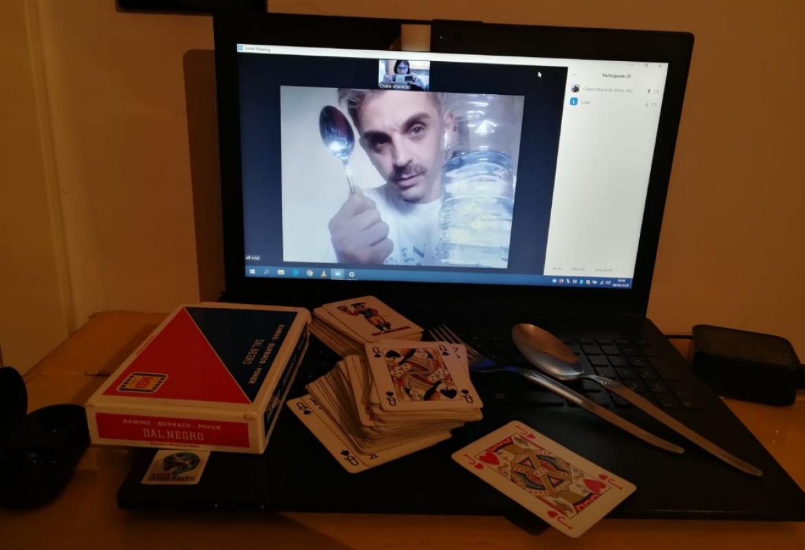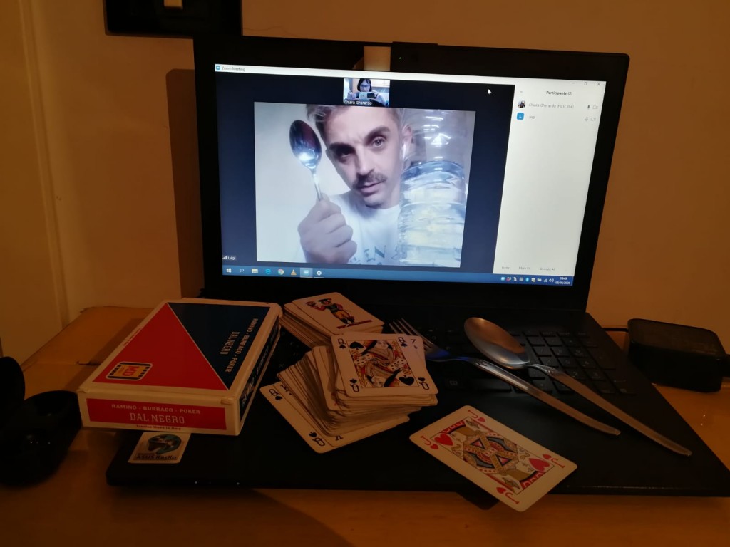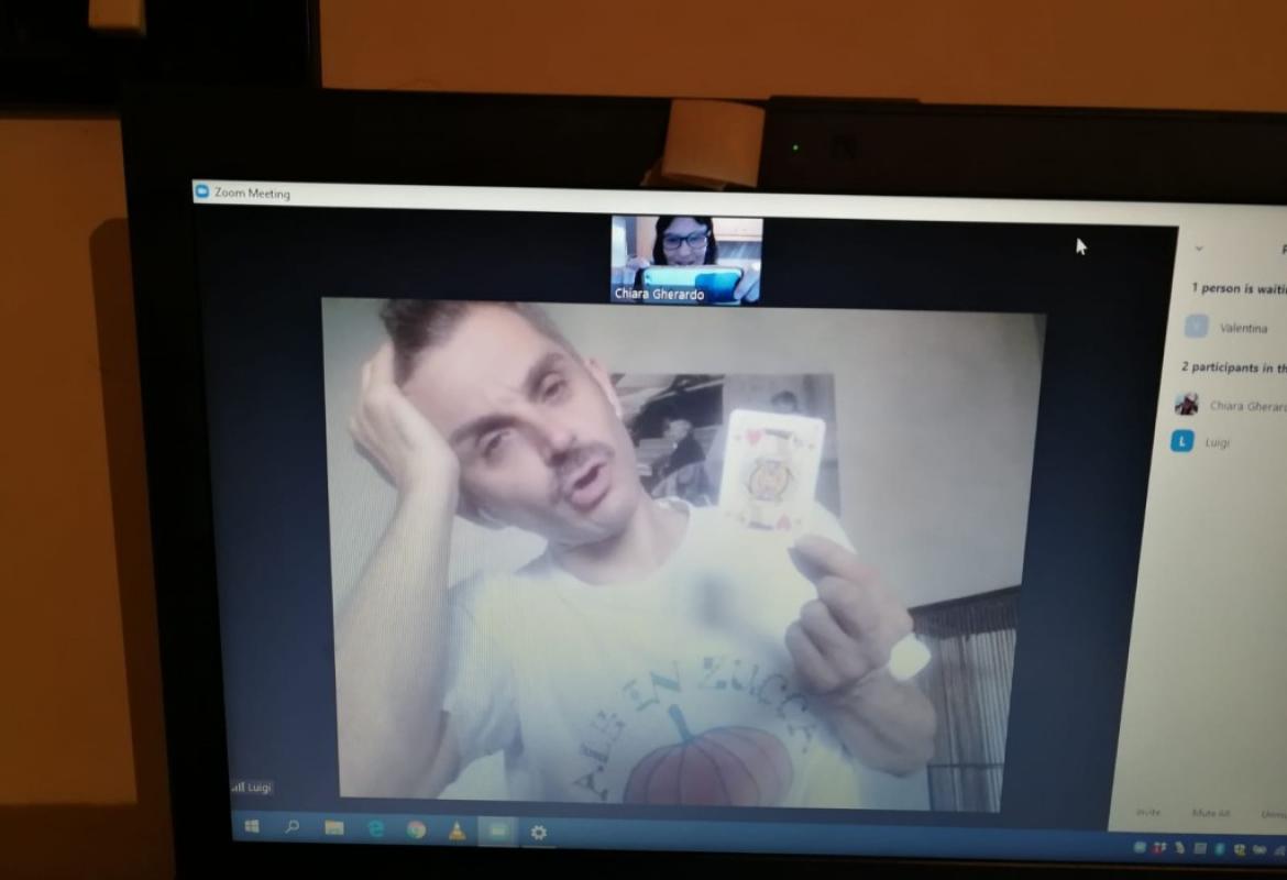 Dopo aver perfezionato i trucchi di magia dell'incontro ludoterapia a distanza, parte la chiamata Zoom e appare il piccolo G. 3 anni, dal reparto di Oncologia pediatrica del Gemelli, insieme alla sua mamma. E tra una bottiglia piena d’acqua, oggetti che Luigi e Chiara si sono "passati" da schermo a schermo, apparentemente troppo grandi per entrare nella bottiglia, il soffio del piccolo G. ha aiutato a creare una vera e propria magia facendo entrare nella bottiglia una forchetta, un cucchiaio e una carta da gioco.