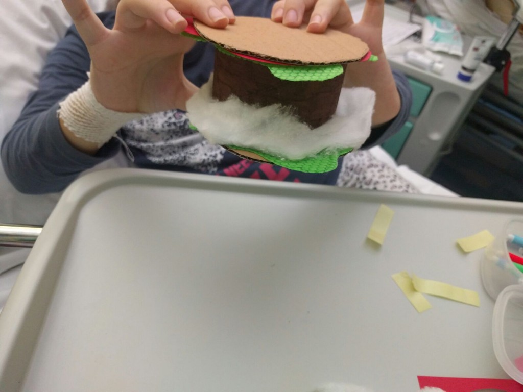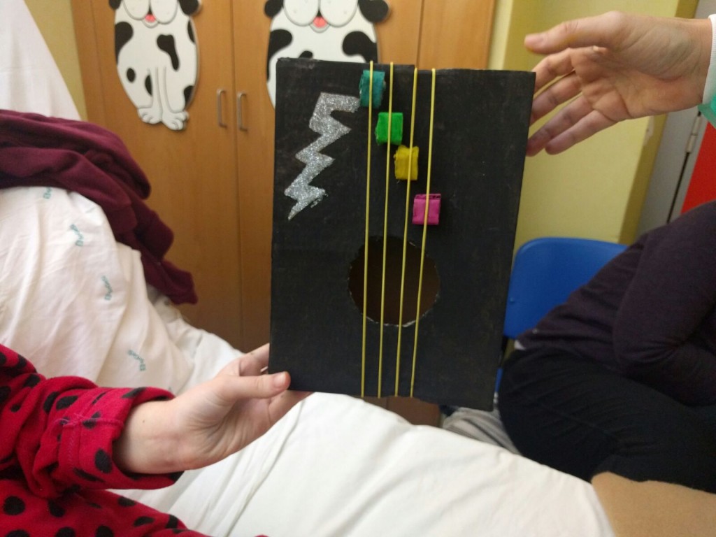 Ieri ad ematologia pediatrica del policlinico Umberto I c'erano due bambine che avevano fame; una di cibo, l'altra di musica. E per questo che abbiamo costruito un panino e una chiatarra! I nostri strumenti sono poveri, carta, cartoncino, forbici e scotch, ma il divertimento, nostro e delle bambine, è assicurato!