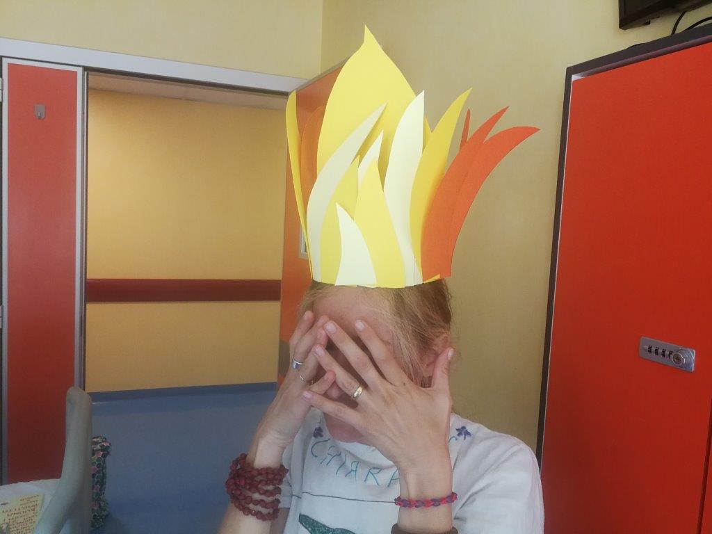 Un sabato pomeriggio L. aveva la nausea, e quindi poca voglia di giocare. Ci ha tenuto però a precisare alle ludoterapiste Chiara& Chiara che, se volevano, potevano restare in stanza a costruire qualcosa per lui! E così, aiutate dal compagno di stanza ventenne e dalla sua mamma, hanno realizzato con i cartoncini una parrucca da Dragonball! L. è stato molto soddisfatto!
