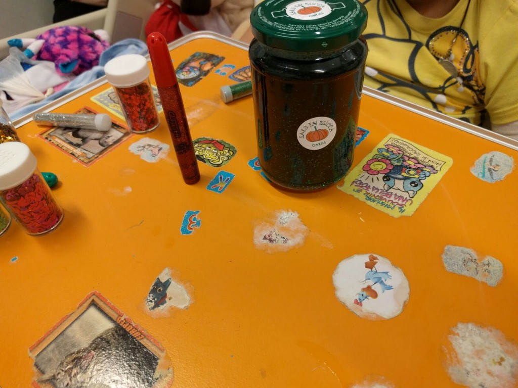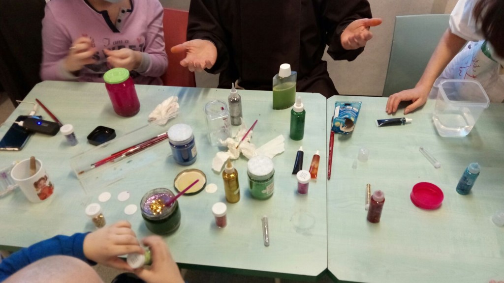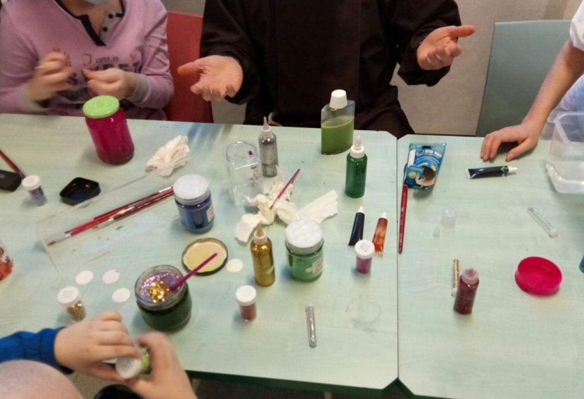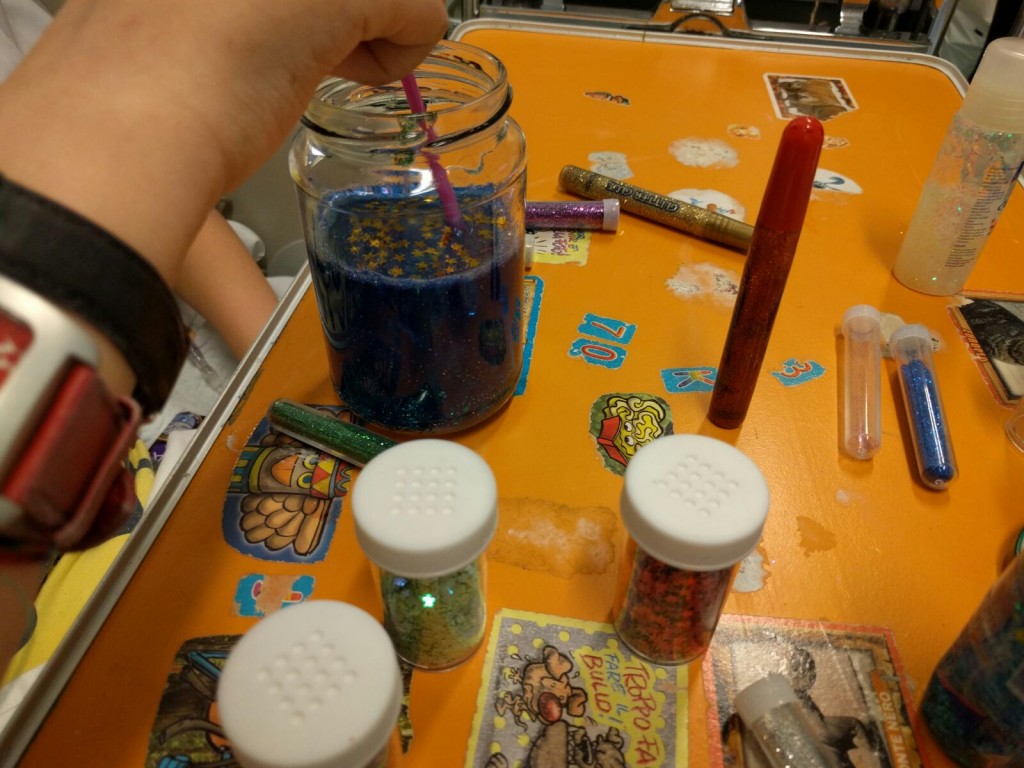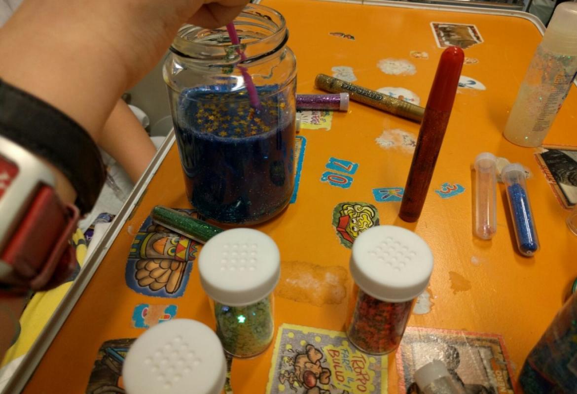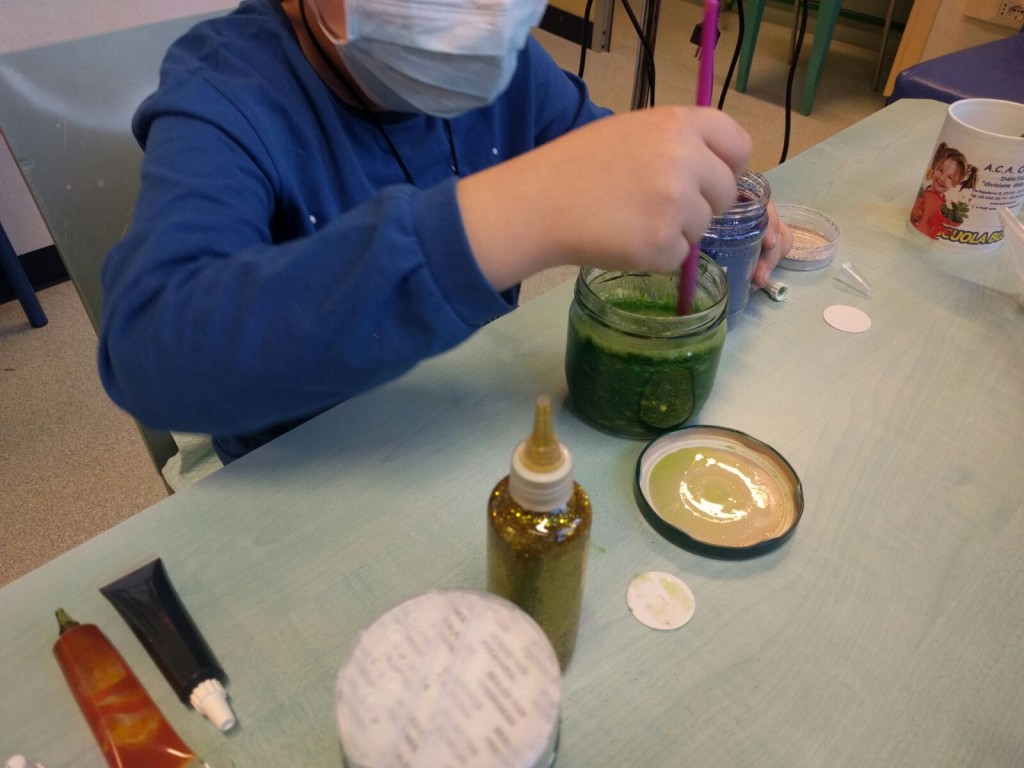 Con i bambini del reparto di oncologia pediatrica del Gemelli abbiamo scoperto l'acqua calda! O meglio, abbiamo osservato cosa succede se mescoliamo, nell'acqua calda, combinazioni di colla glitter, brillantini, colorante alimentare e piccole decorazioni. Alla fine, il risultato più interessante per i nostri piccoli chimici è stato il...barattolo della calma! A seguire, pizza per tutti!