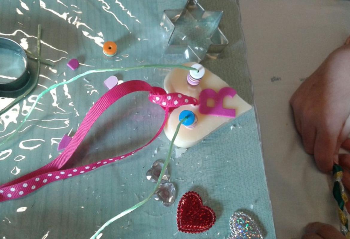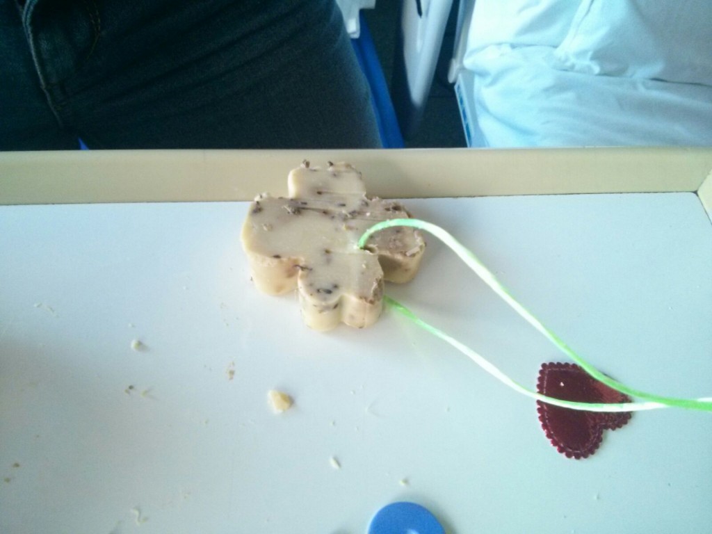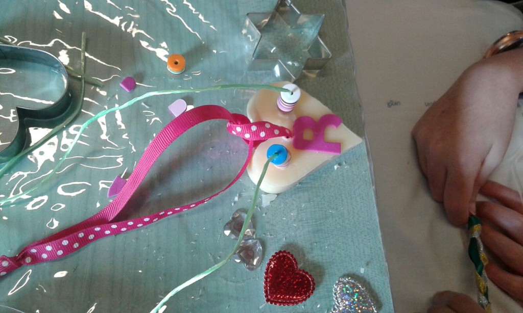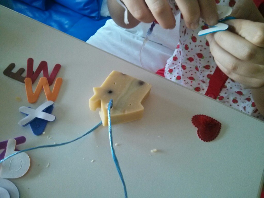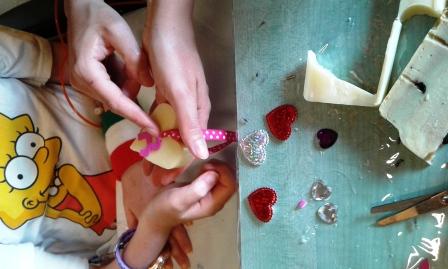 Ma coloro che hanno usufruito del laboratorio, in ludoteca o nella stanza di degenza, hanno prodotto i manufatti riprodotti nelle foto. Siamo stati anche aiutati da una delle mamme, cui ha giovato molto il pomeriggio ludico. Due sorelle, una delle quali ricoverata, insieme hanno realizzato delle saponette da regalare ai fidanzati.