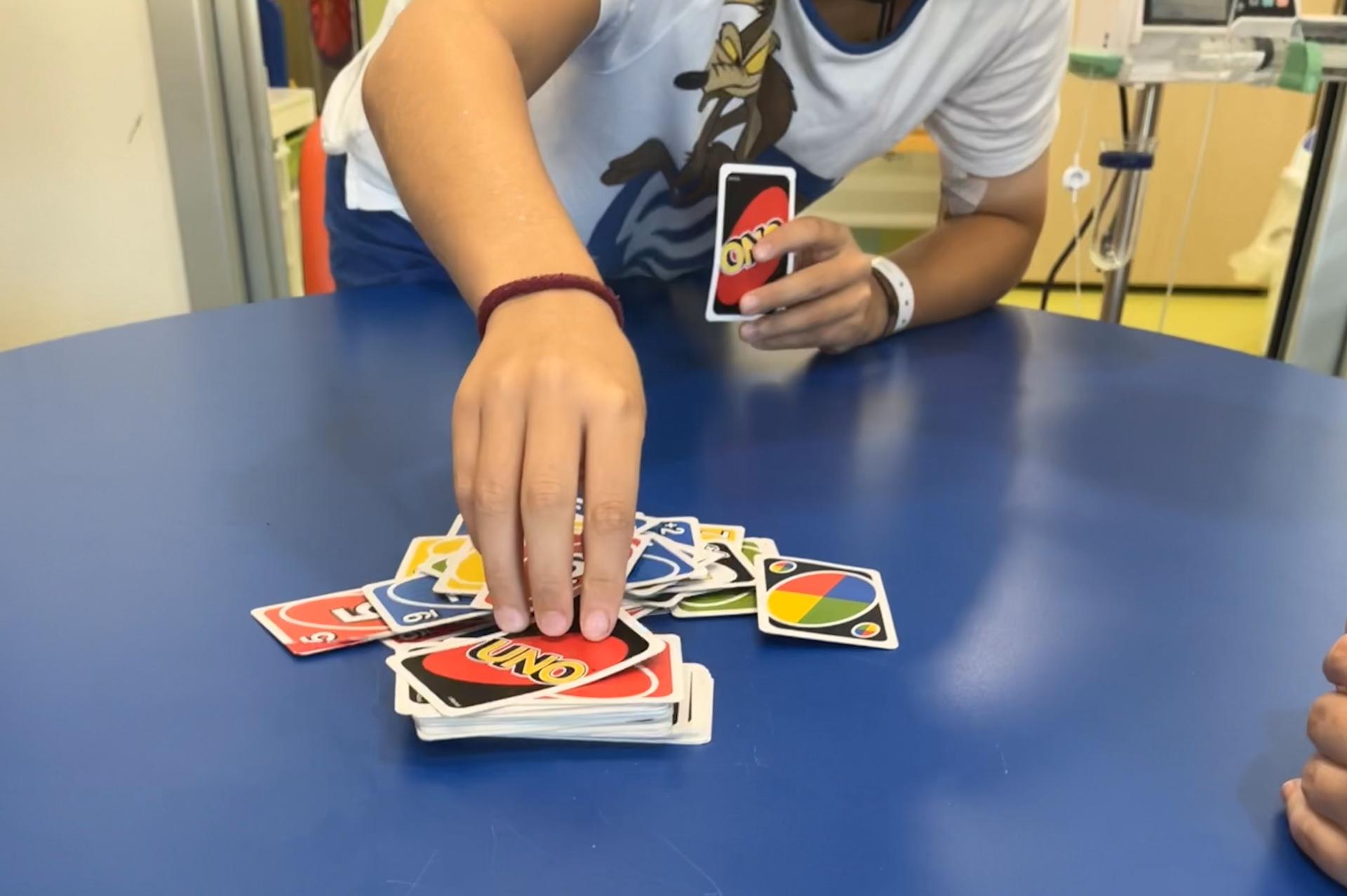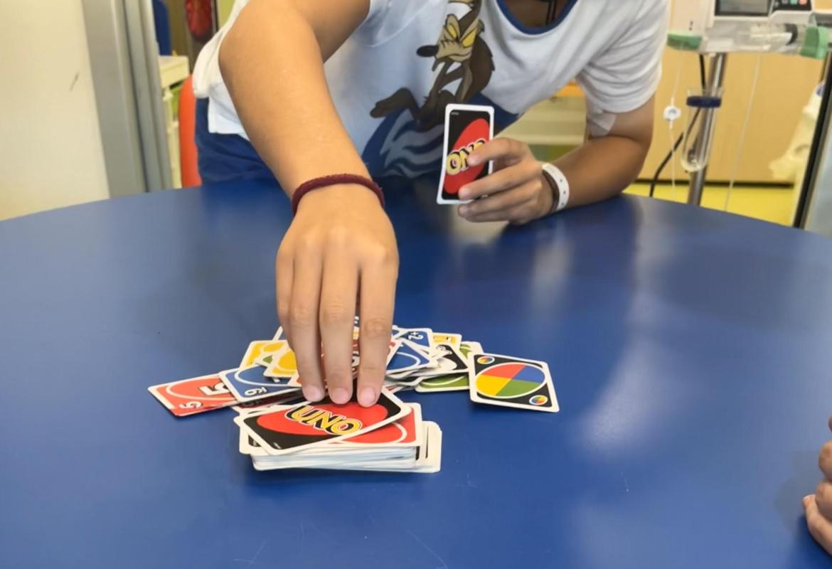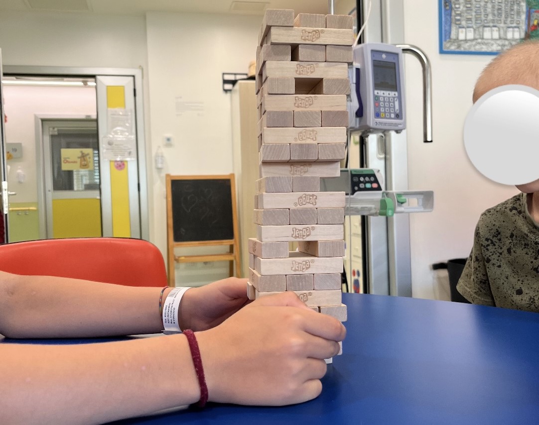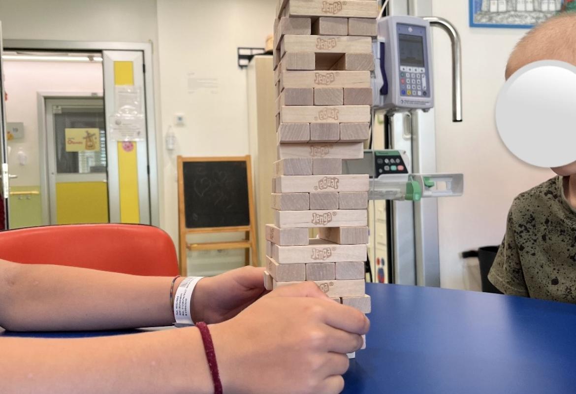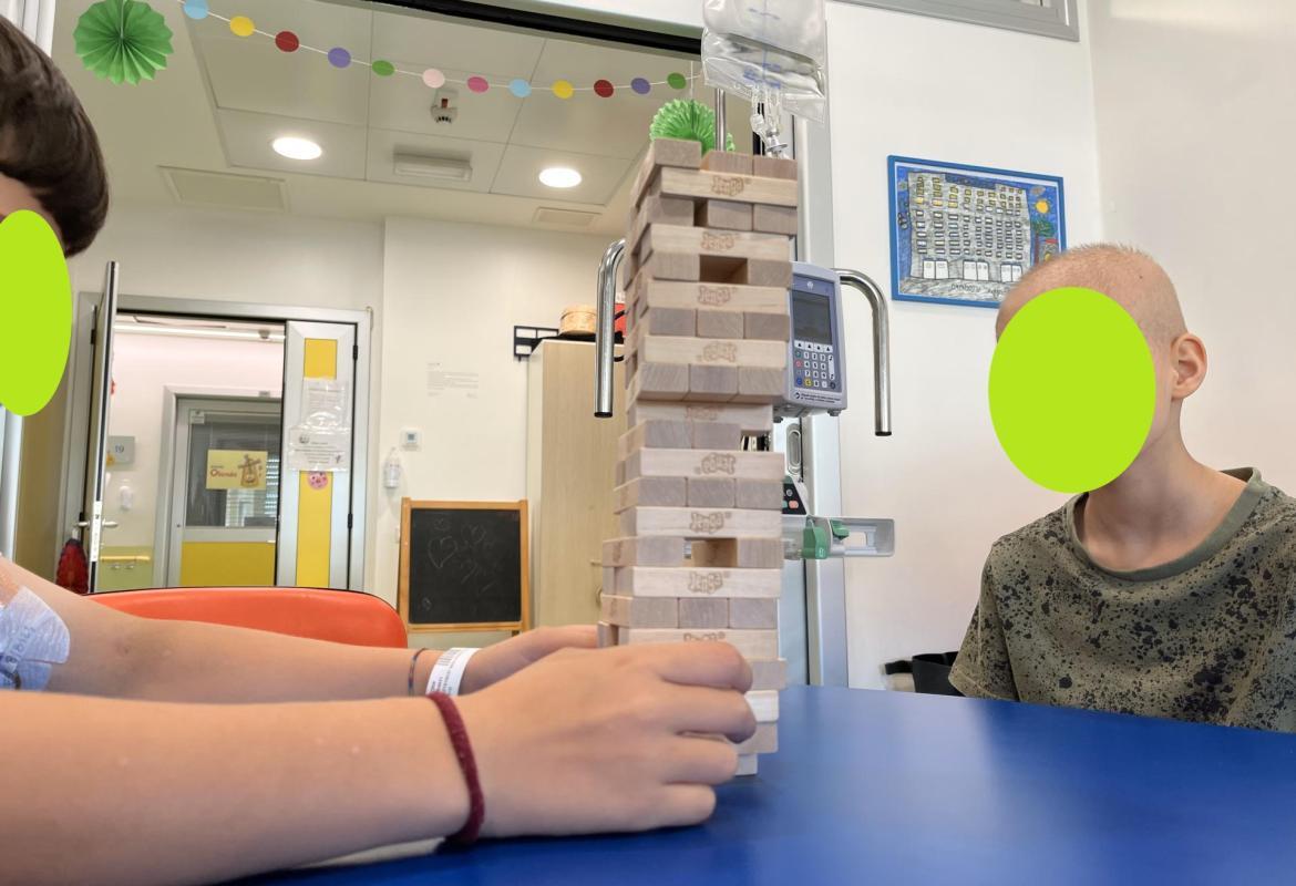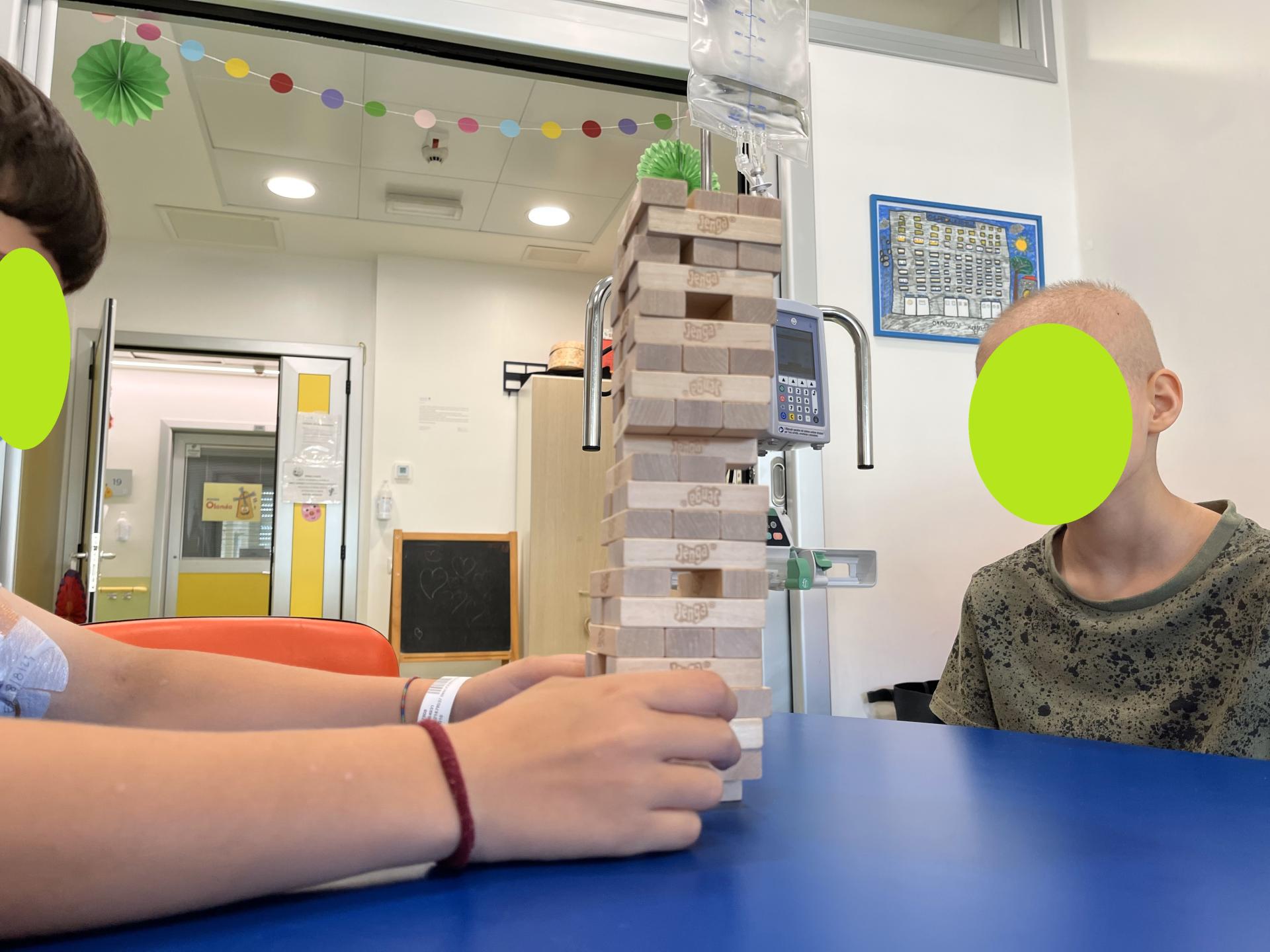 Oggi nella sala giochi del reparto di Oncologia Pediatrica del Policlinico Agostino Gemelli, Ester e Lucrezia si sono sfidate con L. e F. a Jenga, Carte Uno e Nomi, cose e città. Insieme hanno collaborato, scherzato e diffuso risate per tutto il reparto.