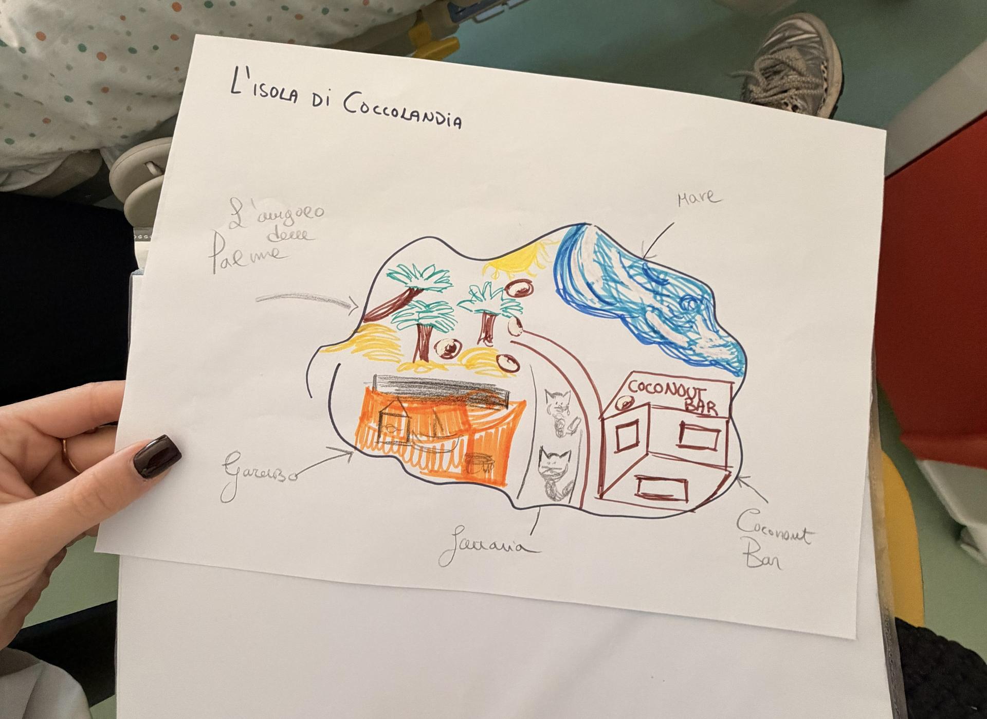 Erika e Angelica hanno fatto diverse attività. Hanno incontrato P., con cui in stanza hanno disegnato la loro isola personale, accompagnando il disegno a una descrizione a voce, anche dei programmi futuri per l'estate. In sala giochi hanno poi incontrato S., che ha fatto con loro qualche disegno e qualche gioco. Nel frattempo, anche J. ha fatto loro compagni in sala giochi, accompagnando con chiacchiere e qualche accordo al pianoforte.