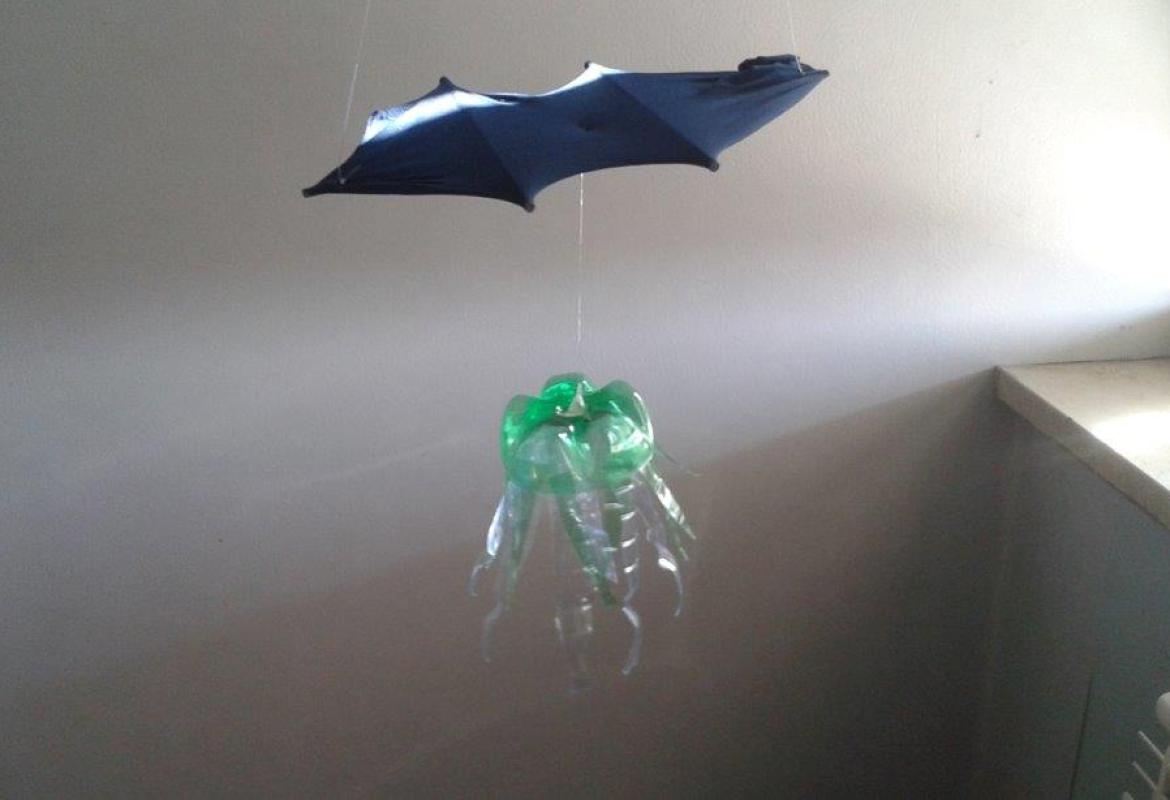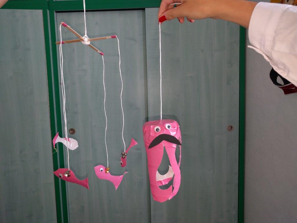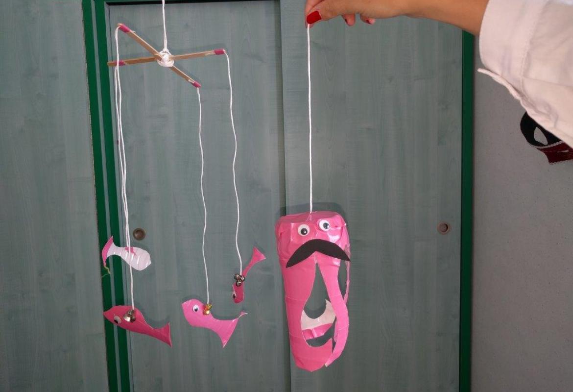 Creare delicate e leggere meduse da una bottiglia di plastica è molto semplice. Con collant blu e bacchette di bambù a disposizione potremmo anche aggiungere delle onde del mare a cui appendere le meduse che così sembrano nuotare ( o galleggiare) sospese nell'aria! Ed ecco che si aggiungono altri amici.. polipi e pesciolini sonanti!