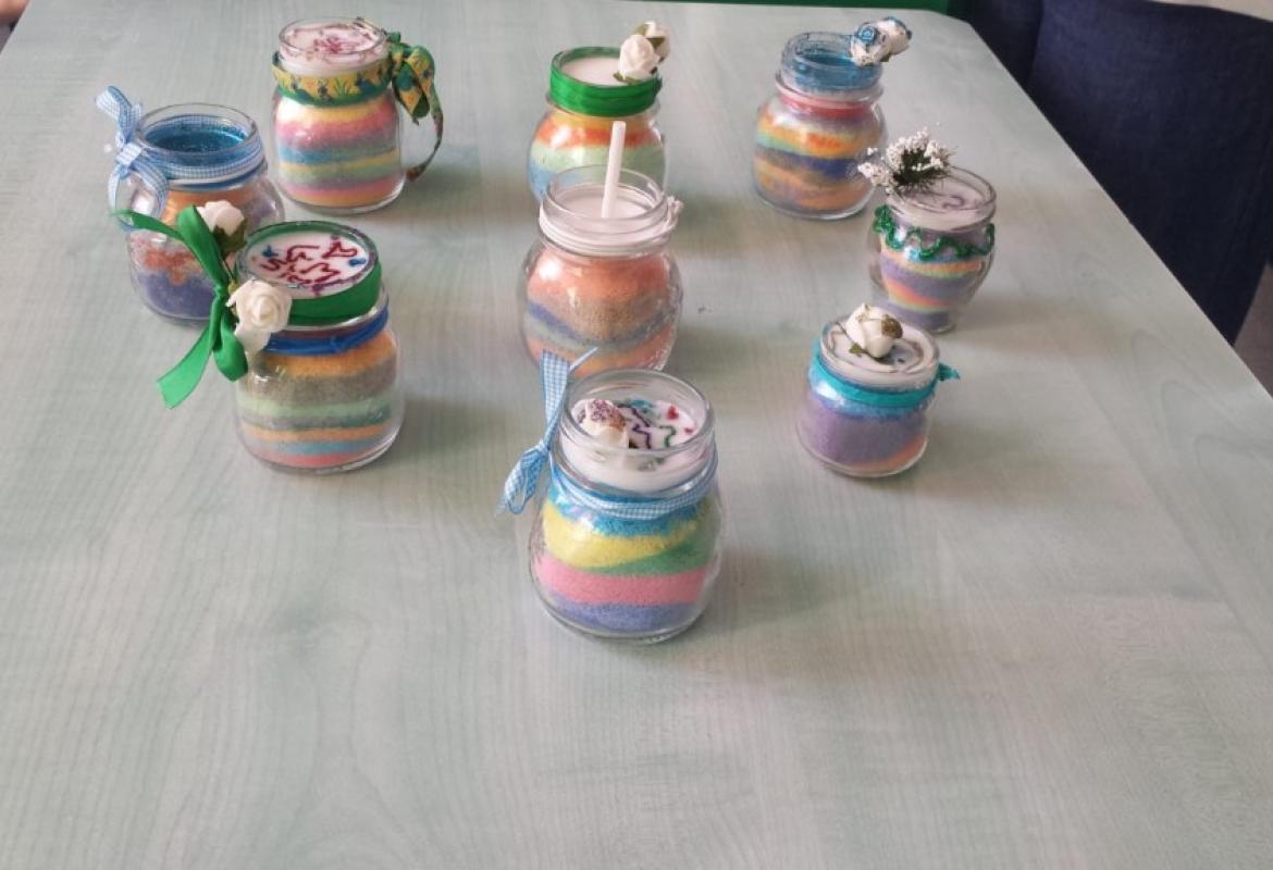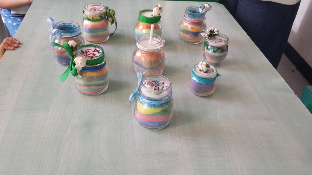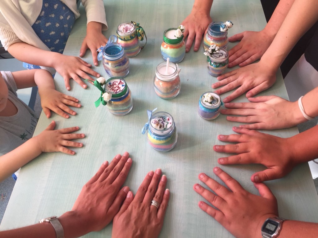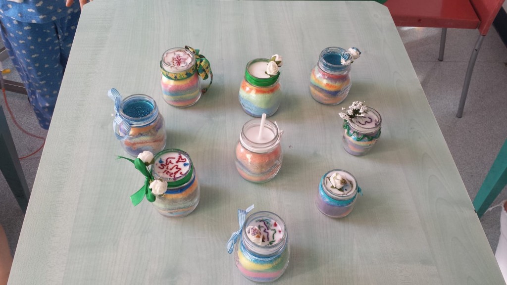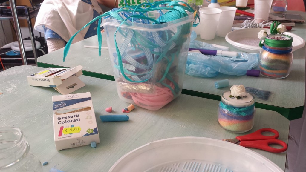 E come tutti gli adolescenti ci sorprendono accettando con entusiasmo la proposta. Chiacchierando e colorando sale scopriamo che sono le cugine e la sorella del bimbo appena operato, e allora calmiamo la preoccupazione facendo barattoli di sale per G. e da regalare agli altri bimbi.