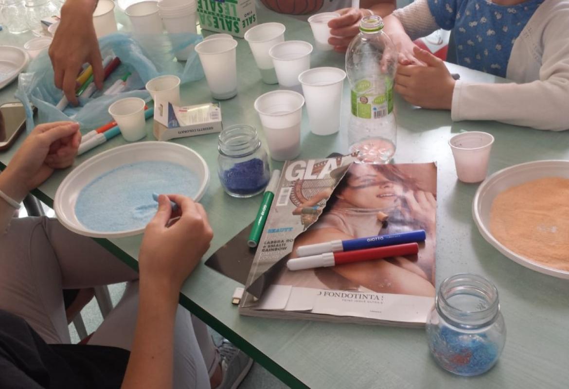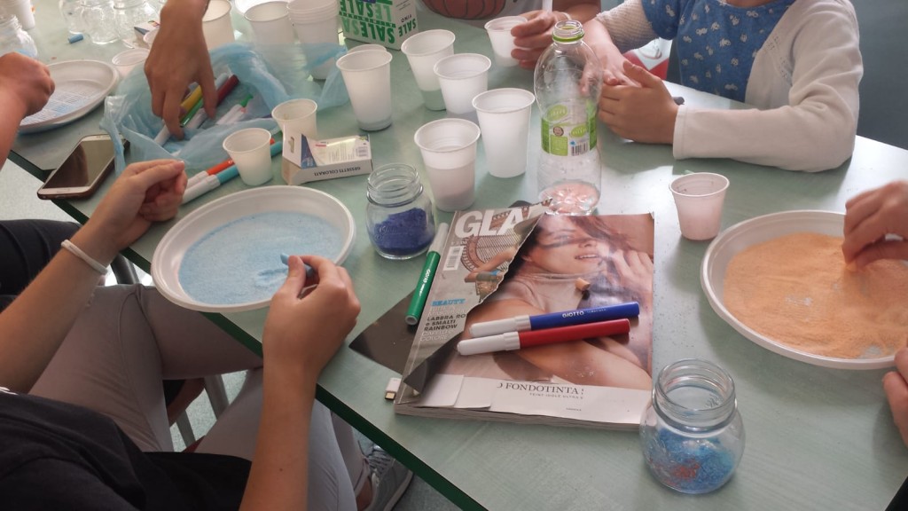 A Neurochirurgia c’erano tutti bambini sotto l’anno d’età, più un bambino appena tornato dalla sala operatoria, mentre ad oncologia alcuni bambini in isolamento più due che possono venire in sala giochi. Nella sala giochi c’erano tre ragazze che guardavano riviste di moda. Sprezzanti del “pericolo”, proponiamo di fare con noi il sale colorato.