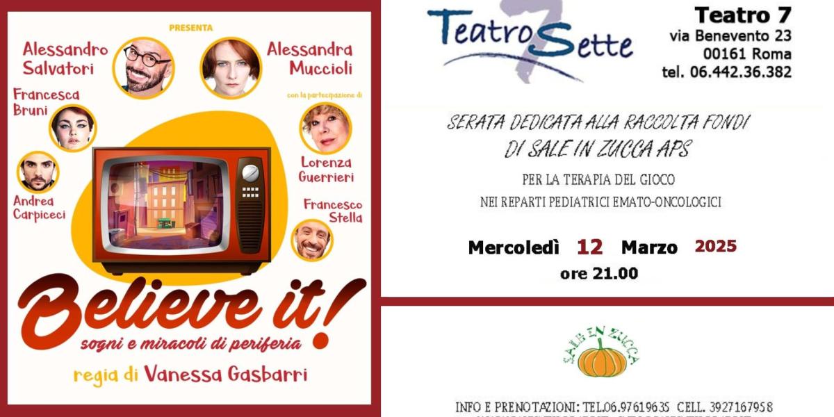 Si chiama Believe it! la commedia che quest'anno il Teatro 7 di Roma dedica alla solidarietà ed a noi. Lo spettacolo di mercoledì 12 marzo 2025 andrà a finanziare le nostre attività di ludoterapia nelle loro varie espressioni. E' una commedia ambientata nella Roma di oggi, nella quale i mebri di una famiglia si fanno strada pur tra mille difficoltà. Una piece divertente, che parla della vita di tutti i giorni.