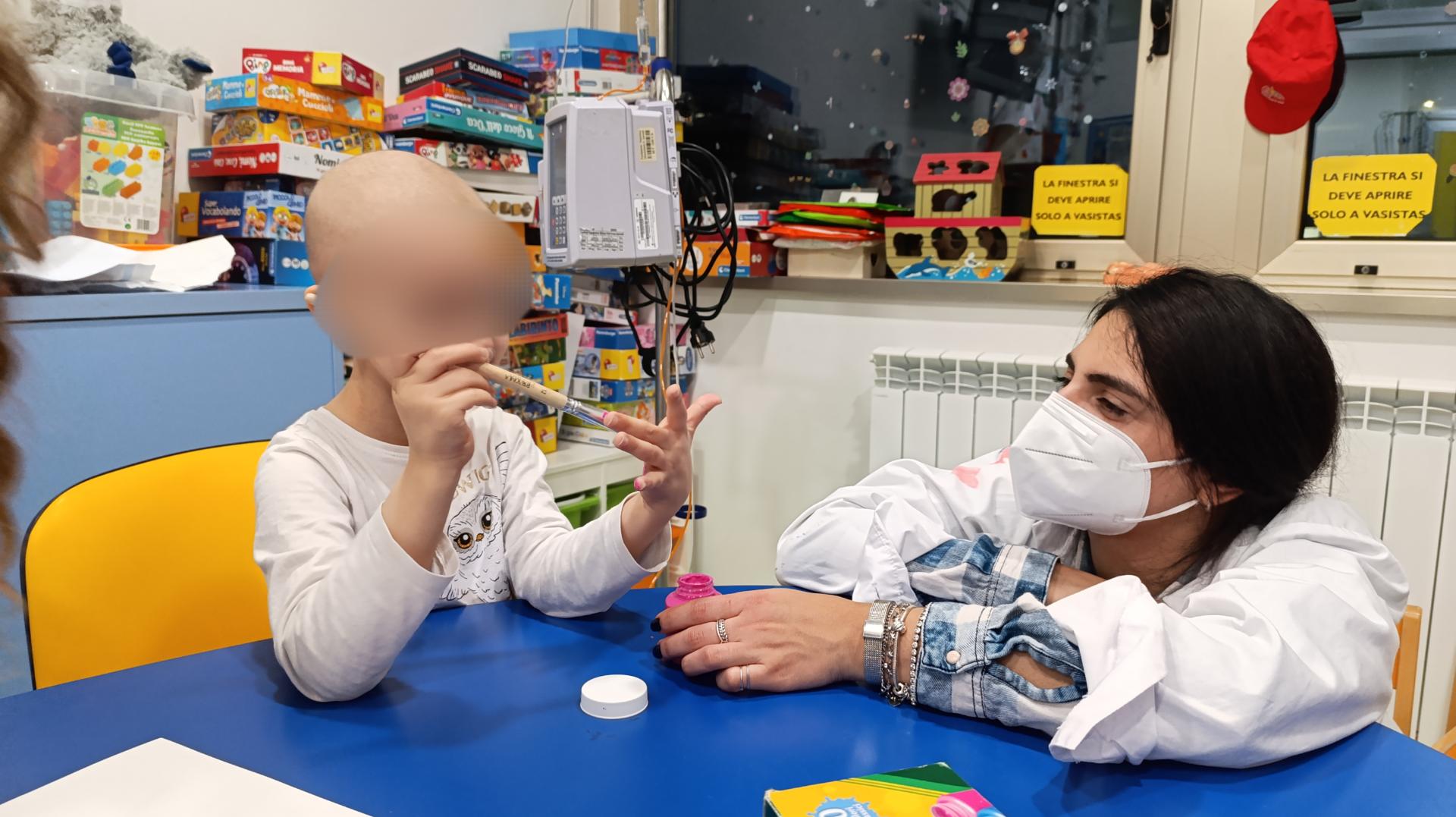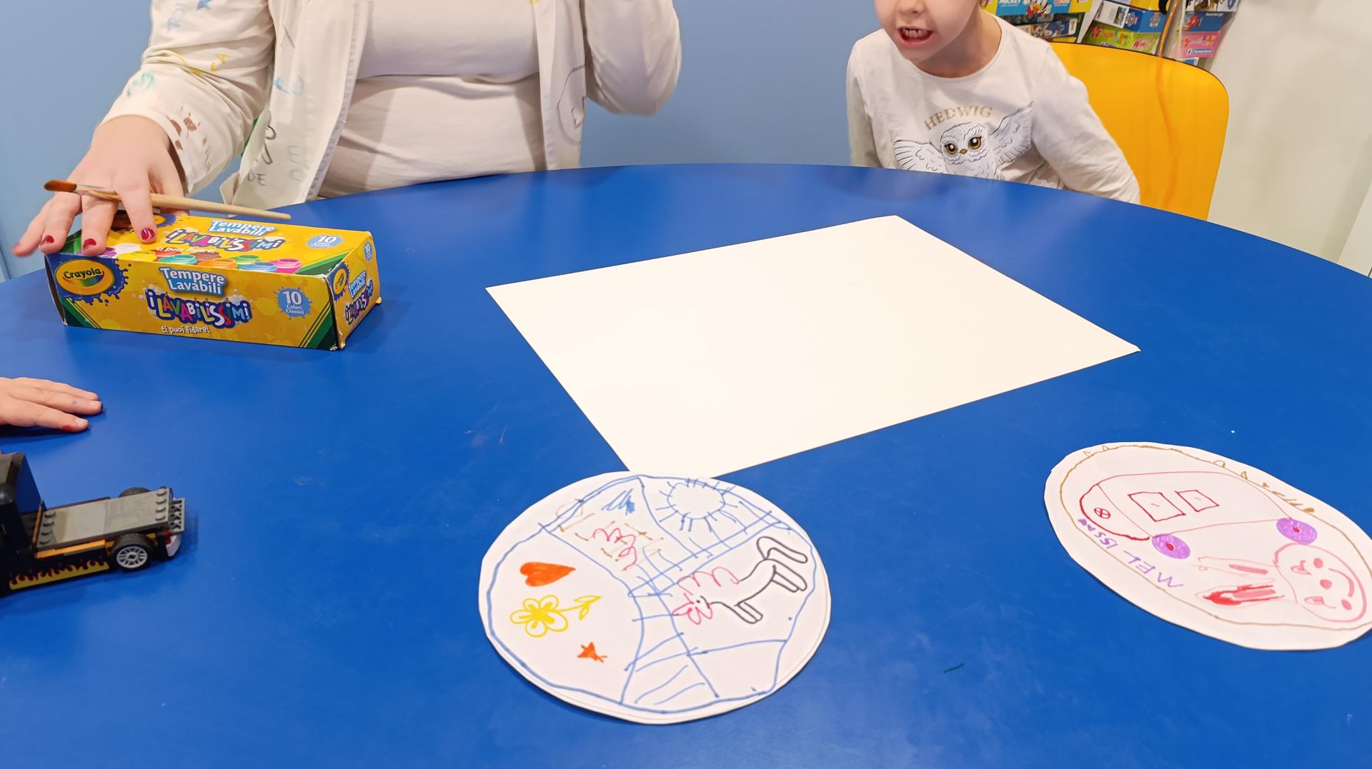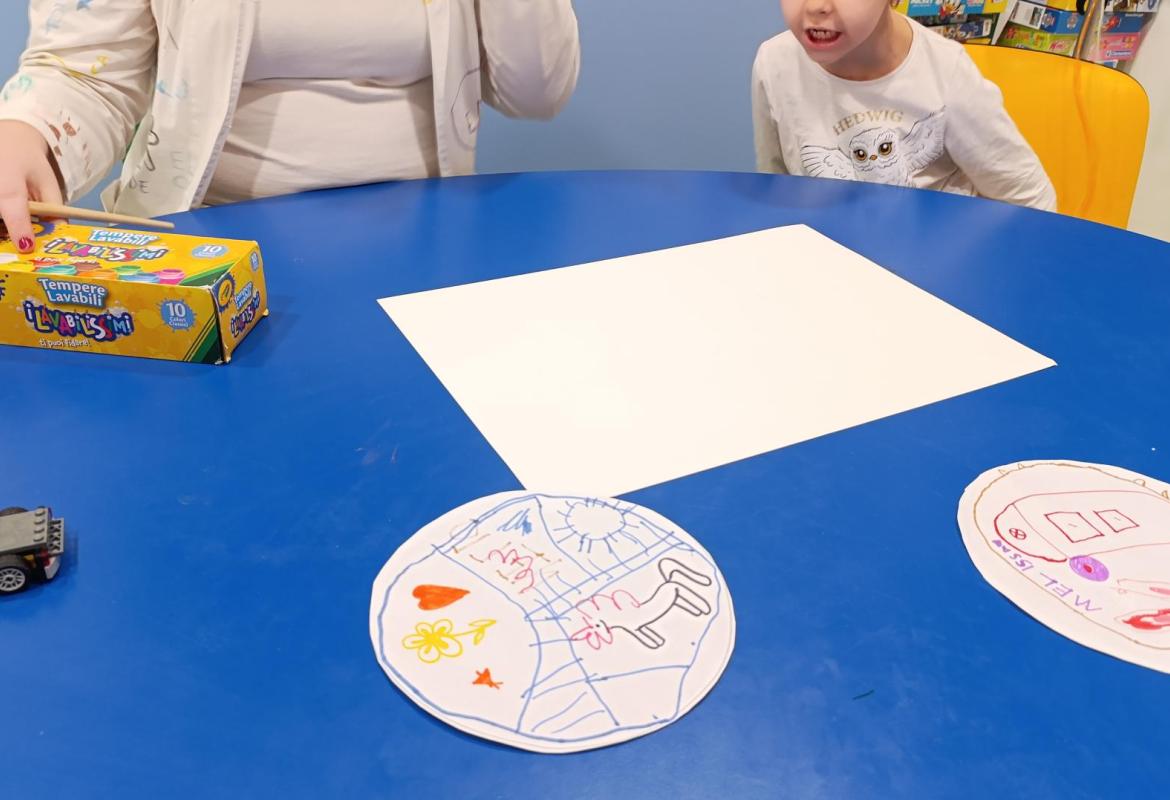 Nhamhiria ed Erika nelle attività di Oncologia pediatrica hanno incontrato N.,M. Ed E.,che era arrivata proprio quel giorno. Tutti insieme hanno deciso di fare due attività. La prima consisteva nel contribuire, a turno, ad aggiungere un dettaglio nel foglio da disegno in modo tale che ne uscisse un bellissimo quadro a cui tutti avevano partecipato. Alla fine tutti i partecipanti si sono scambiati fra loro i vari disegni. Nella seconda attività invece i bambini, tranne E. che era tornata in stanza, hanno fatto sempre un'opera d'arte,questa volta lasciando l'impronta della loro mano con le tempere colorate. A questa attività ha partecipato anche Lucrezia, che li ha raggiunti dopo aver svolto le sue attività a Neurochirurgia.