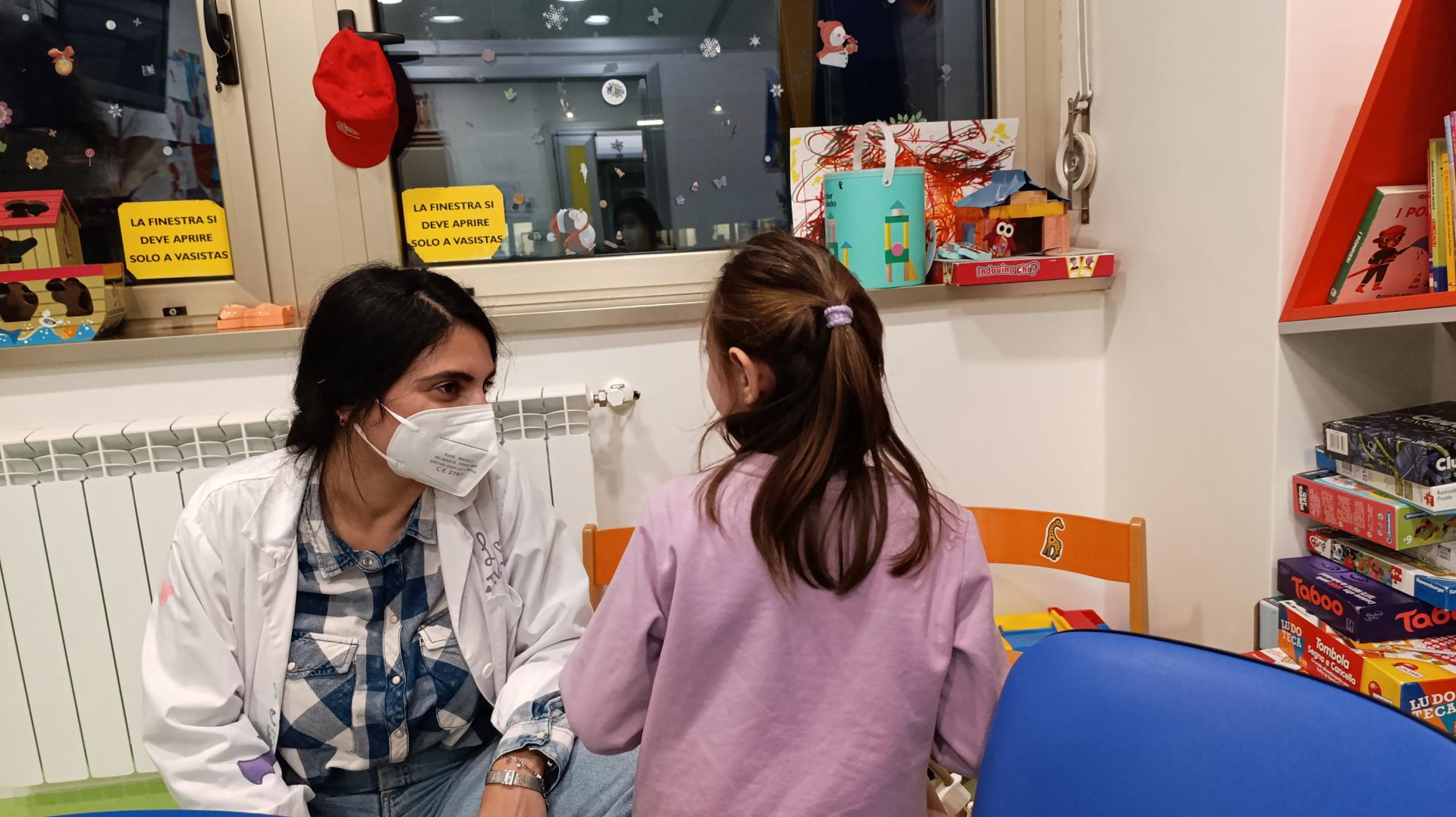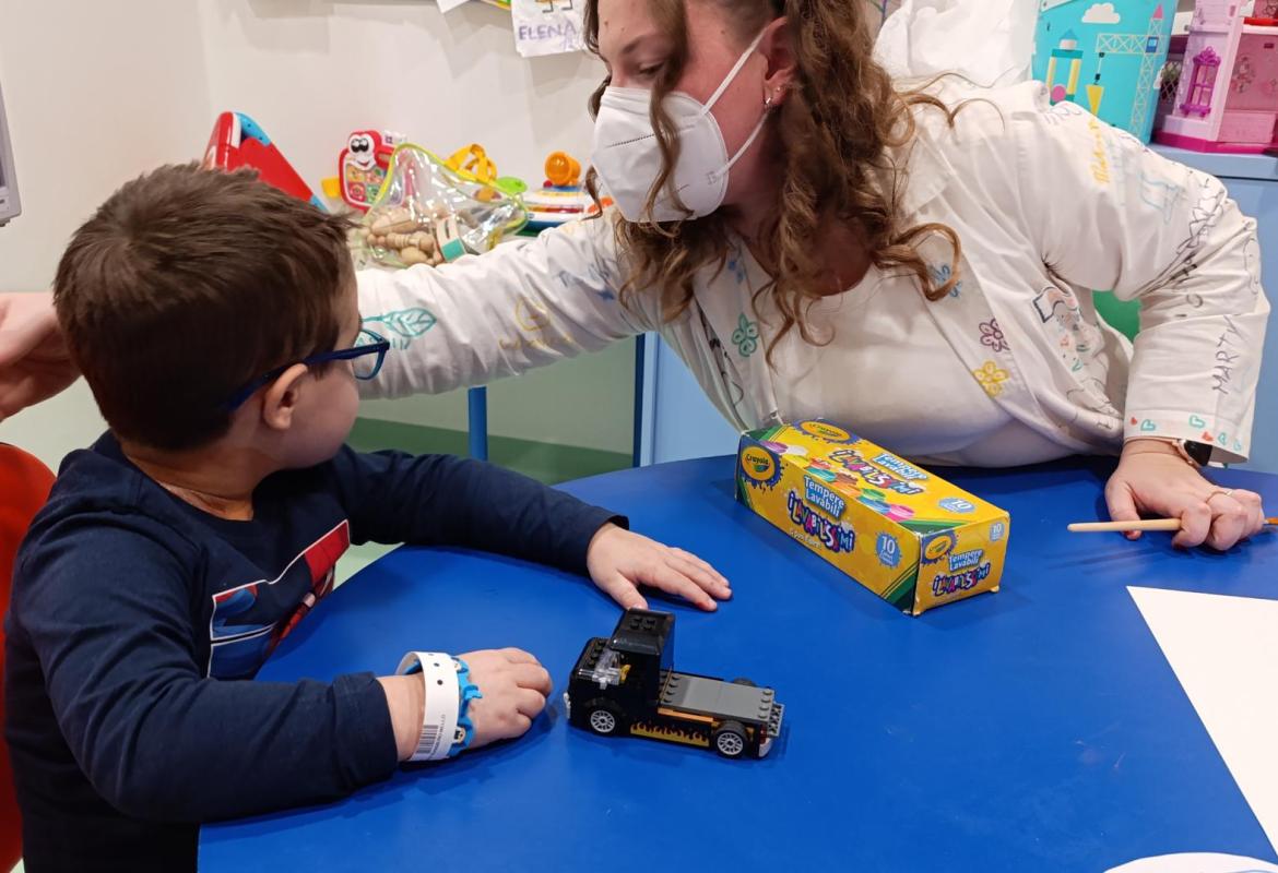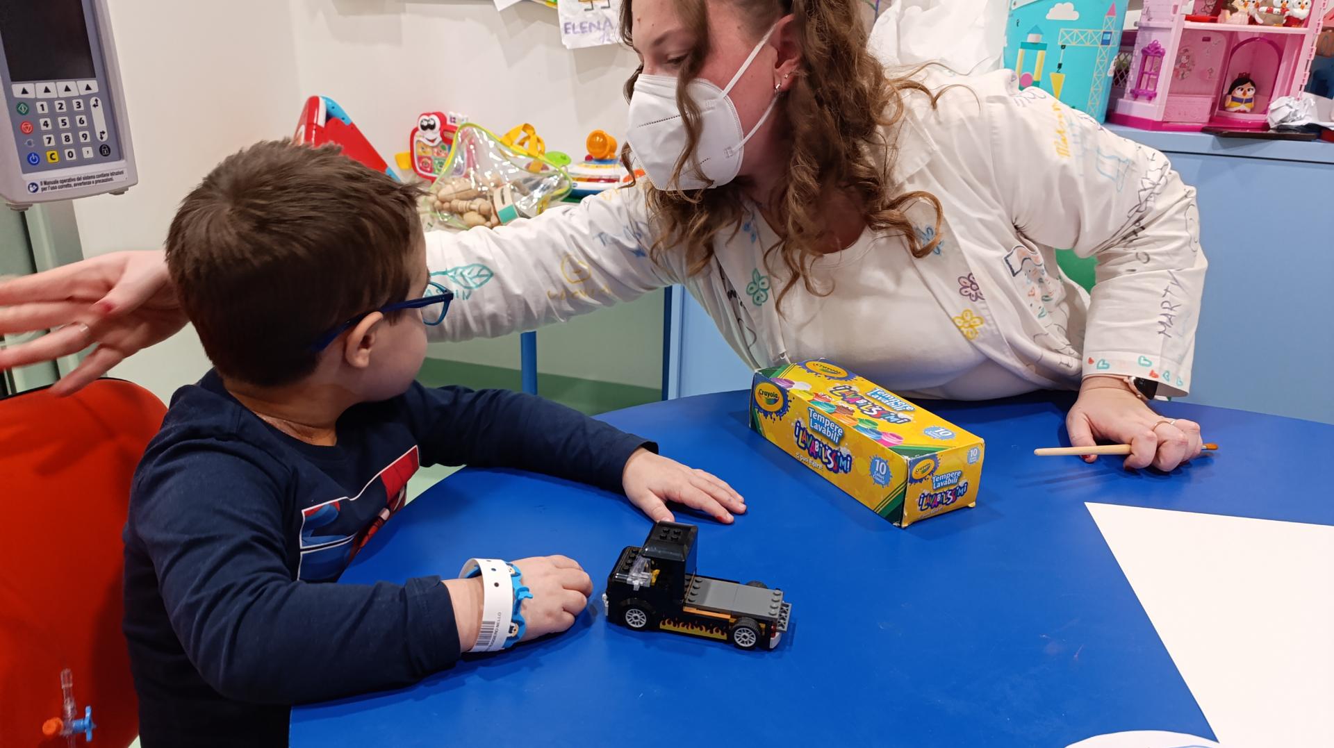Nhamhiria ed Erika nelle attività di Oncologia pediatrica hanno incontrato N.,M. Ed E.,che era arrivata proprio quel giorno. Tutti insieme hanno deciso di fare due attività. La prima consisteva nel contribuire, a turno, ad aggiungere un dettaglio nel foglio da disegno in modo tale che ne uscisse un bellissimo quadro a cui tutti avevano partecipato. Alla fine tutti i partecipanti si sono scambiati fra loro i vari disegni. Nella seconda attività invece i bambini, tranne E. che era tornata in stanza, hanno fatto sempre un'opera d'arte,questa volta lasciando l'impronta della loro mano con le tempere colorate. A questa attività ha partecipato anche Lucrezia, che li ha raggiunti dopo aver svolto le sue attività a Neurochirurgia.