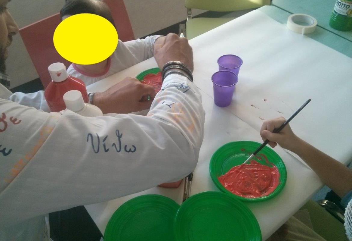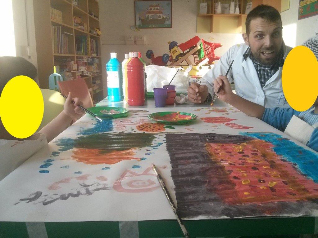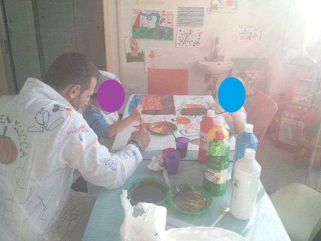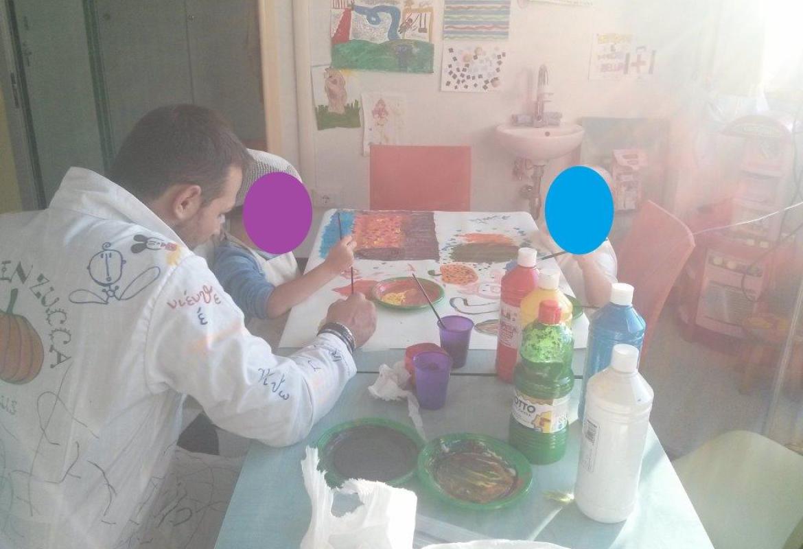 Il tavolo della sala giochi del reparto è stato accuratamente, ed interamente, rivestito di carta per non porre limiti alla fantasia. Pennelli, tempere, mani, spugne, bimbi, nonne e ludoterapisti hanno fatto il resto!