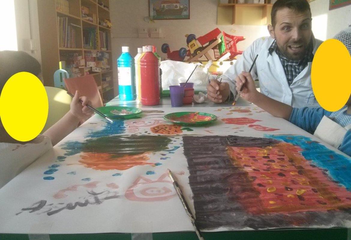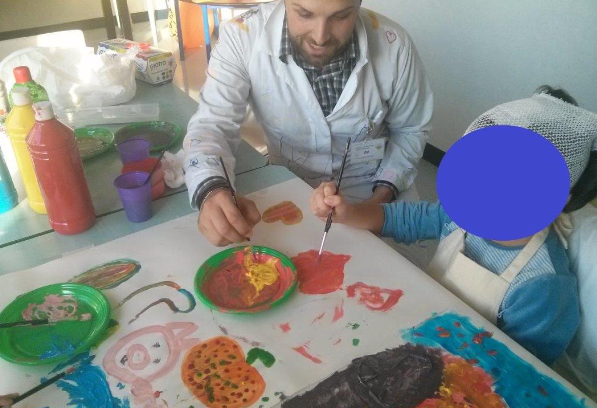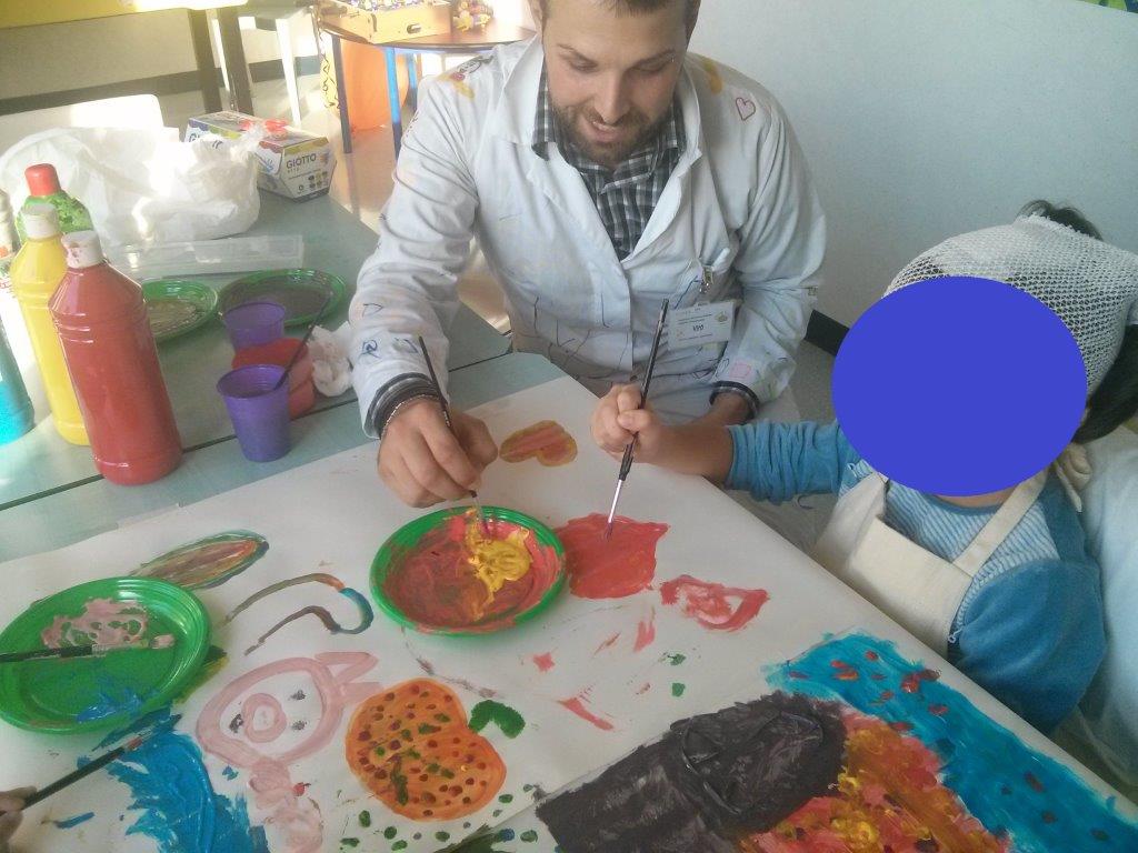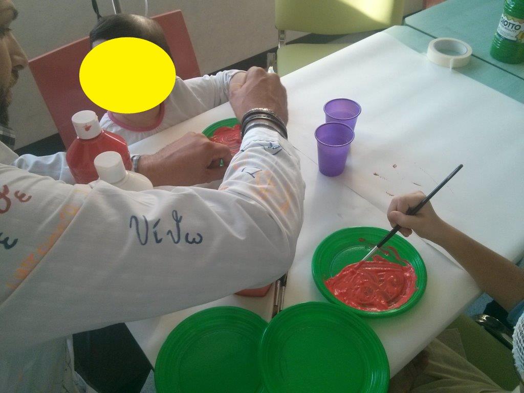 Il tavolo della sala giochi del reparto è stato accuratamente, ed interamente, rivestito di carta per non porre limiti alla fantasia. Pennelli, tempere, mani, spugne, bimbi, nonne e ludoterapisti hanno fatto il resto!