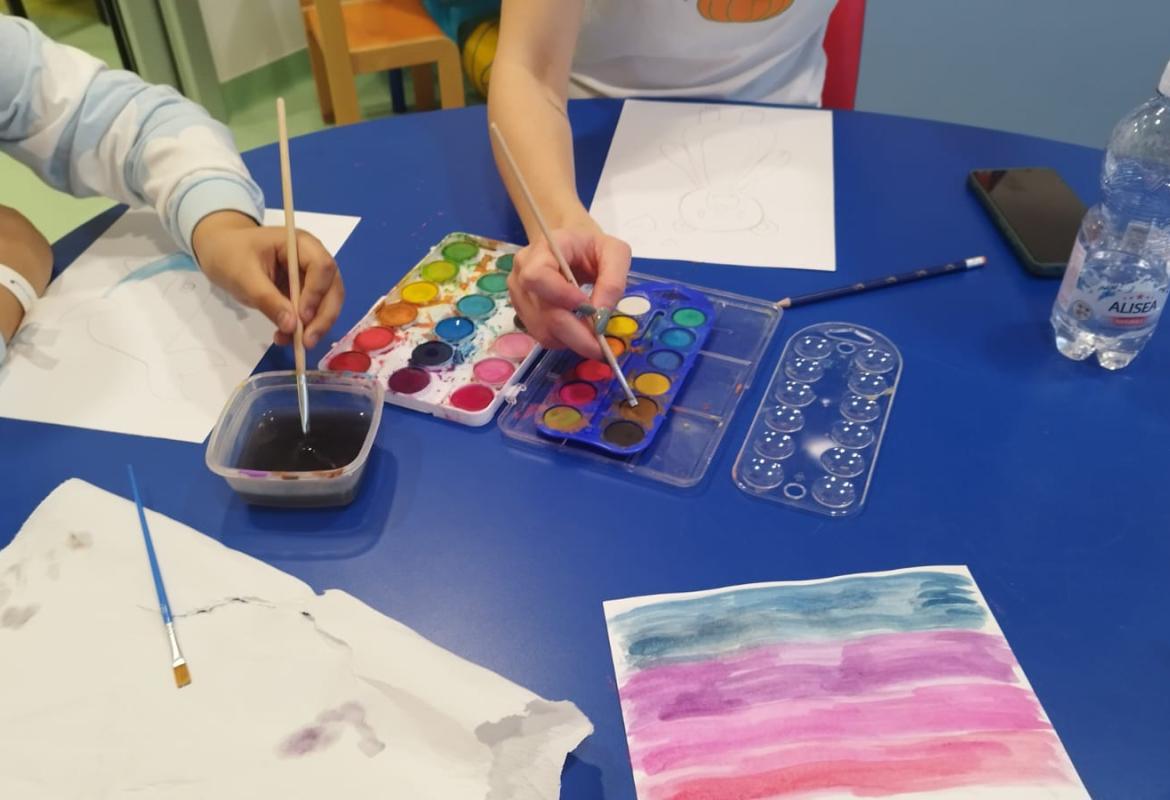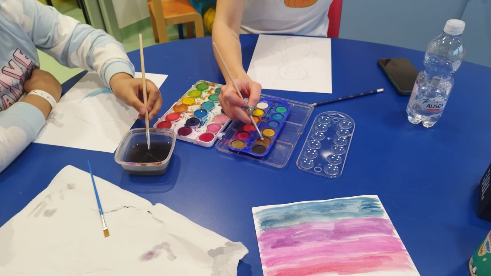 Nhamhiria ed Erika sono state al reparto di oncologia del Gemelli dove hanno incontrato H. con cui hanno fatto dei disegni stupendi: Erika ha iniziato disegnando qualcosa di astratto che poi è diventato lo sfondo di un paesaggio, Nhamhiria ha disegnato un orsacchiotto e H. un fondale marino con personaggio principale una balena. Disegnando hanno chiacchierato e anche cantato canzoni in spagnolo, che H. conosce molto bene, e il pomeriggio è passato velocissimo.