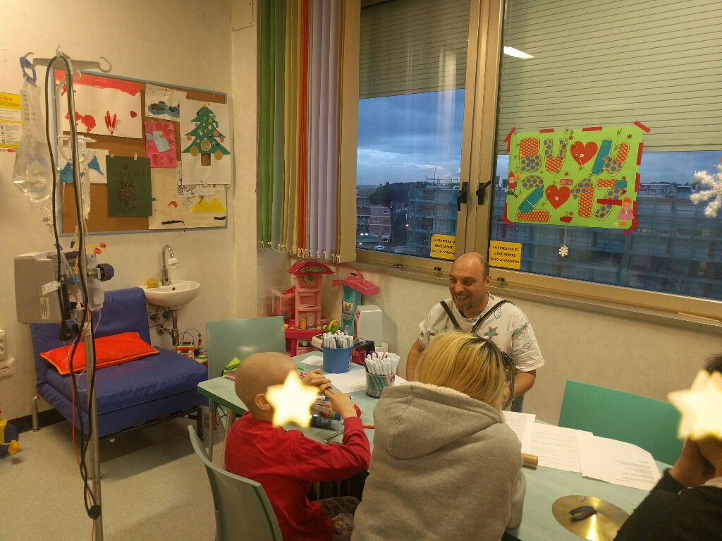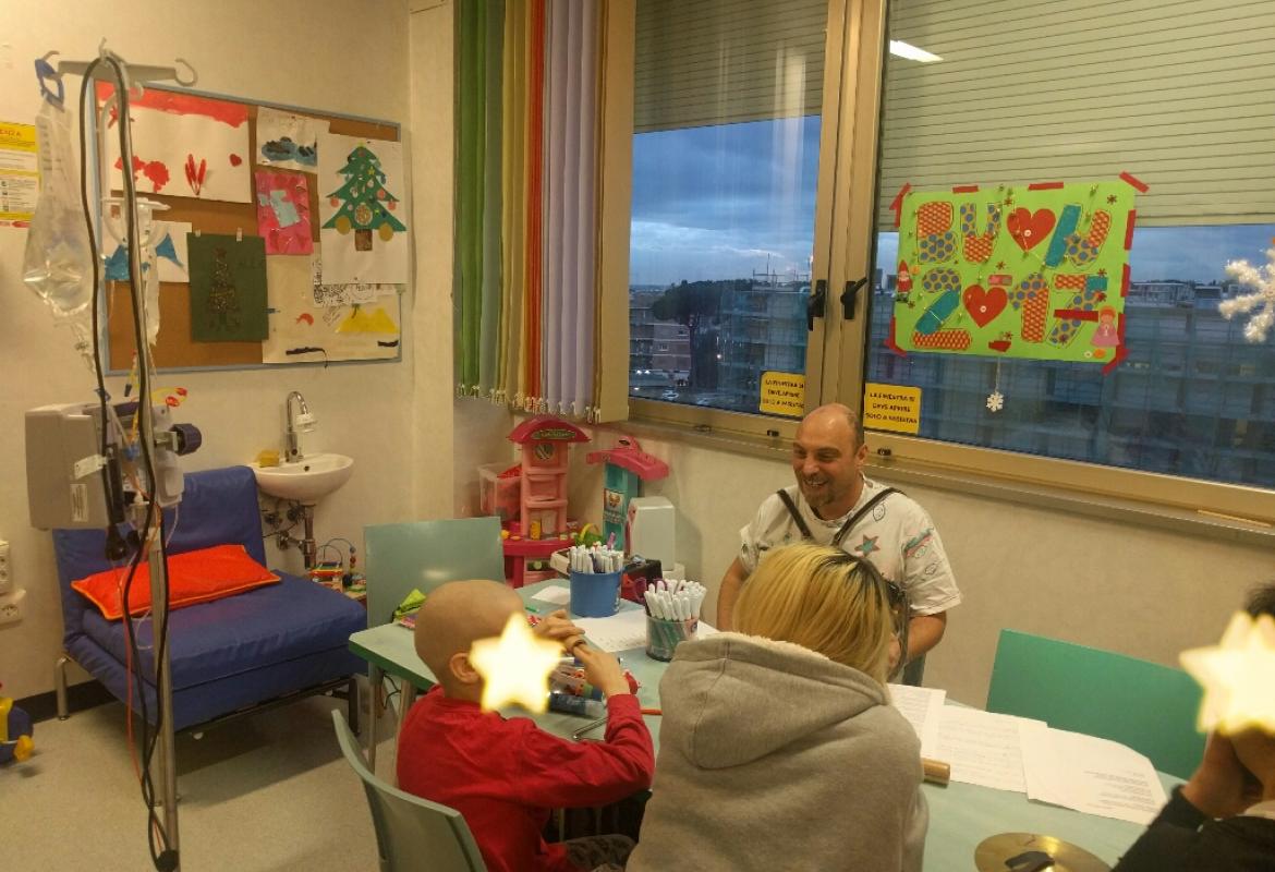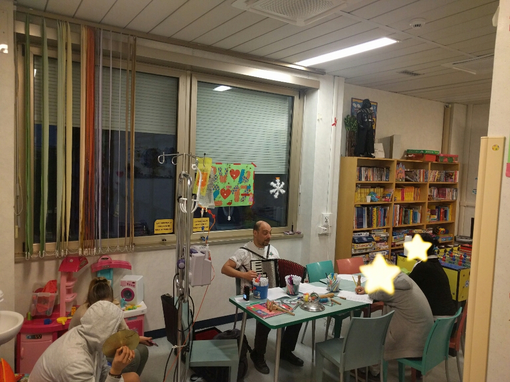 Il reparto di oncologia pediatrica ha assisitito a qualcosa di incredibile, nei giorni scorsi. il nostro musicoterapista Alessandro Severa ha proposto con la sua fisarmonica un grande classico ai bambini e ragazzi del reparto, l'incisione di un cd musicale. Funziona così; tutti insieme, bambini, ragazzi, genitori e musicoterapisti scelgono un brano e fanno delle "prove". Poi, sempre tutti insieme si esegue il pezzo, si registra e Alessandro "aggiusta" al computer.