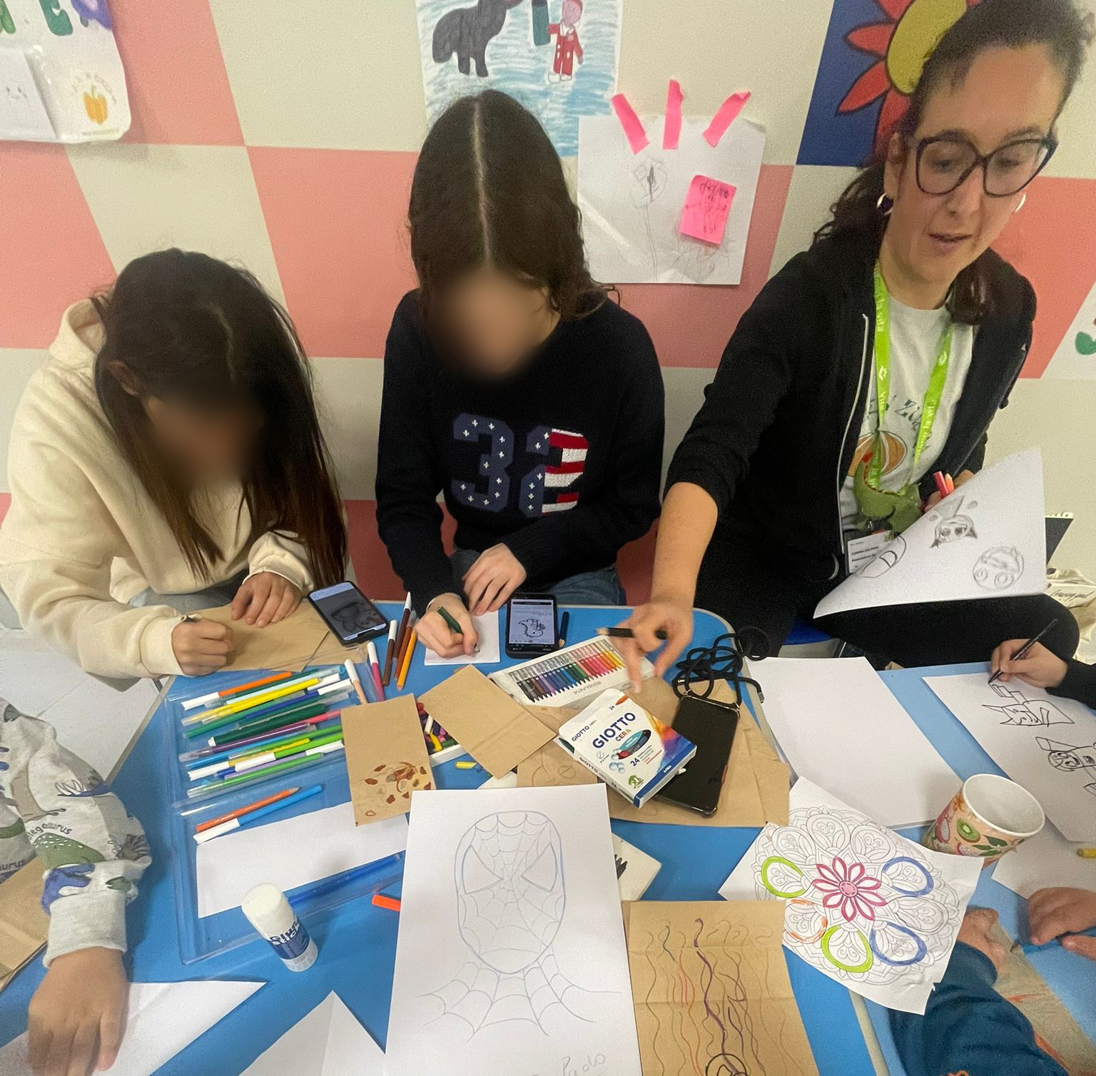 Angelica e Corinna hanno fatto i burattini di carta oggi, insieme a vari bimbi. Anche delle ragazze più grandi si sono poi aggiunte con piacere. È sempre bello poter fare compagnia ai piccoli (e grandi pazienti) riempiendo di colori e risate i loro momenti vuoti di attesa.