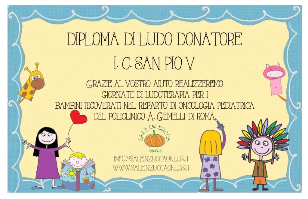 A testimonianza di questo grande gesto di solidarietà Sale in Zucca ha regalato una targa di DONATORE DI LUDOTERAPIA ad ogni classe partecipante.