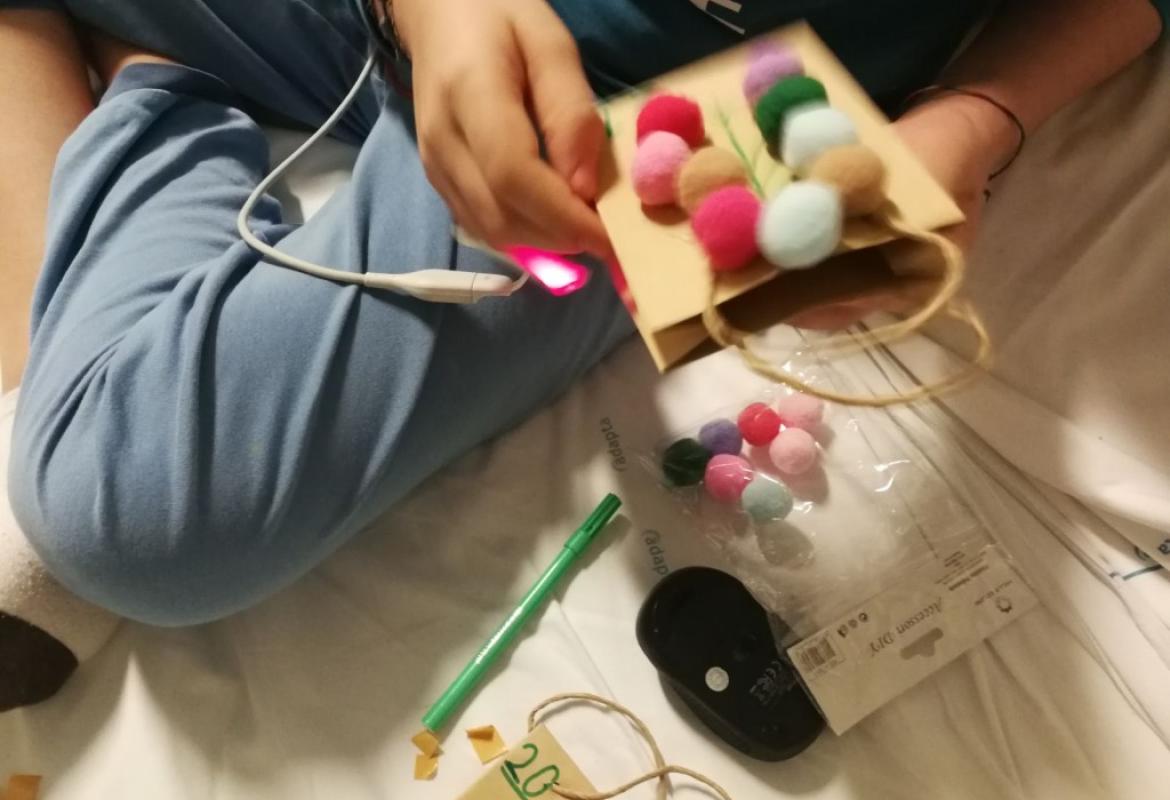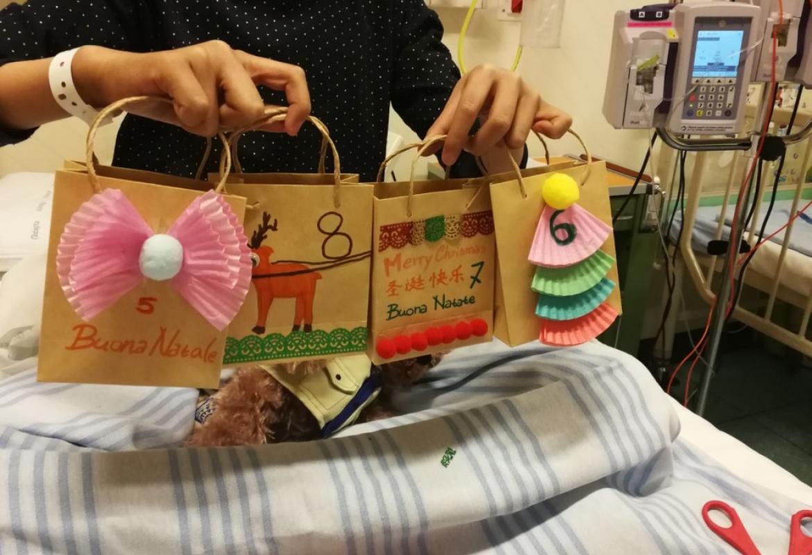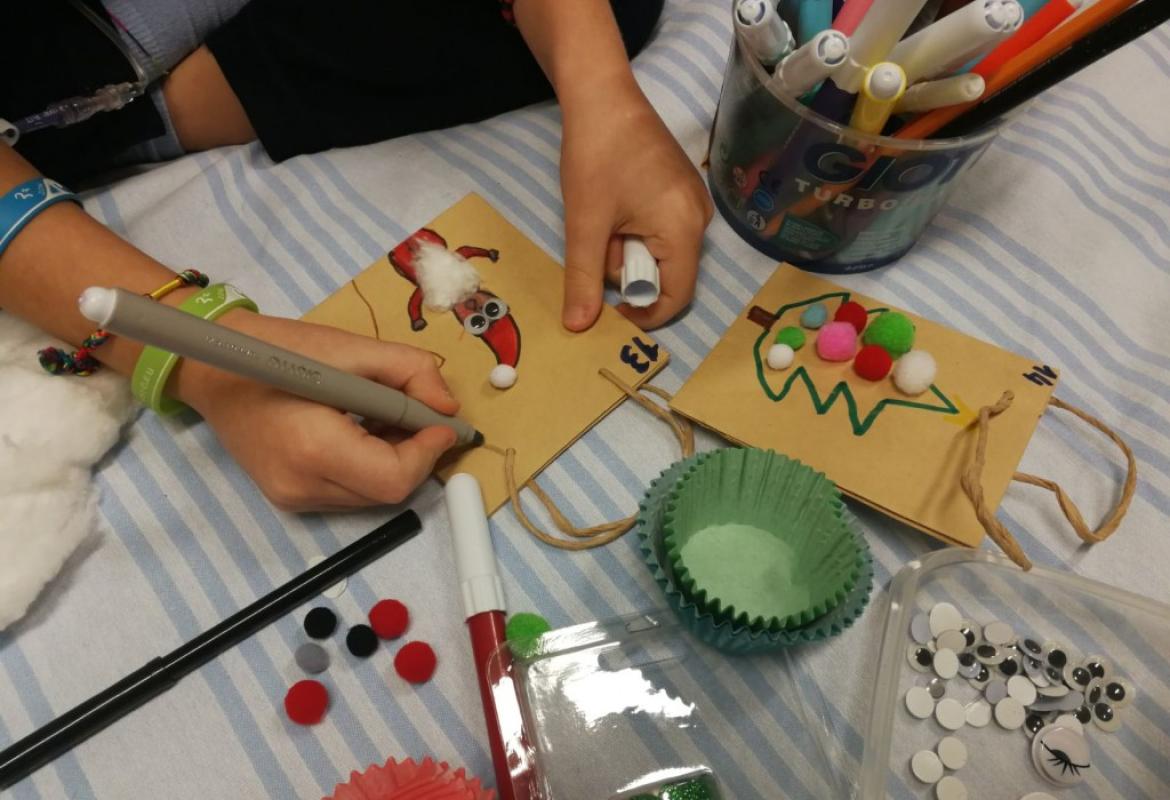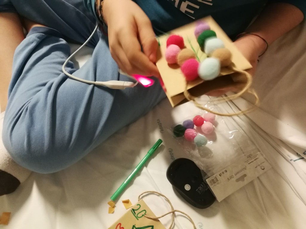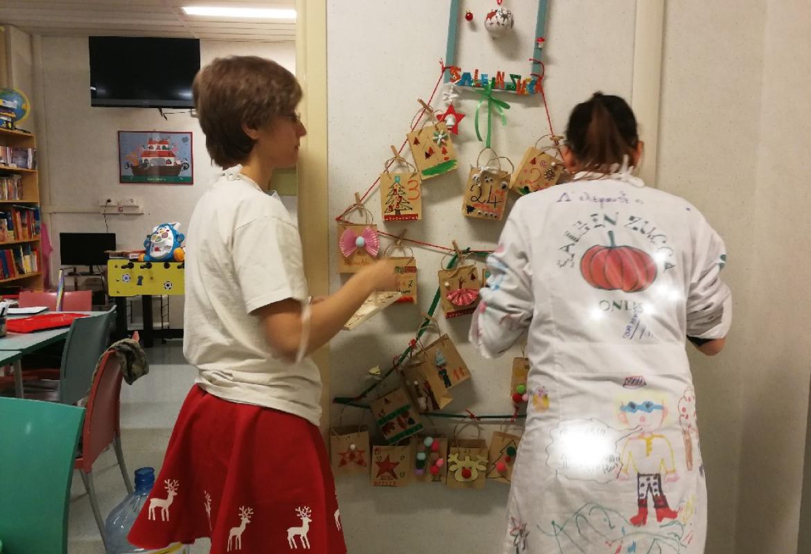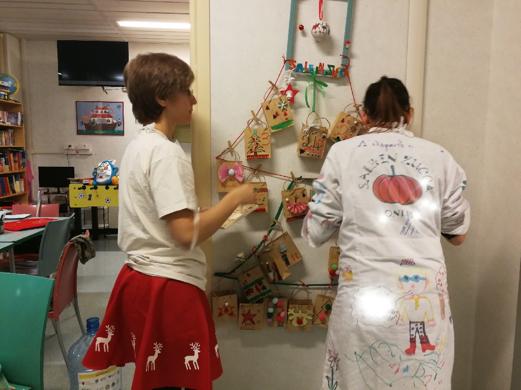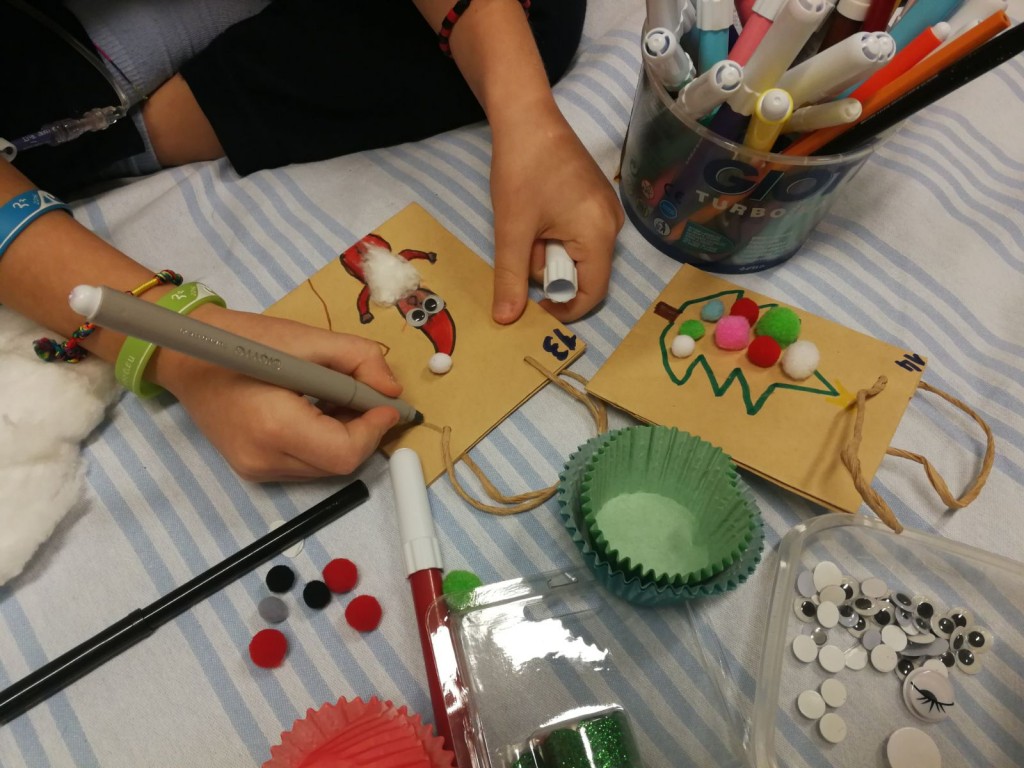 Insomma, tra risate e prese in giro abbiamo fatto giocare bambini, genitori e personale. In questo clima riscaldato dal gioco competitivo ci siamo quindi divise in sala giochi con A di 5 anni e S. di 4 anni per preparare la base del calendario e 8 bustine, le altre sono state fatte dai bambini in isolamento. Così la nostra Chiara si è allenata facendo il giro delle stanze. Alla fine è arrivata la cena e noi stavamo ancora allestendo.