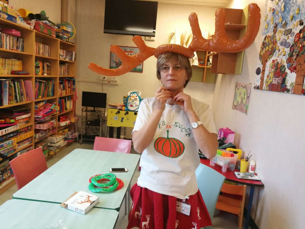 Chiara aveva portato tutto l’occorrente per costruire il Calendario dell’Avvento ma anche un paio di corna da renna e dei cerchietti gonfiabili. Poi nell’armadio abbiamo trovato un gonnellino con le renne e Alessia non ha resistito… . ed ecco servito il gioco di riscaldamento: Allena la Renna.