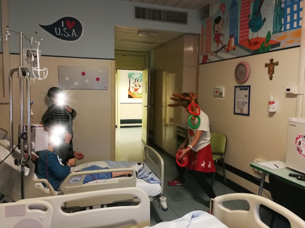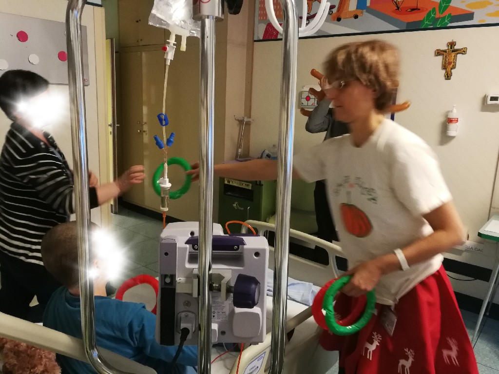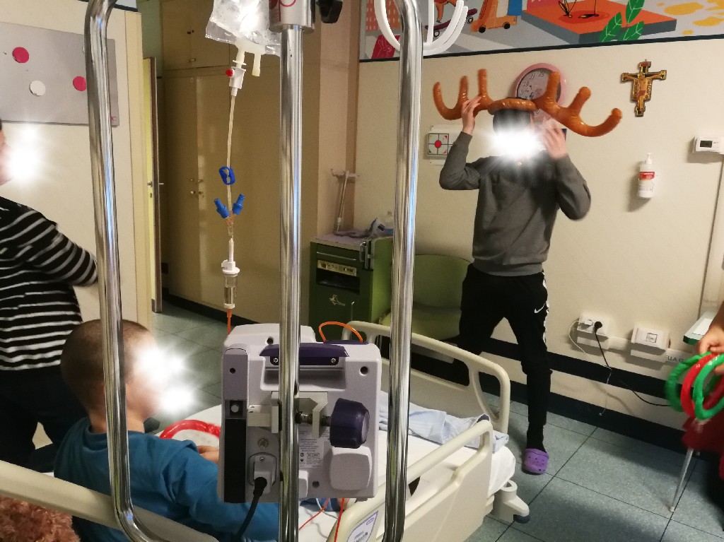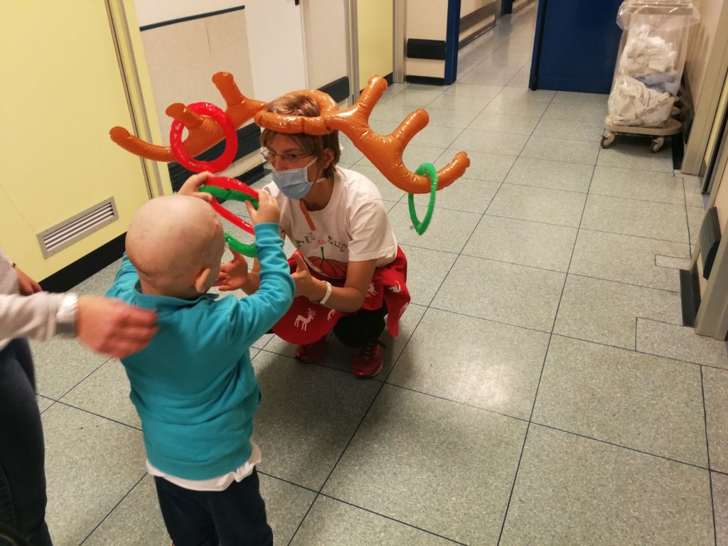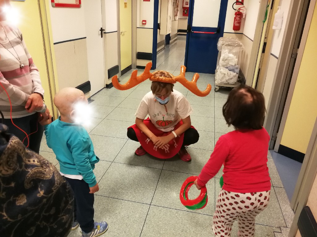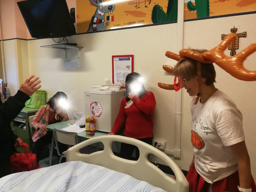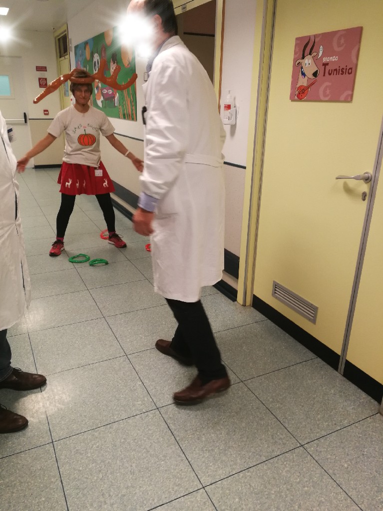 Poi la Renna si è aggirata per stanze e corridoio tra risate di medici e infermieri che non hanno resistito e anche loro hanno lanciato i cerchietti per cercare di infilare le corna della Renna. Ma la renna dispettosa e indisciplinata si muoveva troppo (diciamo così, e non che nessuno aveva una mira decente!)