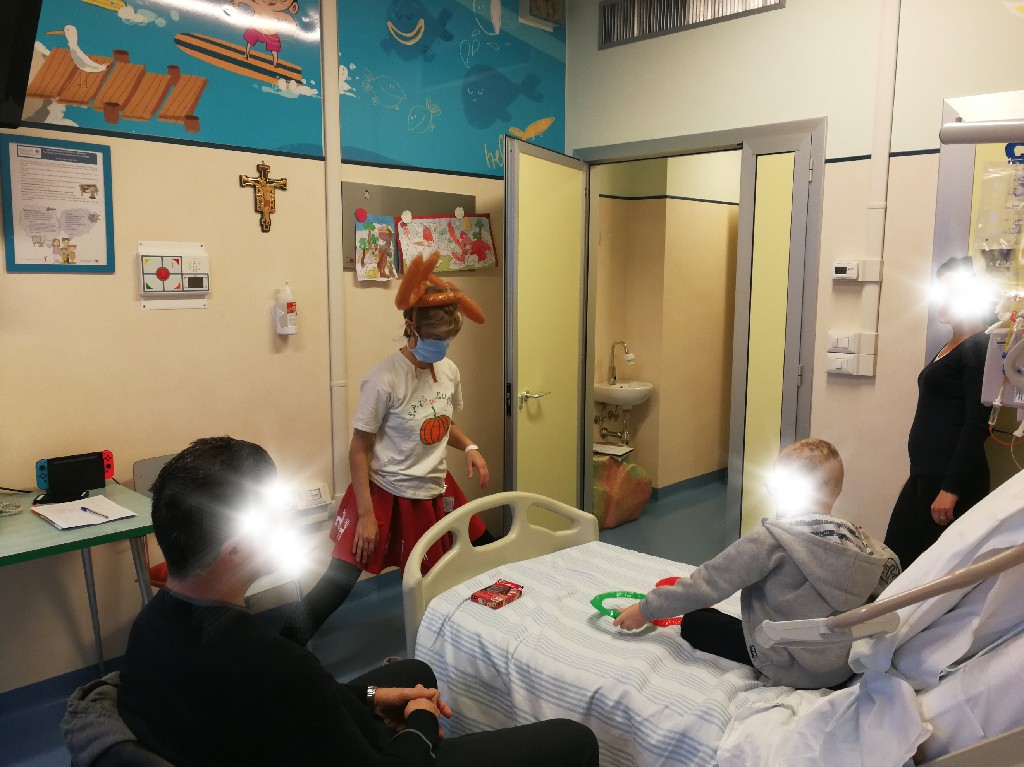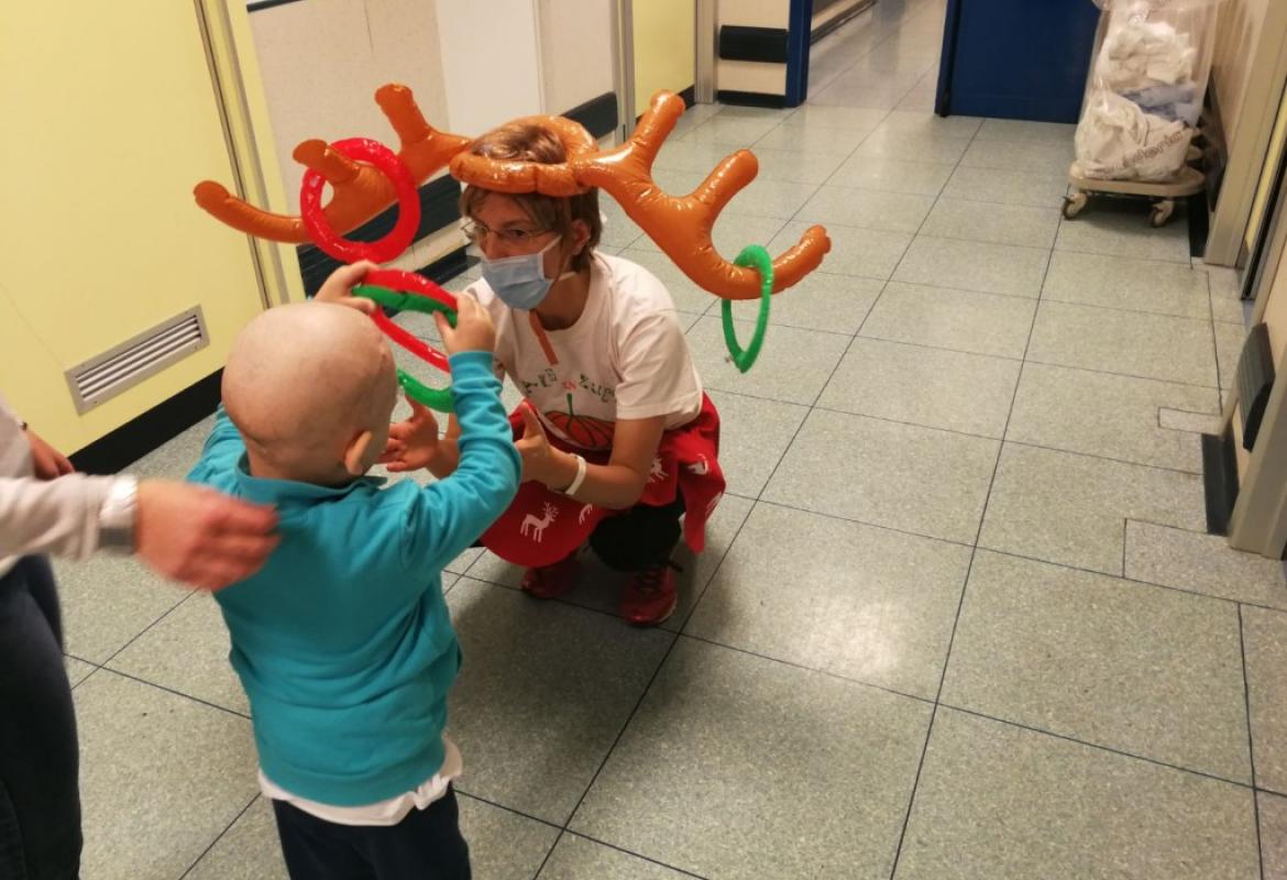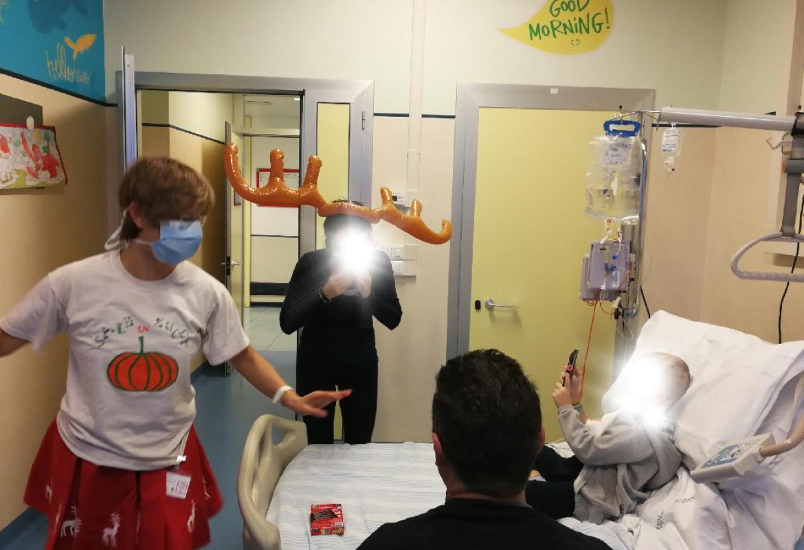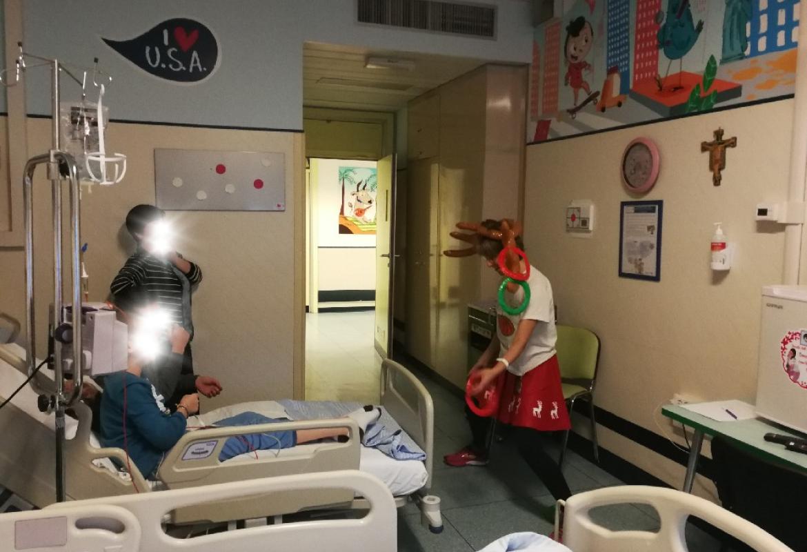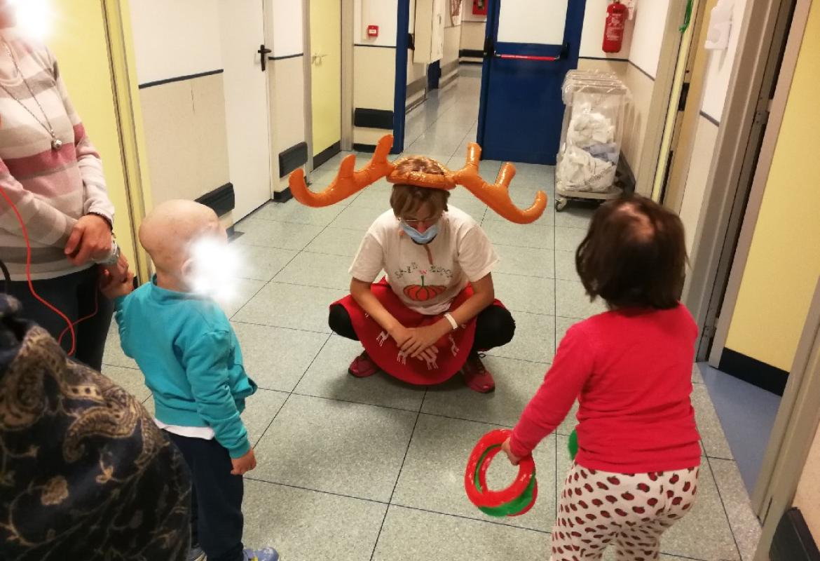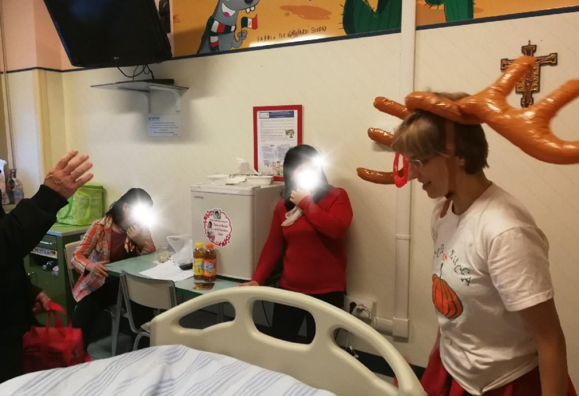 Poi la Renna si è aggirata per stanze e corridoio tra risate di medici e infermieri che non hanno resistito e anche loro hanno lanciato i cerchietti per cercare di infilare le corna della Renna. Ma la renna dispettosa e indisciplinata si muoveva troppo (diciamo così, e non che nessuno aveva una mira decente!)