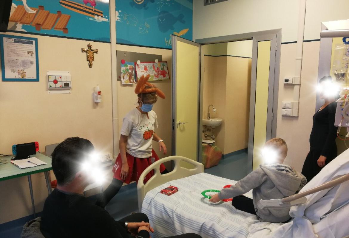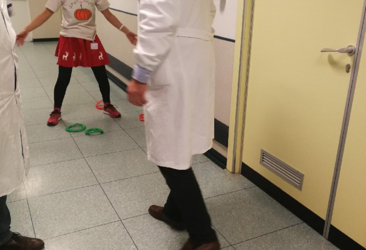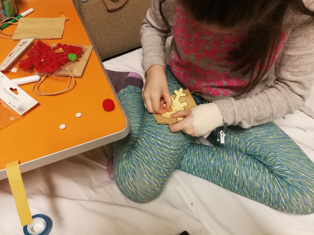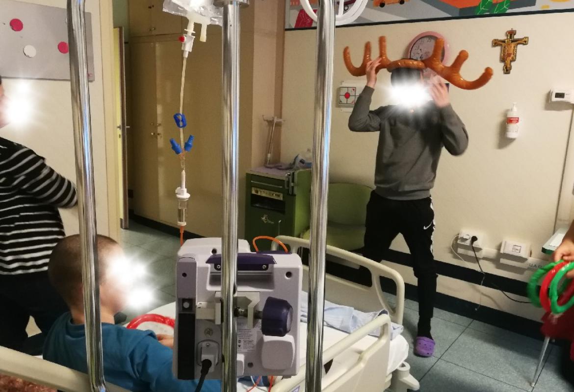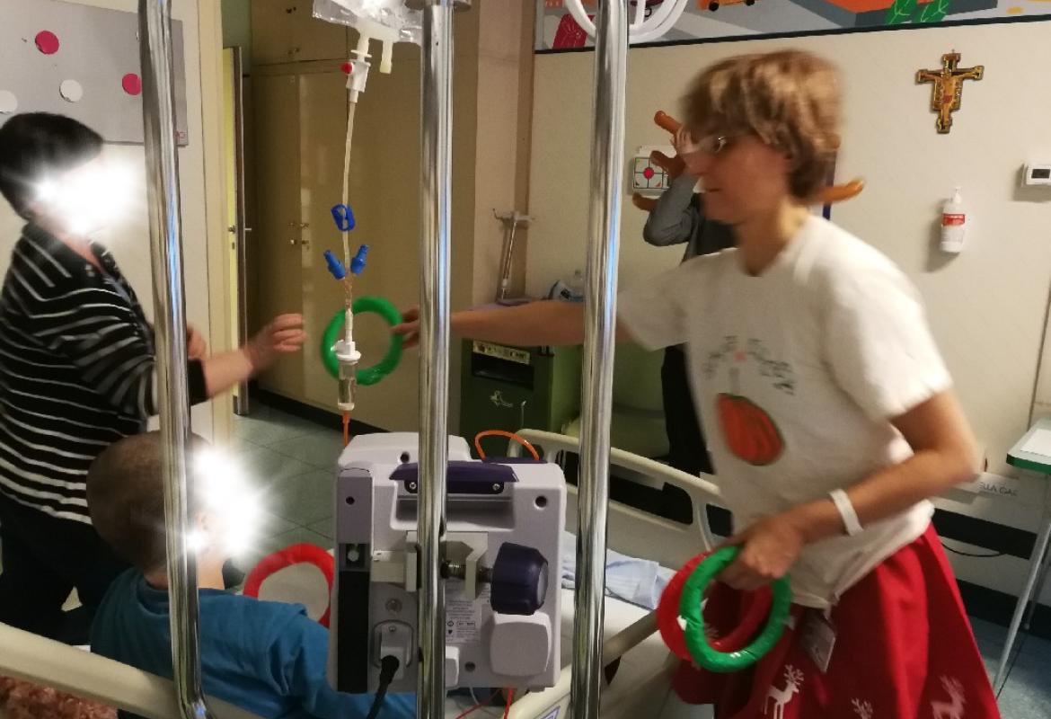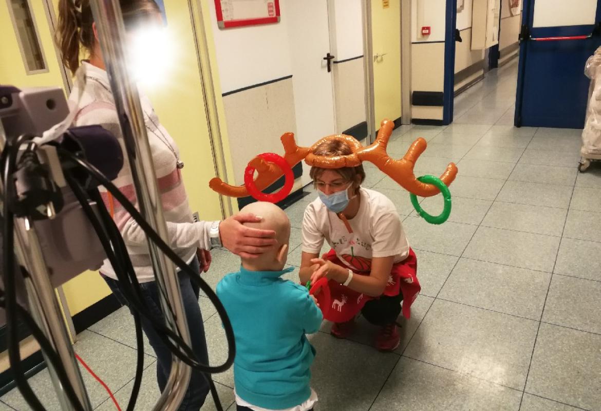 Poi la Renna si è aggirata per stanze e corridoio tra risate di medici e infermieri che non hanno resistito e anche loro hanno lanciato i cerchietti per cercare di infilare le corna della Renna. Ma la renna dispettosa e indisciplinata si muoveva troppo (diciamo così, e non che nessuno aveva una mira decente!)