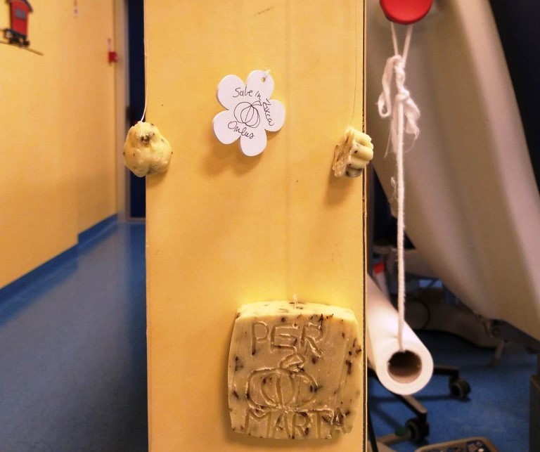 Sabato scorso ci siamo divertiti facendo il sapone tutti, in reparto. Abbiamo creato e confezionato i saponi prodotti dal nostro Alessandro; sono stati donati ai bambini e agli infermieri del reparto di ematologia pediatrica del Policlinico Umberto I.