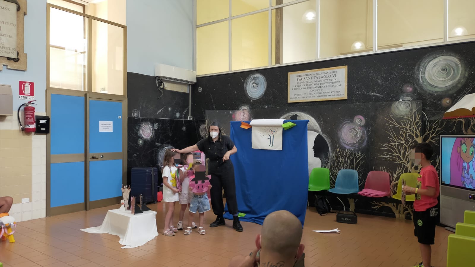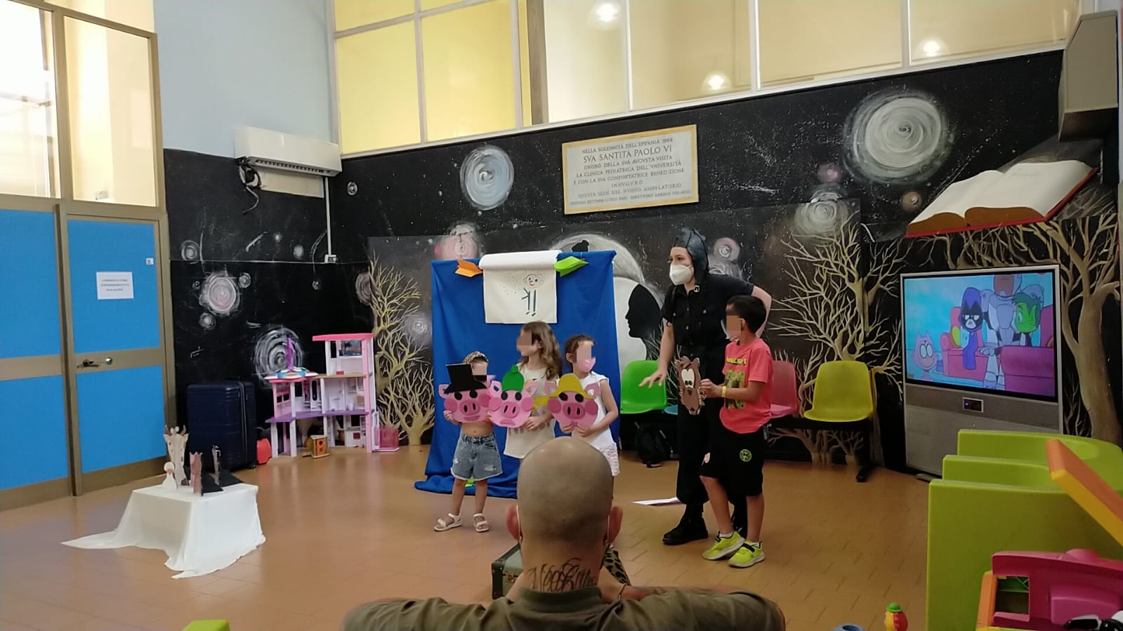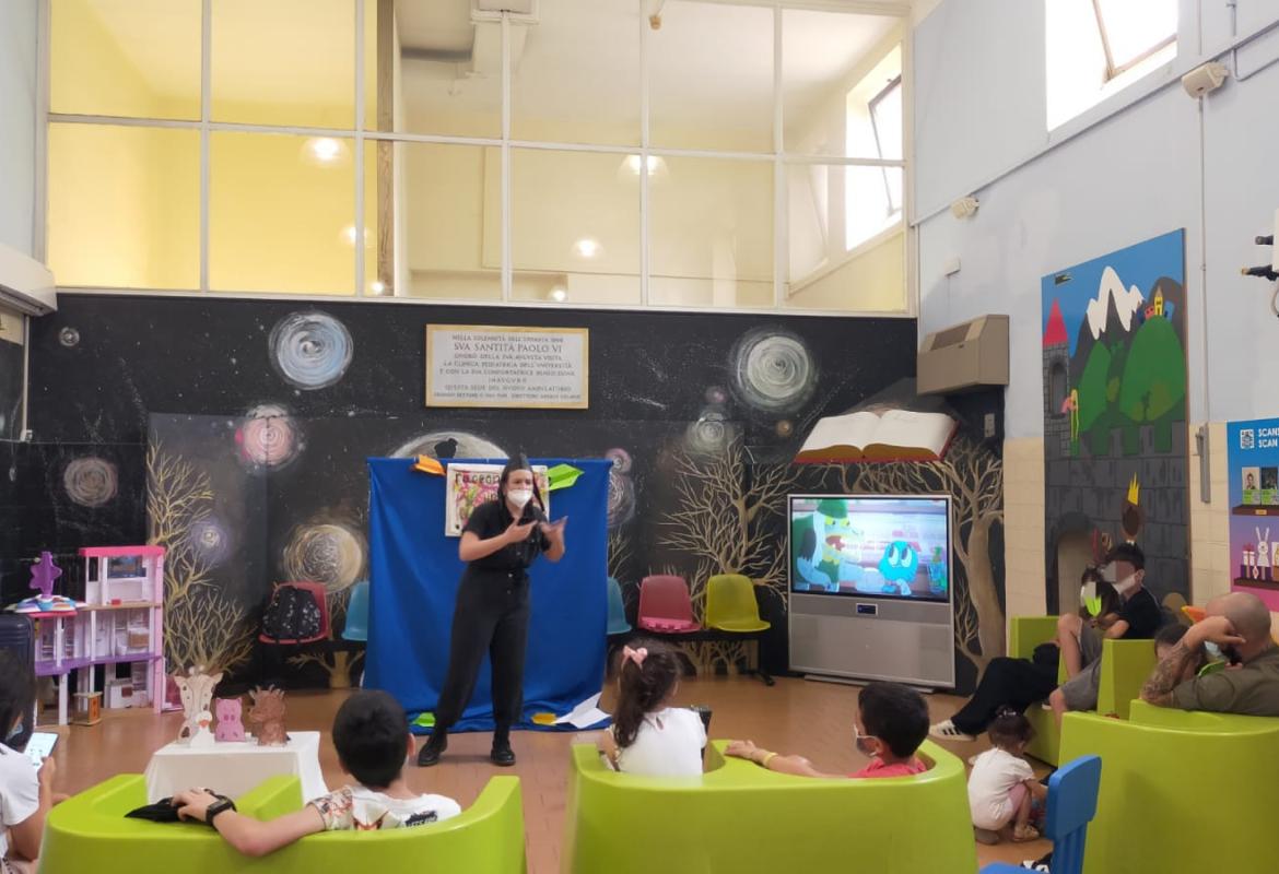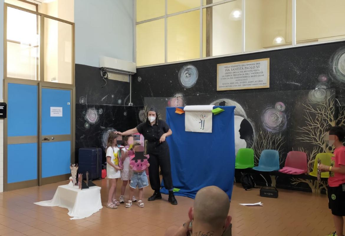 Oggi al day hospital della clinica Pediatrica dell'Umberto I si è concluso lo spettacolo della nostra volontaria Corinna. La sala di attesa si è animata con le storie raccontate da Corinna e dai bimbi. Tra aereoplanini di carta e burattini hanno preso vita molti personaggi come la signora oca, il signor maiale e il signor lupo, che cercava un amico per cucinare la sua zuppa di sasso, ed anche una Cappuccetto un po' particolare, che a forza di cantare, o meglio urlare a squarciagola, ha addirittura fatto scappare la strega cattiva. Alla fine, i bimbi hanno raccontato la storia del signor puntino, e lo spettacolo si è concluso con grandi sorrisi da parte di tutti.