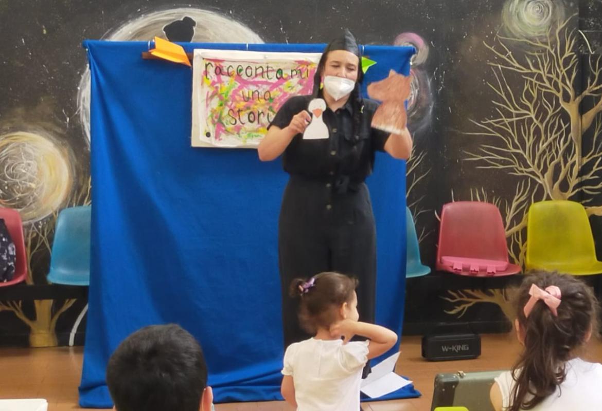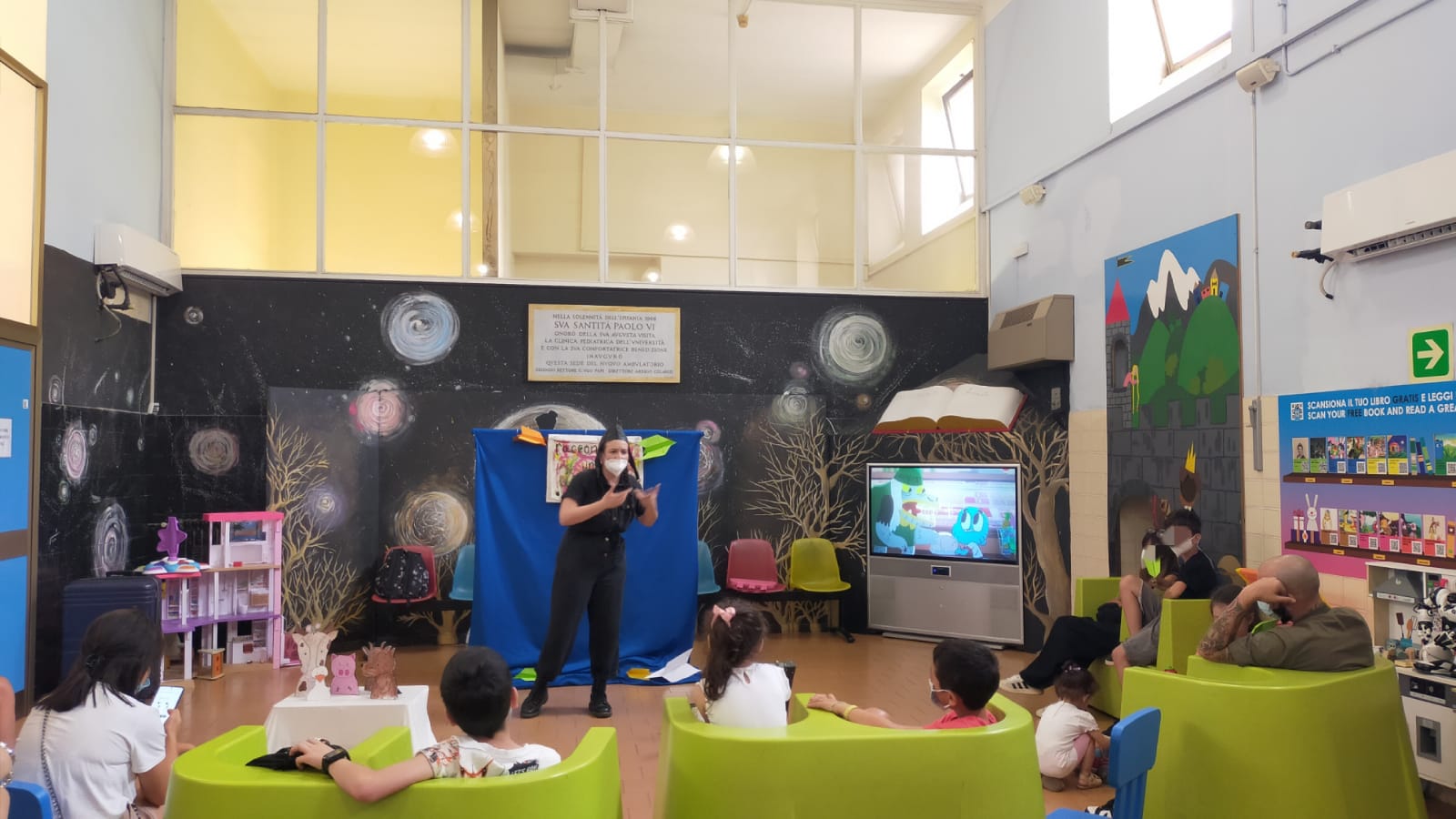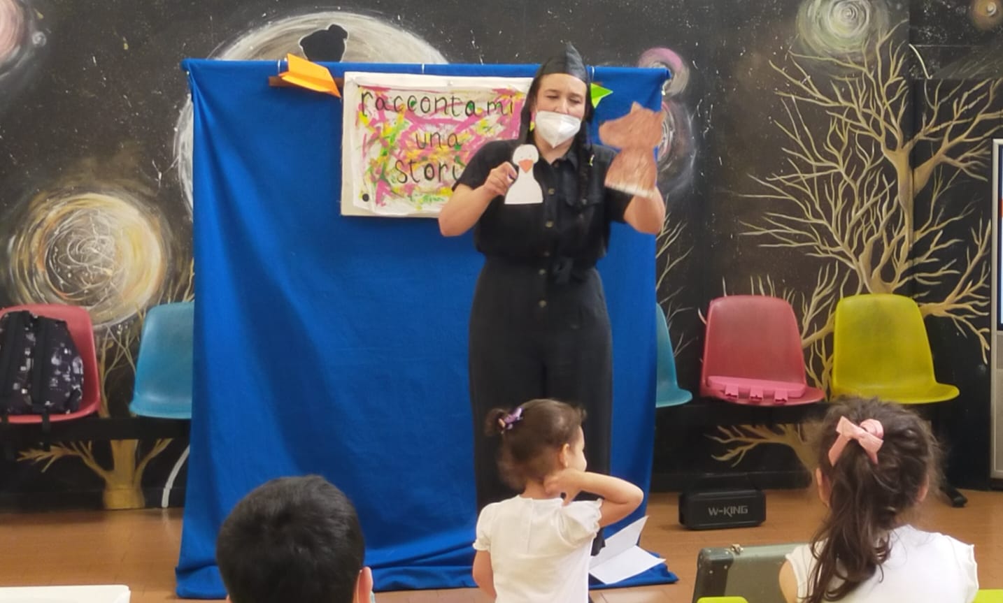 Oggi al day hospital della clinica Pediatrica dell'Umberto I si è concluso lo spettacolo della nostra volontaria Corinna. La sala di attesa si è animata con le storie raccontate da Corinna e dai bimbi. Tra aereoplanini di carta e burattini hanno preso vita molti personaggi come la signora oca, il signor maiale e il signor lupo, che cercava un amico per cucinare la sua zuppa di sasso, ed anche una Cappuccetto un po' particolare, che a forza di cantare, o meglio urlare a squarciagola, ha addirittura fatto scappare la strega cattiva. Alla fine, i bimbi hanno raccontato la storia del signor puntino, e lo spettacolo si è concluso con grandi sorrisi da parte di tutti.
