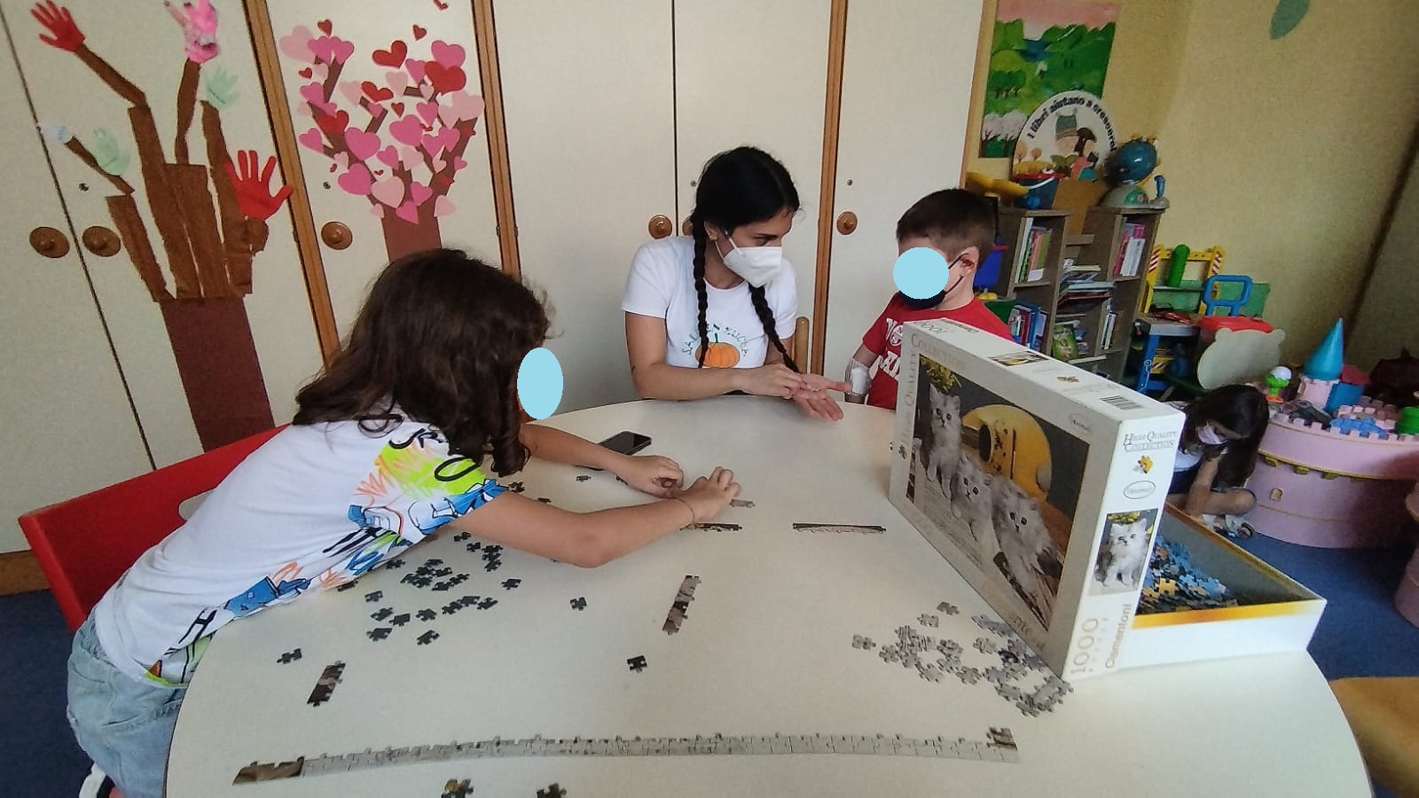 Oggi abbiamo incontrato bambine e bambini simpaticissimi al Day Hospital di Ematologia del Policlinico Umberto I. Insieme a M., E. e G. abbiamo giocato a memory, con G. e I. abbiamo provato a comporre un puzzle da mille pezzi, abbiamo attaccato nuove impronte sul nostro adorato albero… e infine ci siamo divertiti a riempire un album di adesivi tra animaletti curiosi e simpatici disegni!