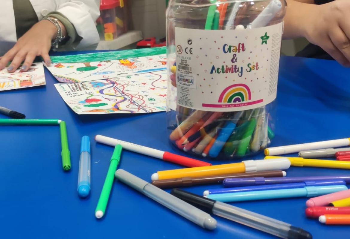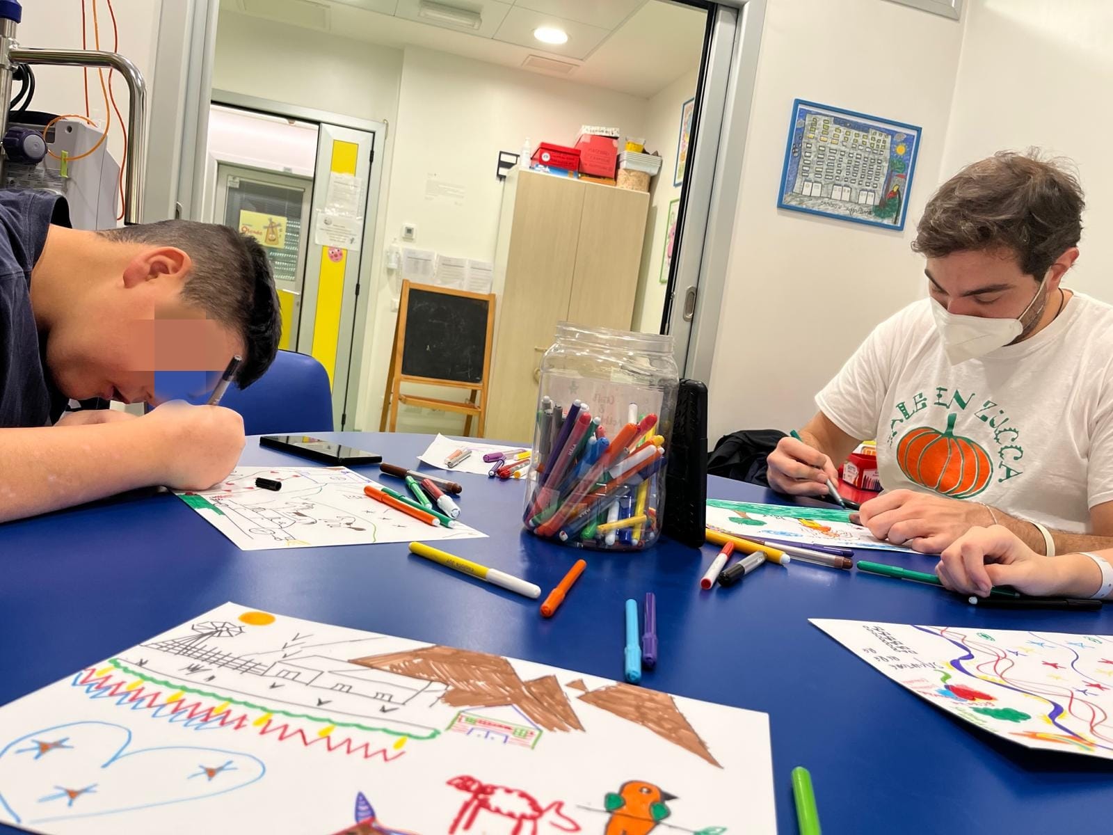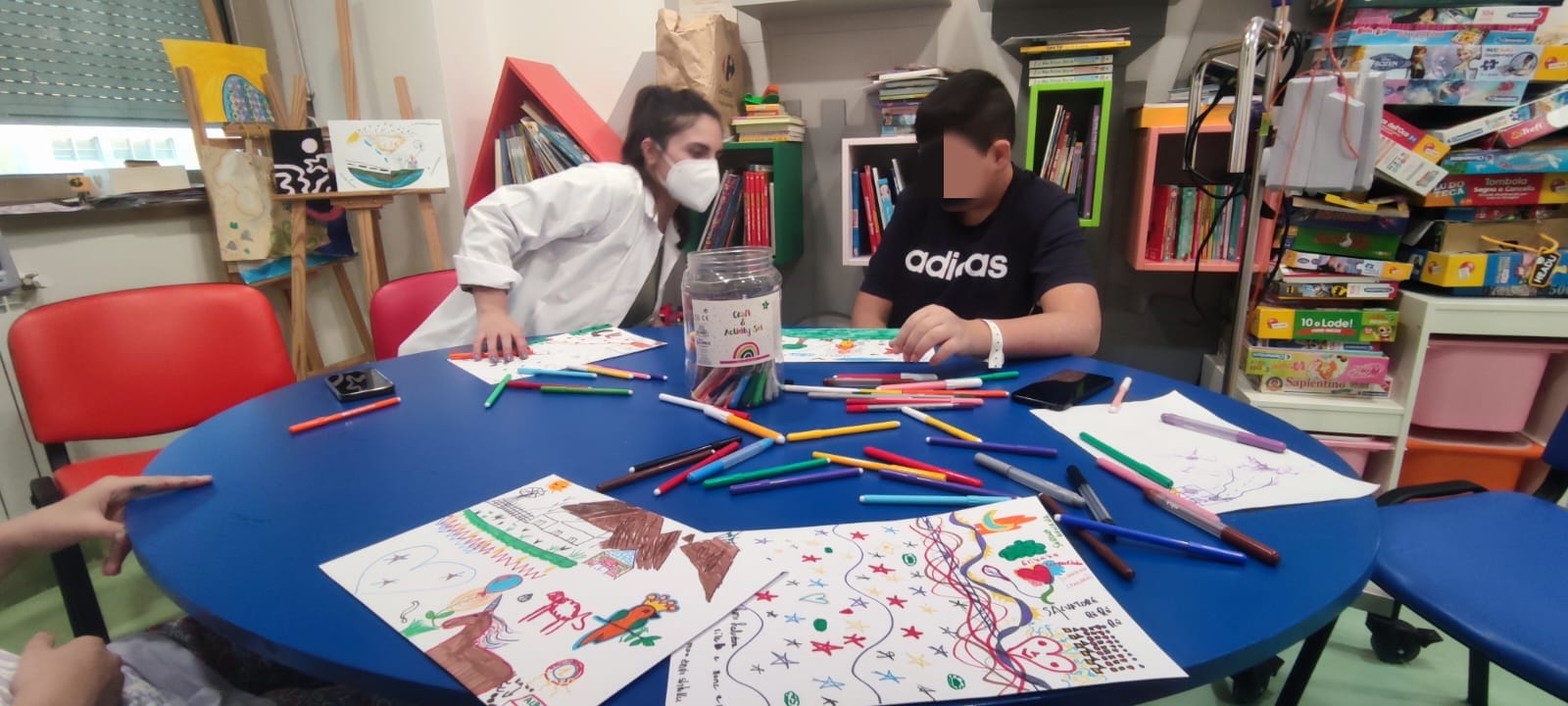Pomeriggio artistico oggi al reparto di oncologia pediatrica del gemelli: I. , E. e B. si sono cimentate con il disegno! Tra maschere preparative per carnevale, disegni in cooperazione e piogge di brillantini, le risate di certo non sono mancate. Al termine della sessione artistica, la nostra Erika ha intrattenuto tutti fornendoci degli strumenti musicali: a quel punto la nostra "orchestra" si è sbizzarrita improvvisando sulle note di canzoni che ognuno sceglieva a turno! Il ritmo era così coinvolgente, che abbiamo catturato anche le mamme e i papà!
