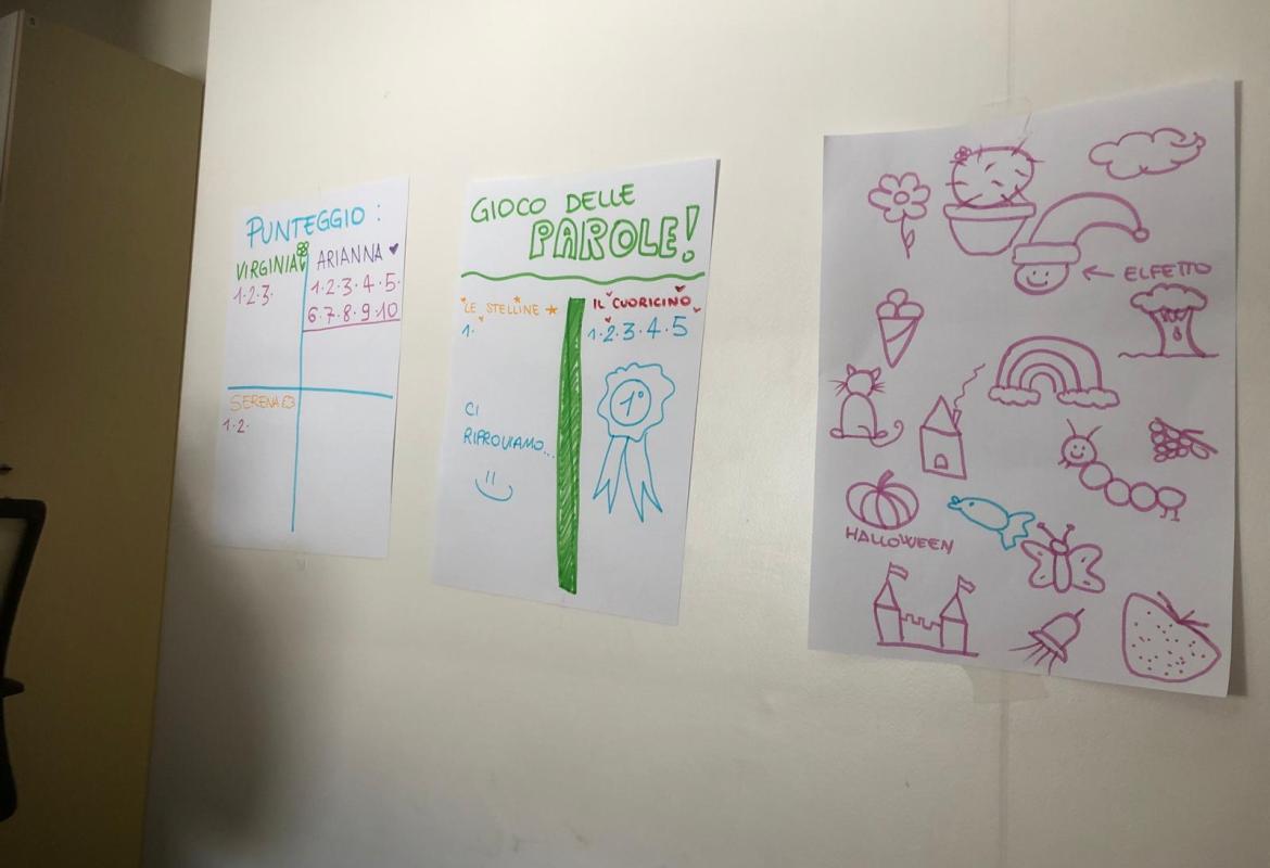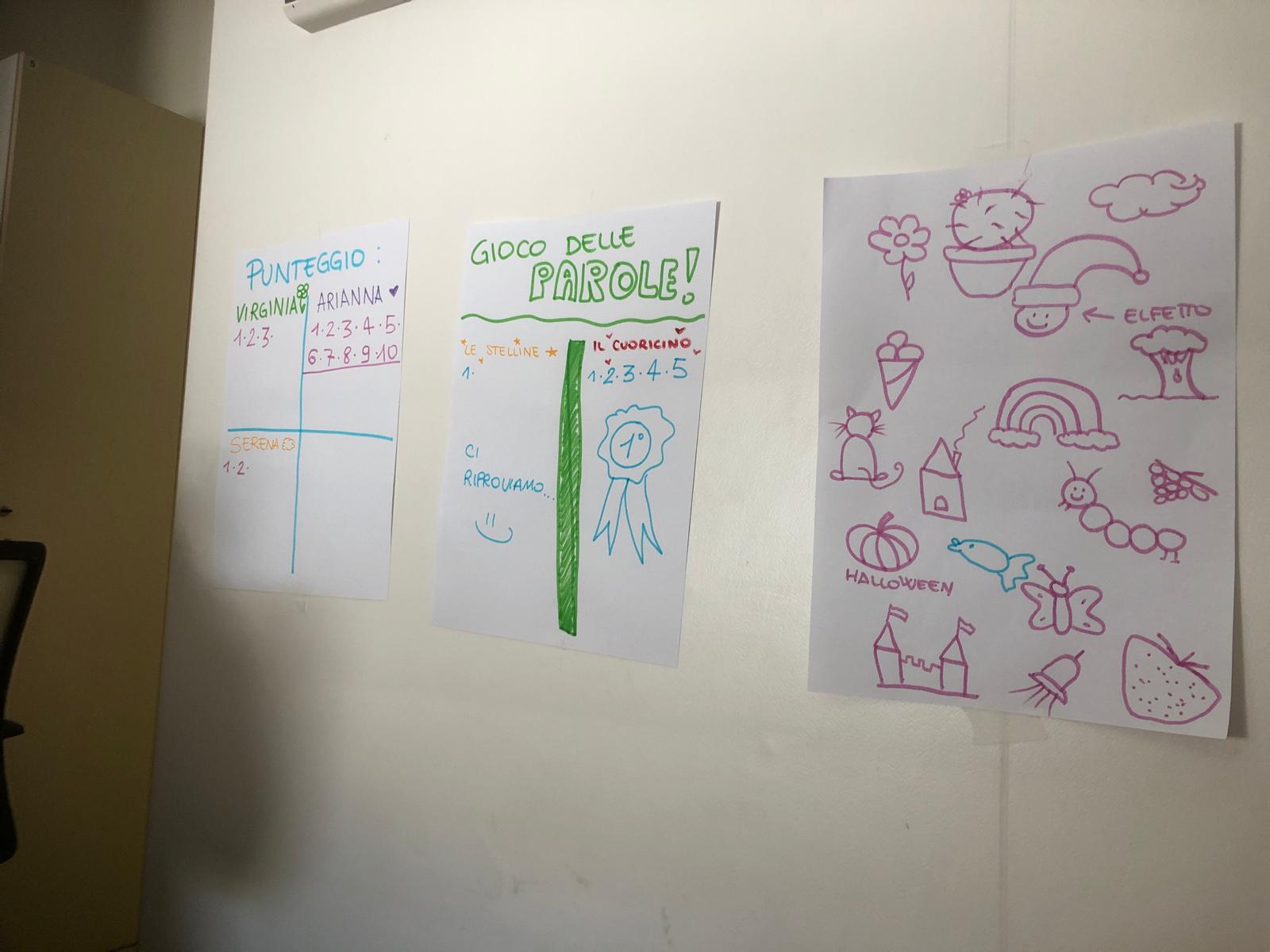 Hanno conosciuto la piccola A., con la quale hanno giocato a “indovina il disegno” e poi a “indovina la parola”. Hanno coinvolto anche la piccolissima M. e la sua mamma nei giochi, creando un clima di complicità tra di loro.