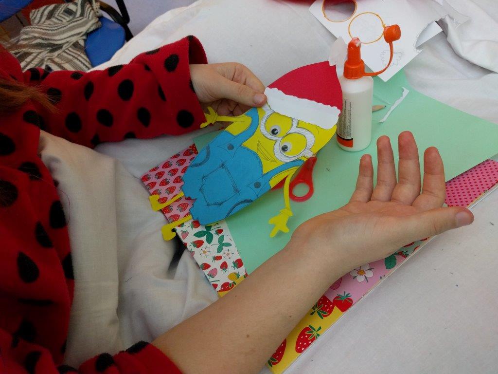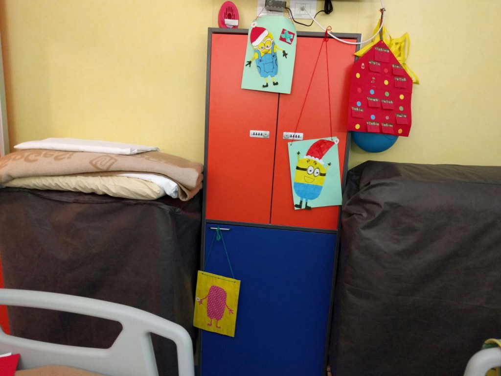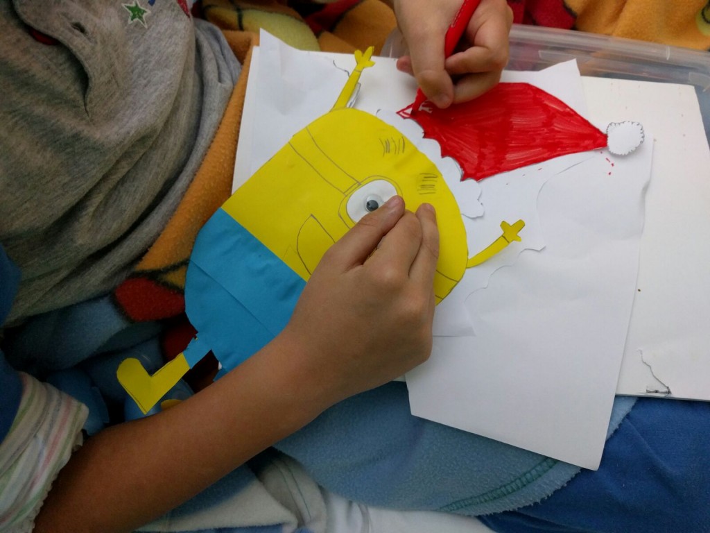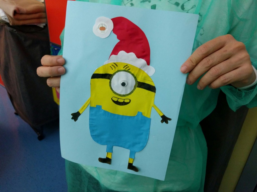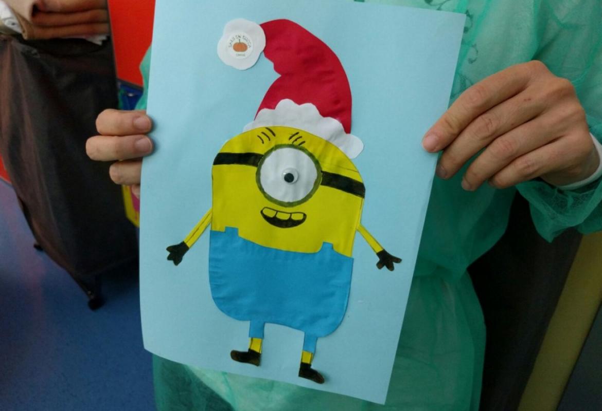 Mancano solo dieci giorni al santo Natale quando incontriamo nel reparto di Ematologia Pediatrica del Policlinico Umberto I un bambino e una ragazzina che guardano il film dei Minions. Nelle lor condizioni, guardare un film rilassante è l'attività più indicata, perchè non si possono alzare. Fino all'arrivo delle ludoterapiste! Facile pensare ad una proposta: costruire un Babbo Minion per un Giallo Natale!
