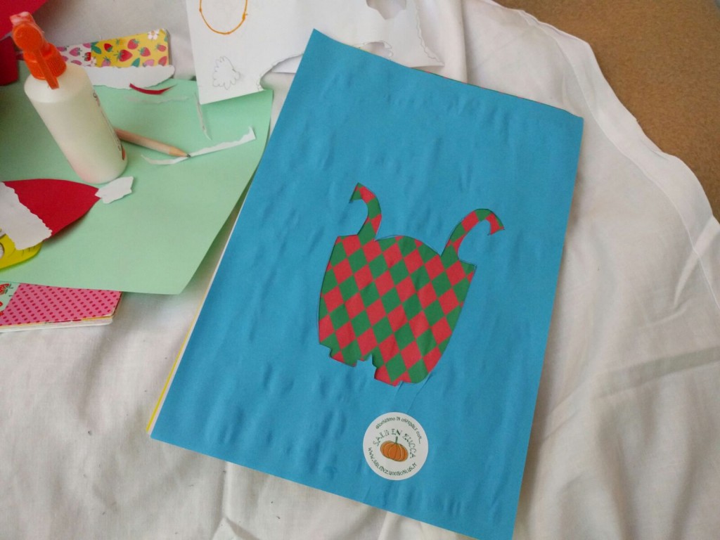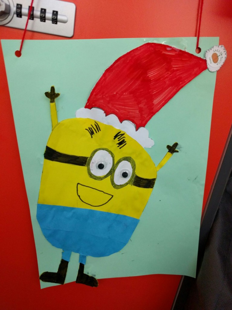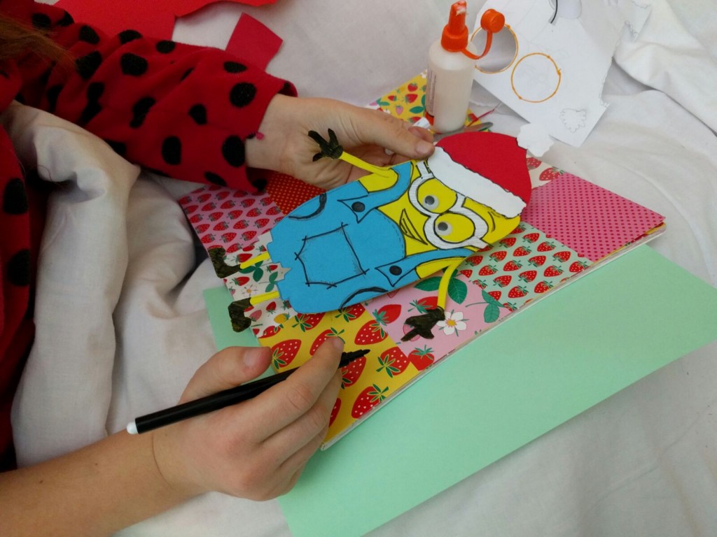 Sollevando il letto possono disegnare i diversi pezzi da assemblare senza sforzare la schiena, mentre il cartone animato è rimasto di sottofondo come ispirazione. Il corpo giallo, la salopette di jeans, grandi occhi ed ecco a voi...Babbo Minion per un giallo Natale a tutti!