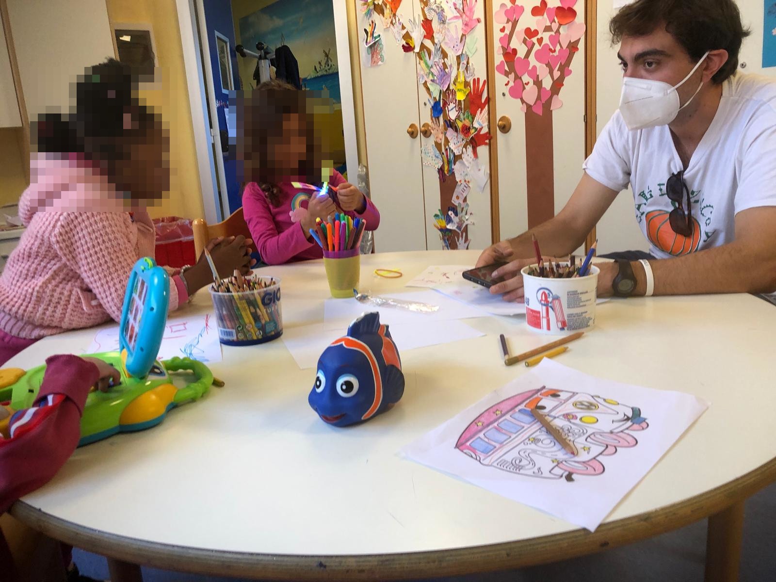 Virginia e Leonardo, in compagnia dei simpaticissimi: E, N, D, G, D e V hanno dapprima giocato tutti assieme col simpatico gioco del Cammello! (tra i preferiti da tutti nel reparto) Poi si sono dilettati in una pazza variante del gioco del mimo e in una serie di disegni a tema oceanico! Una mattinata piena di risate e di colori!