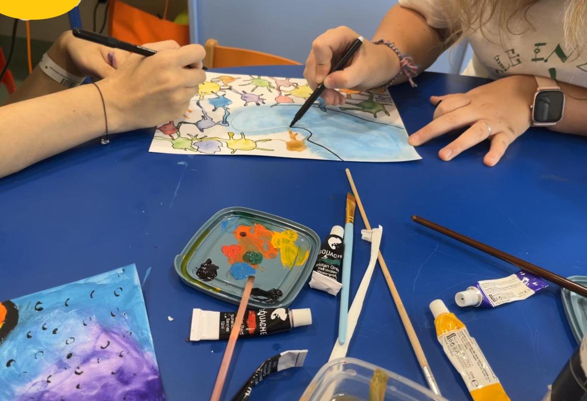 Ieri, nella sala giochi del reparto di Oncologia Pediatrica del Policlinico Agostino Gemelli, Erika, Lucrezia e M. hanno sfogato tutta la loro creatività dipingendo e disegnando tre opere astratte distinte ma legate da una linea sottile.