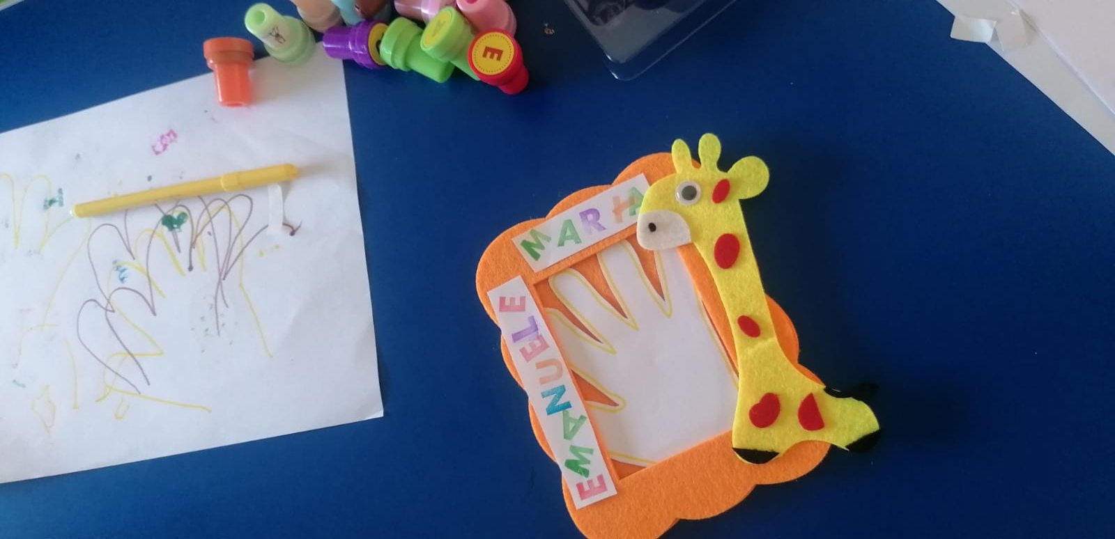 Oggi si è svolta l’attività di ludoterapia ad Oncologia con E., 2 anni. Insieme con Ester ci si è divertiti a disegnare la manina e a creare una cornice con la giraffa. E. dice che la custodirà sul suo comodino