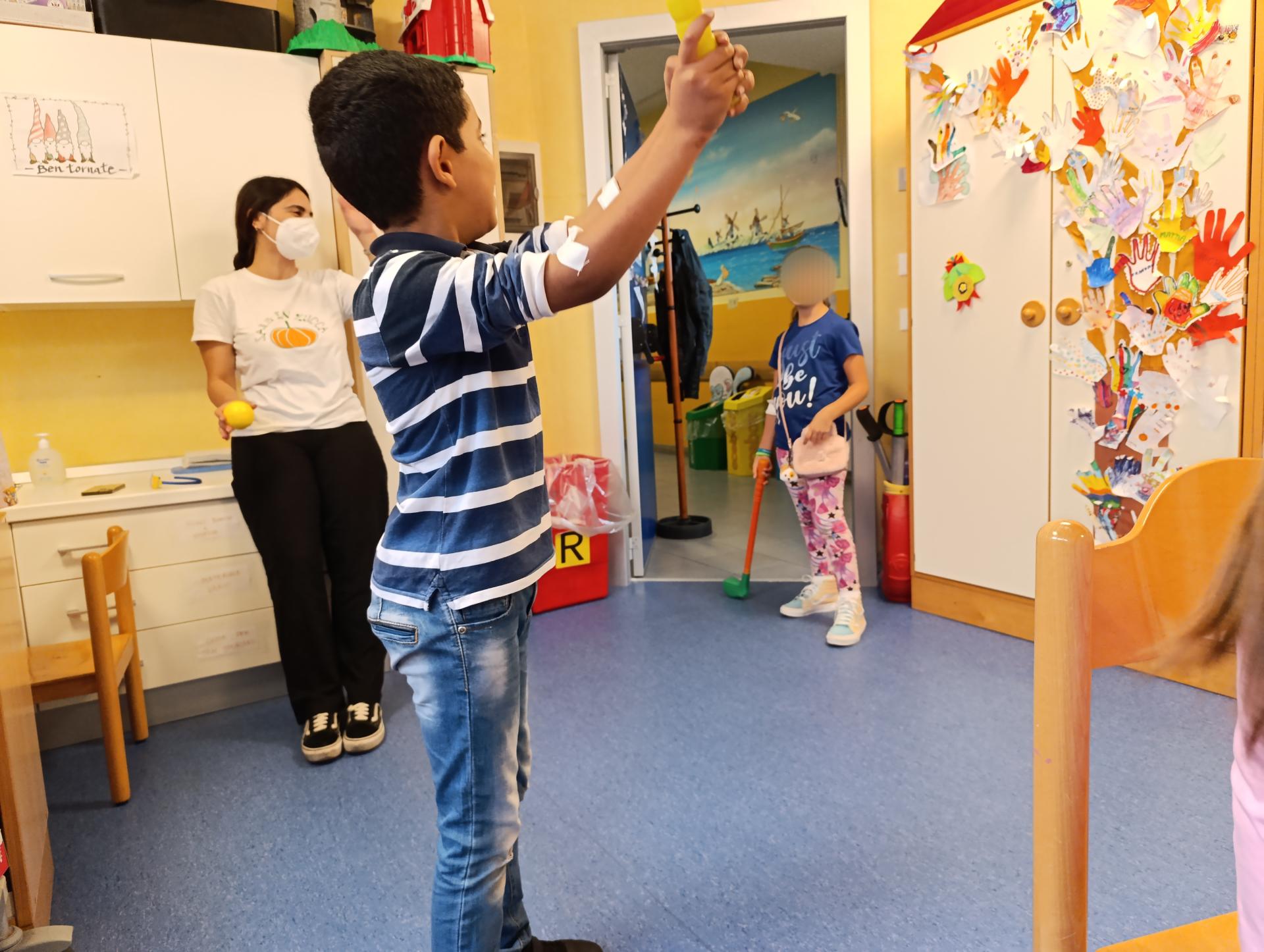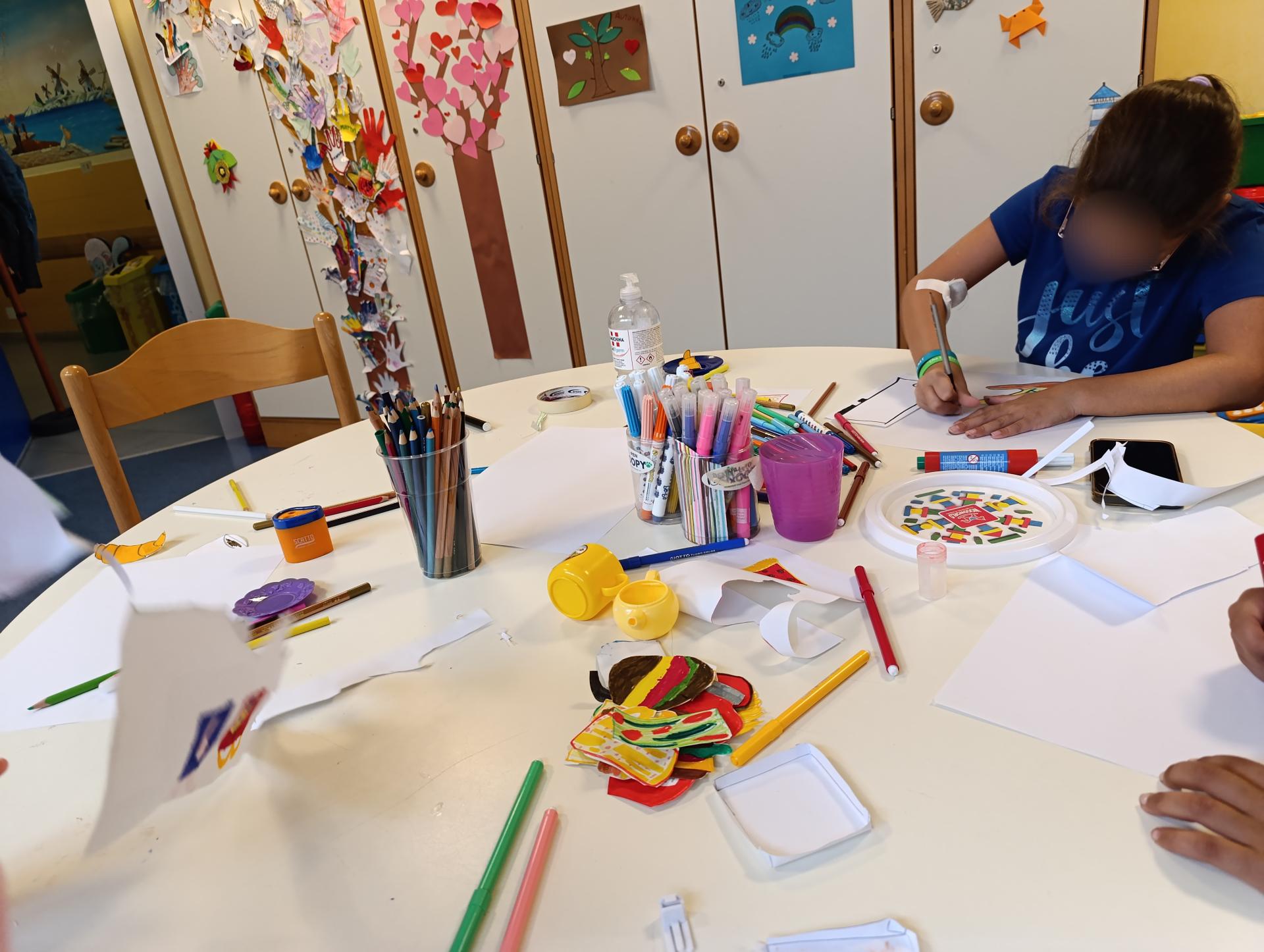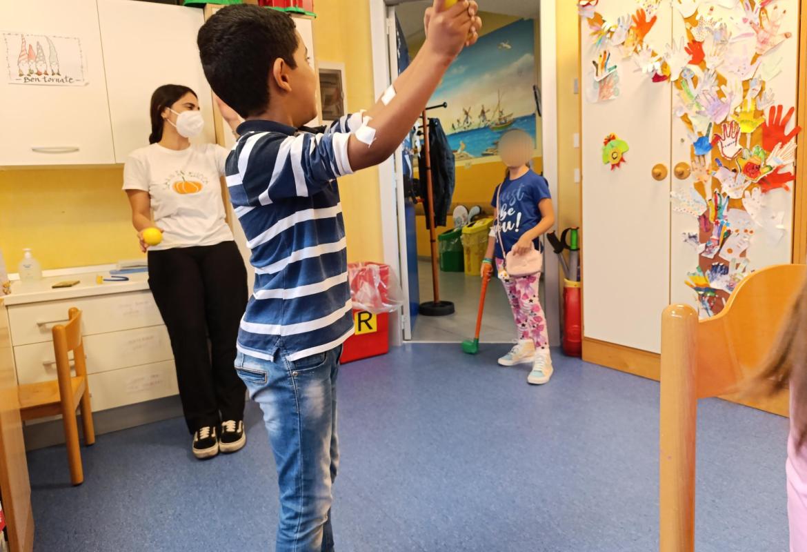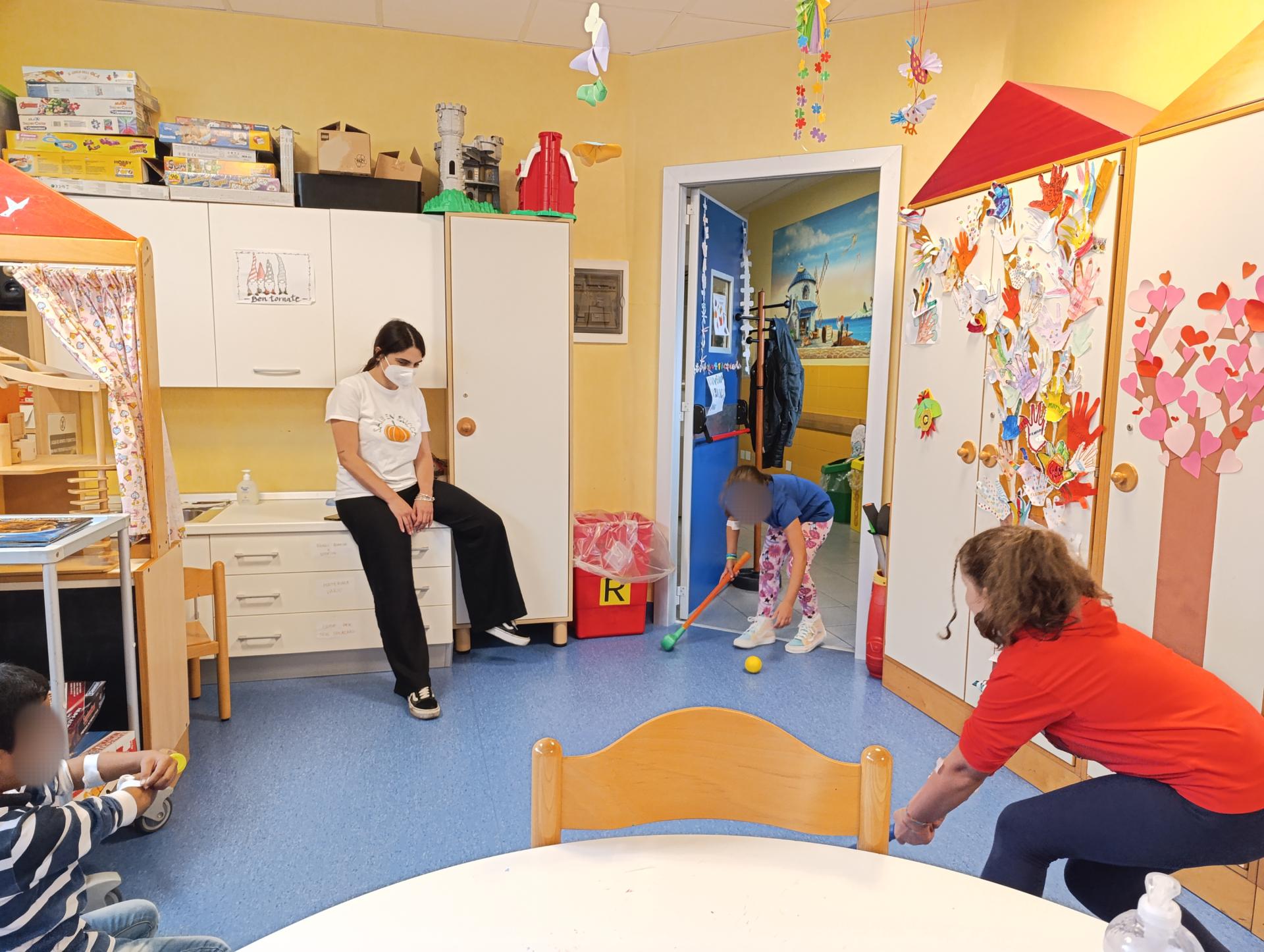 Come sempre, a chi non era mai stato in sala giochi, è stata fatta fare l'impronta della manina da attaccare all'albero delle mani. S. era molto interessata alla cucina,quindi ha chiesto a Nhamhiria di aiutarla a creare con la carta e i colori tante pietanze, soprattutto quelle del McDonald's, attività a cui hanno partecipato anche gli altri bambini poi. E. per un po' si è divertita a giocare con il pesciolino e a fargli fare tante bollicine nel lavandino adibito a vasca da bagno. M. ed E. hanno poi giocato con la pista di macchinine per un po' e dopo si sono sfidati ad una partita di golf rivisitata, a cui poi si è aggiunta anche G., con Lucrezia che faceva da arbitro. M. poi si è anche divertito a giocare con i mattoncini di legno. Tra un'attività e l'altra i bambini si sono raccontati alle nostre operatrici e tra chiacchiere e risate la mattinata è passata in un attimo!
